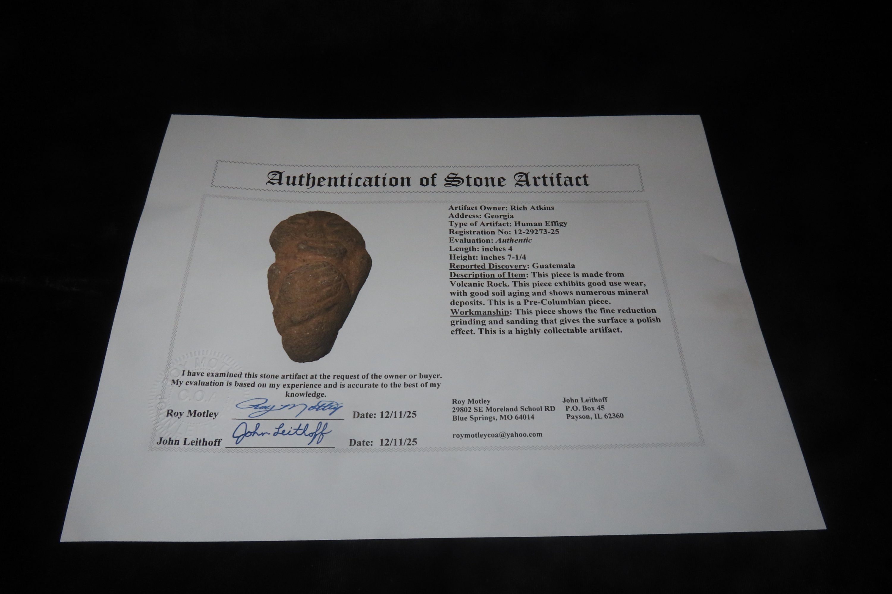 7 1/4″ x 4″ Pre-Columbian Volcanic Rock Human Effigy, Motley COA, from Guatemala, Ex Rich Atkins Collection