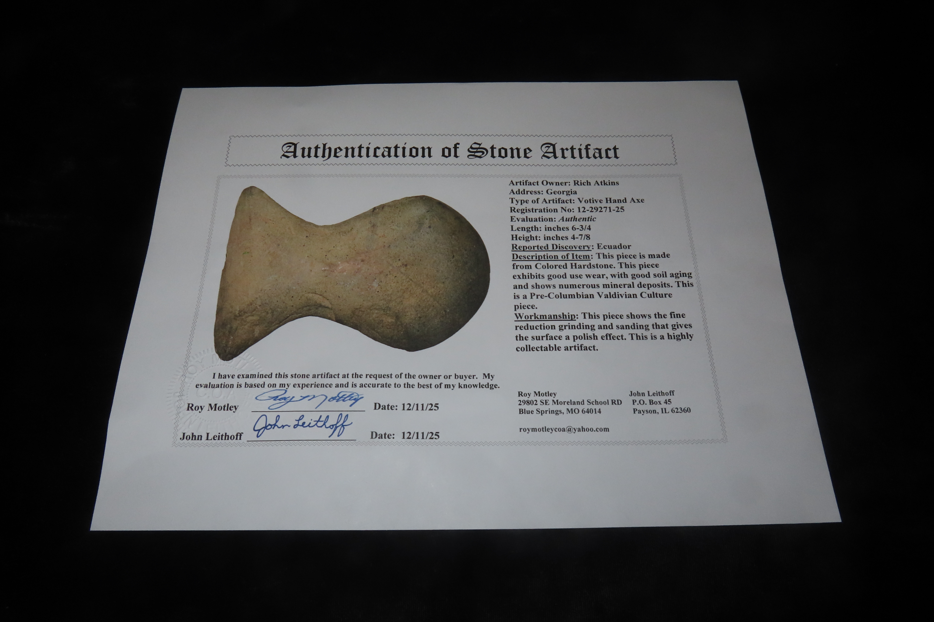 6 3/4″ x 4 7/8″ 6 5/8″ x 7 1/4″ Pre-Columbian Colorful Hardstone Votive(Ceremonial)Hand Axe, Motley COA, from Ecuador, Valdivian Period, Ex Rich Atkins Collection