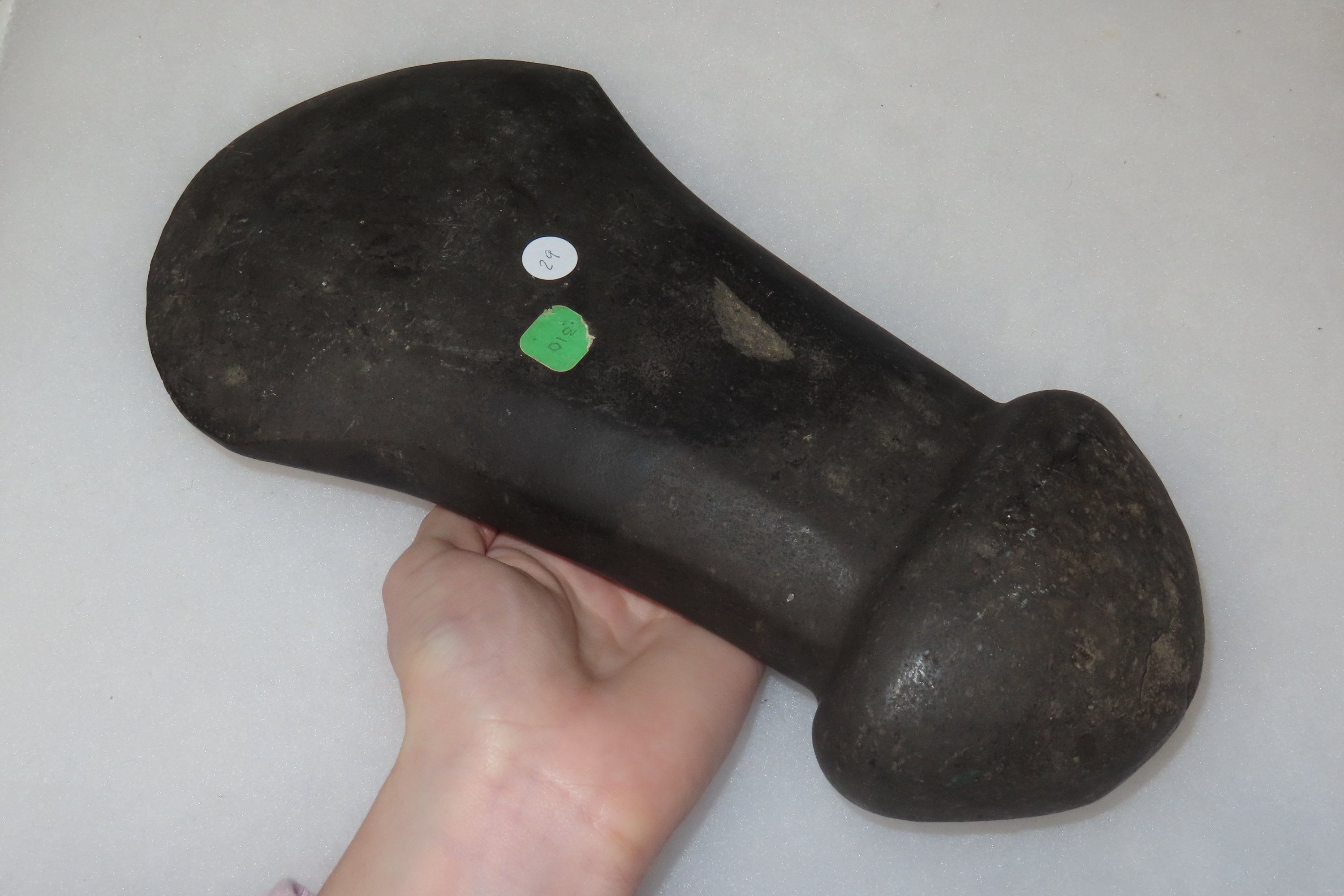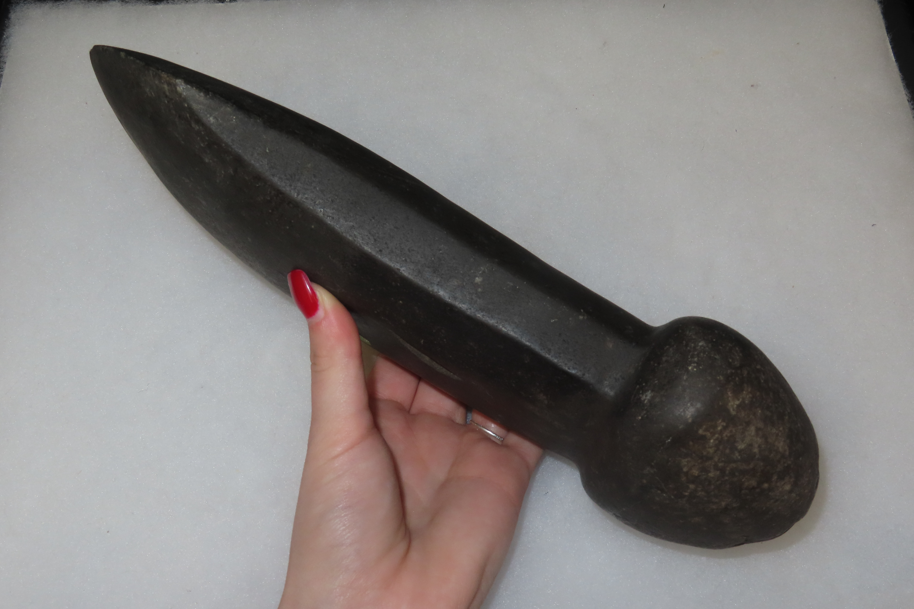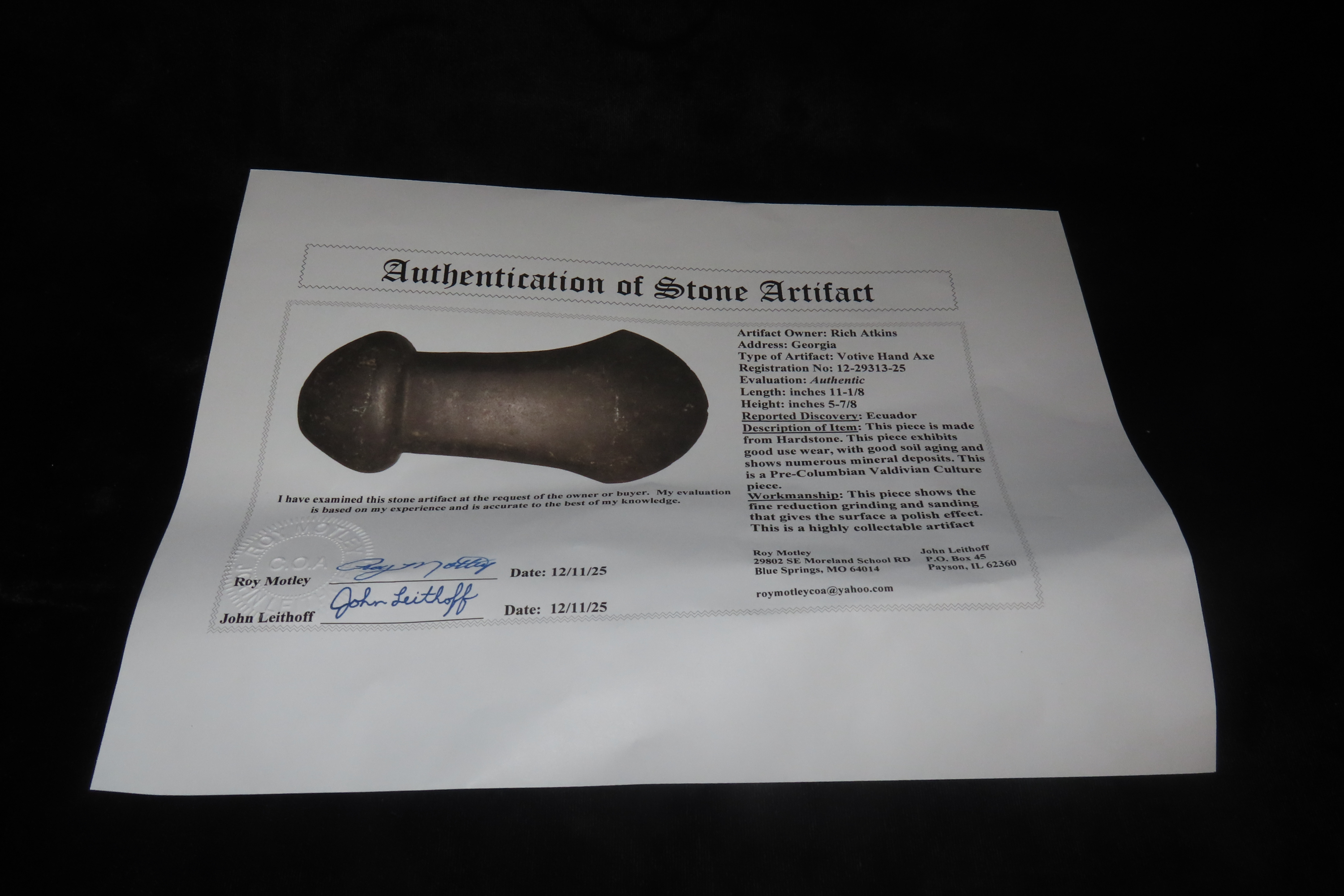 11 1/8″ x 5 7/8″ Pre-Columbian Colorful Hardstone Votive(Ceremonial)Hand Axe, Motley COA, from Ecuador, Valdivian Period, Ex Rich Atkins Collection