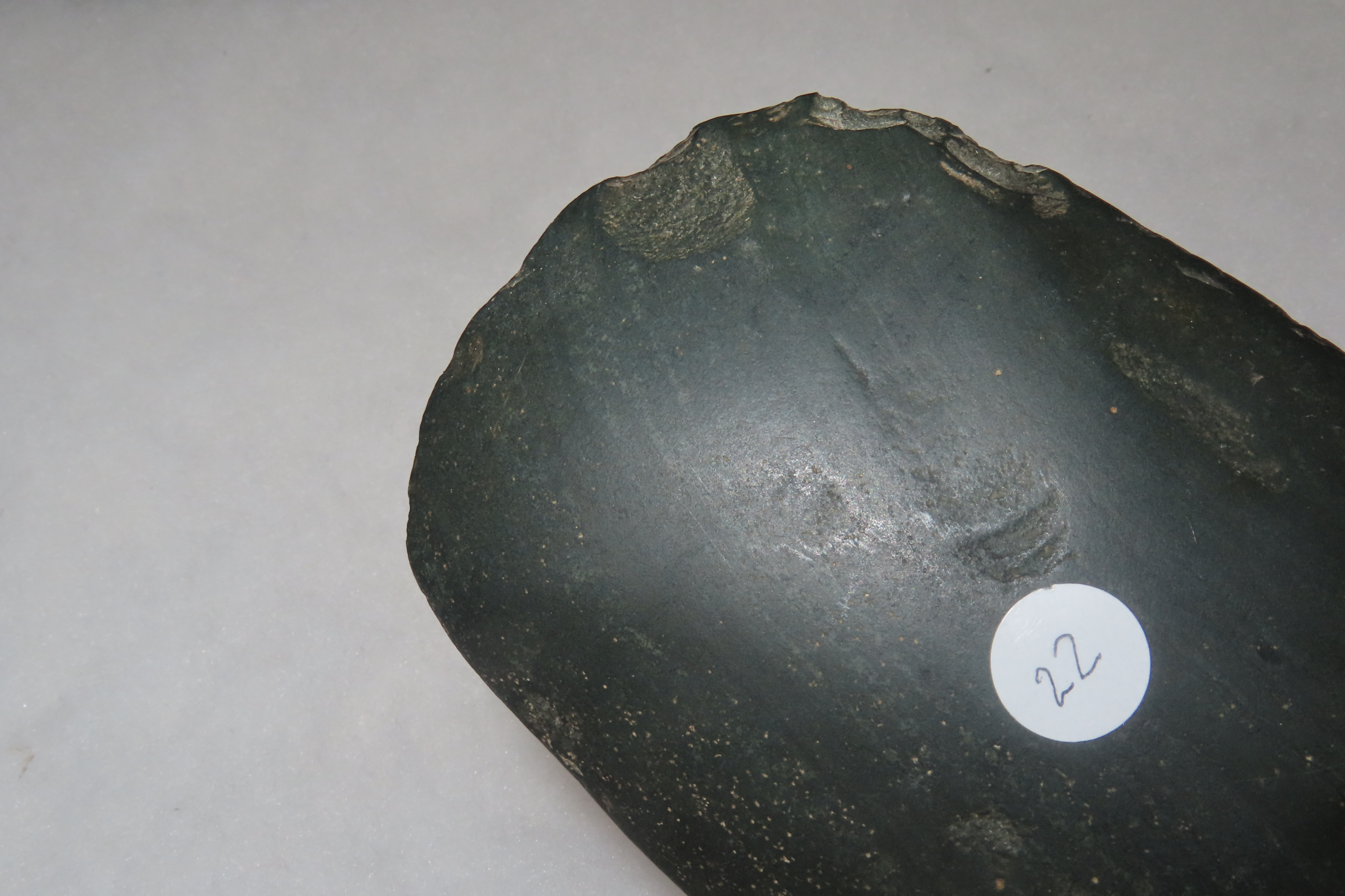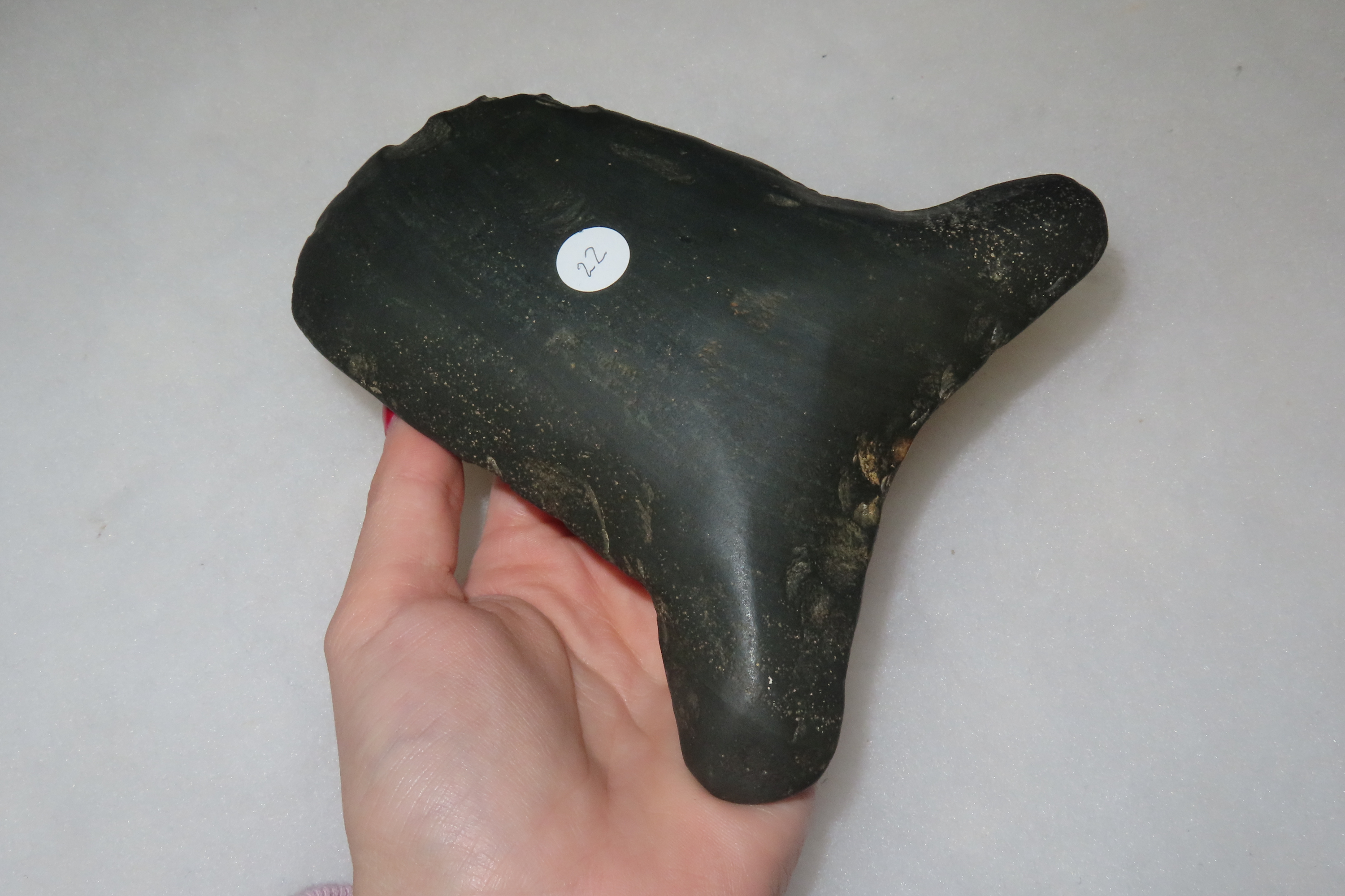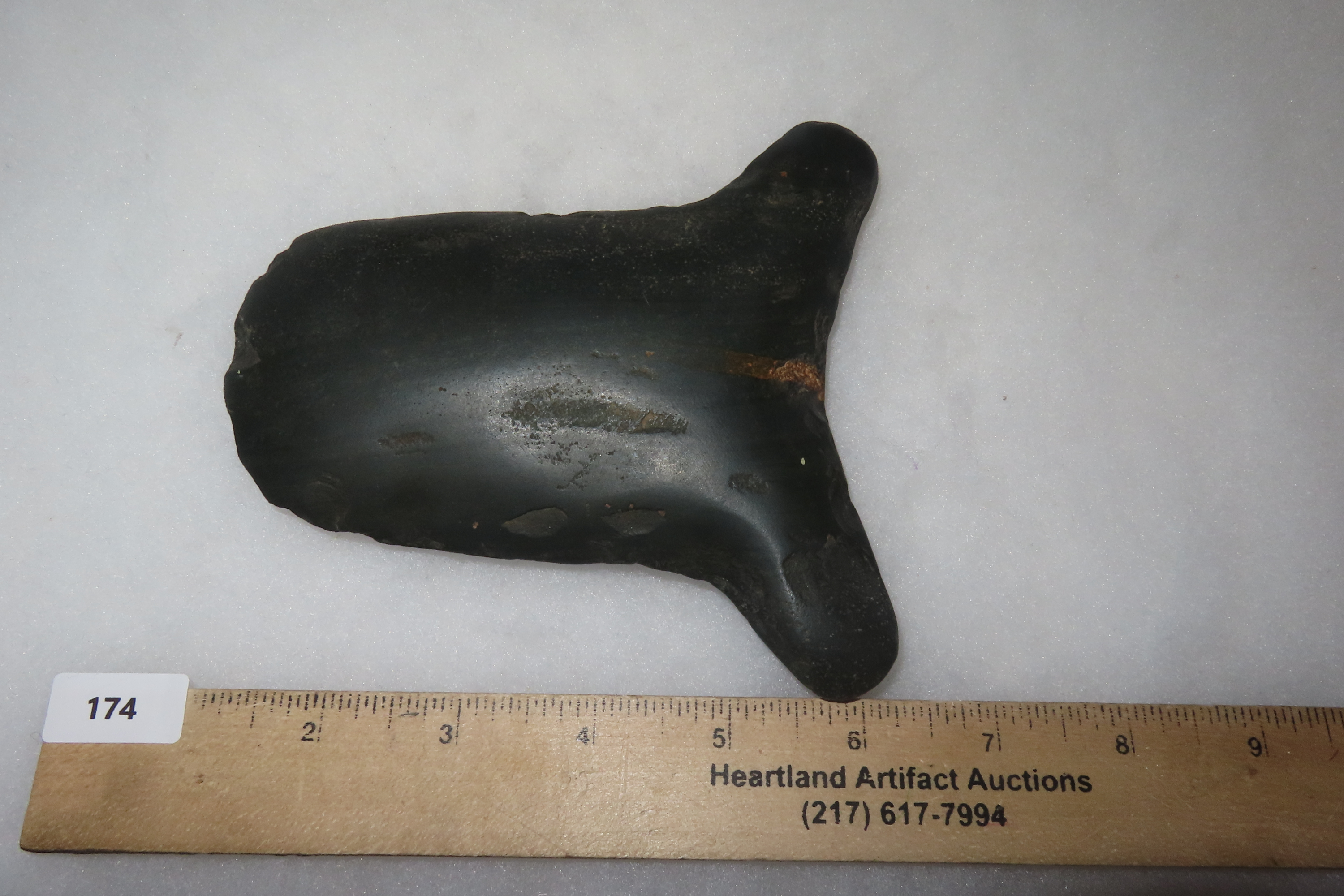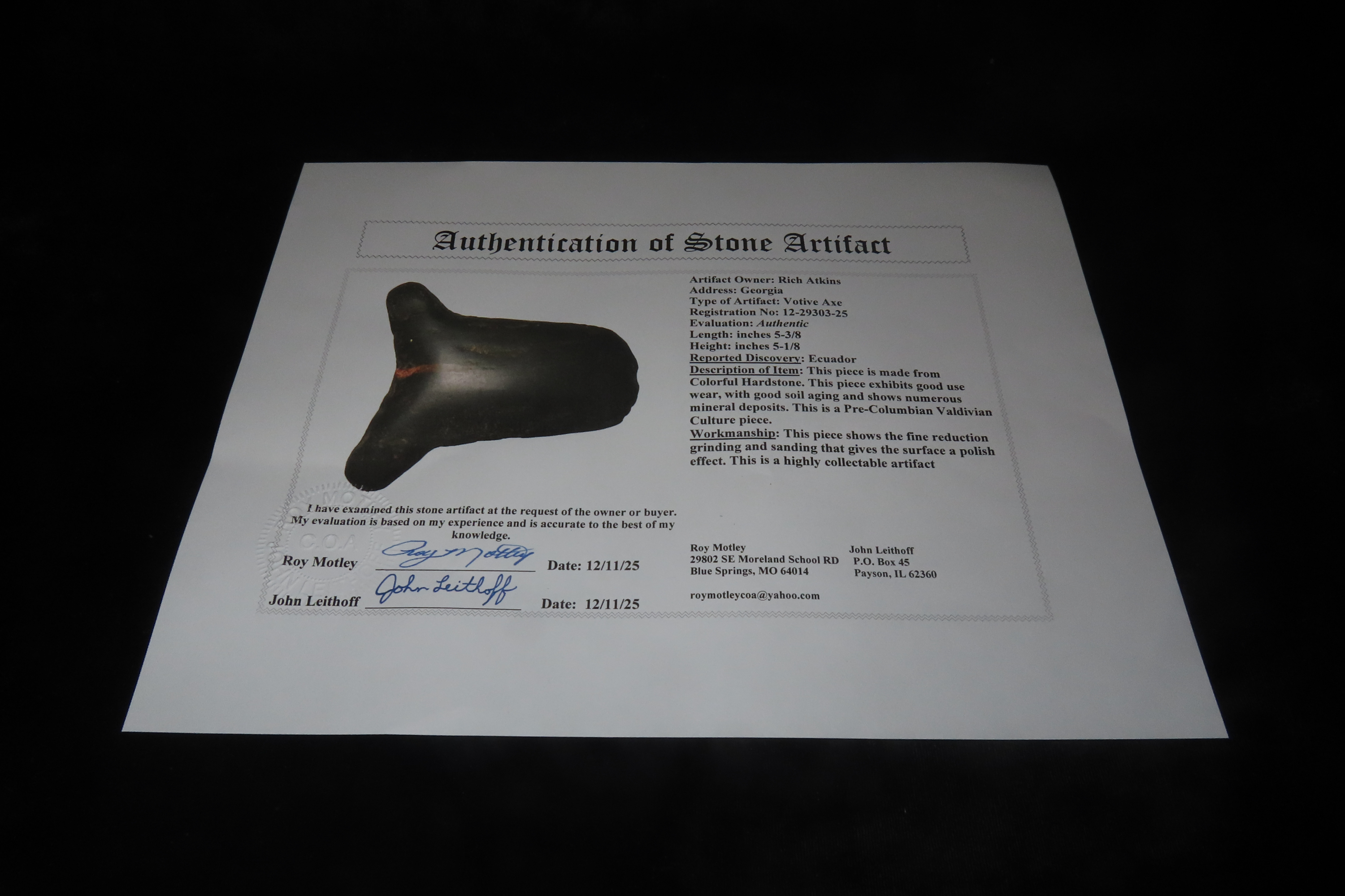 5 3/8″ x 5 1/8″ Pre-Columbian Colorful Hardstone Votive(Ceremonial)Hand Axe, Motley COA, from Ecuador, Valdivian Period, Ex Rich Atkins Collection