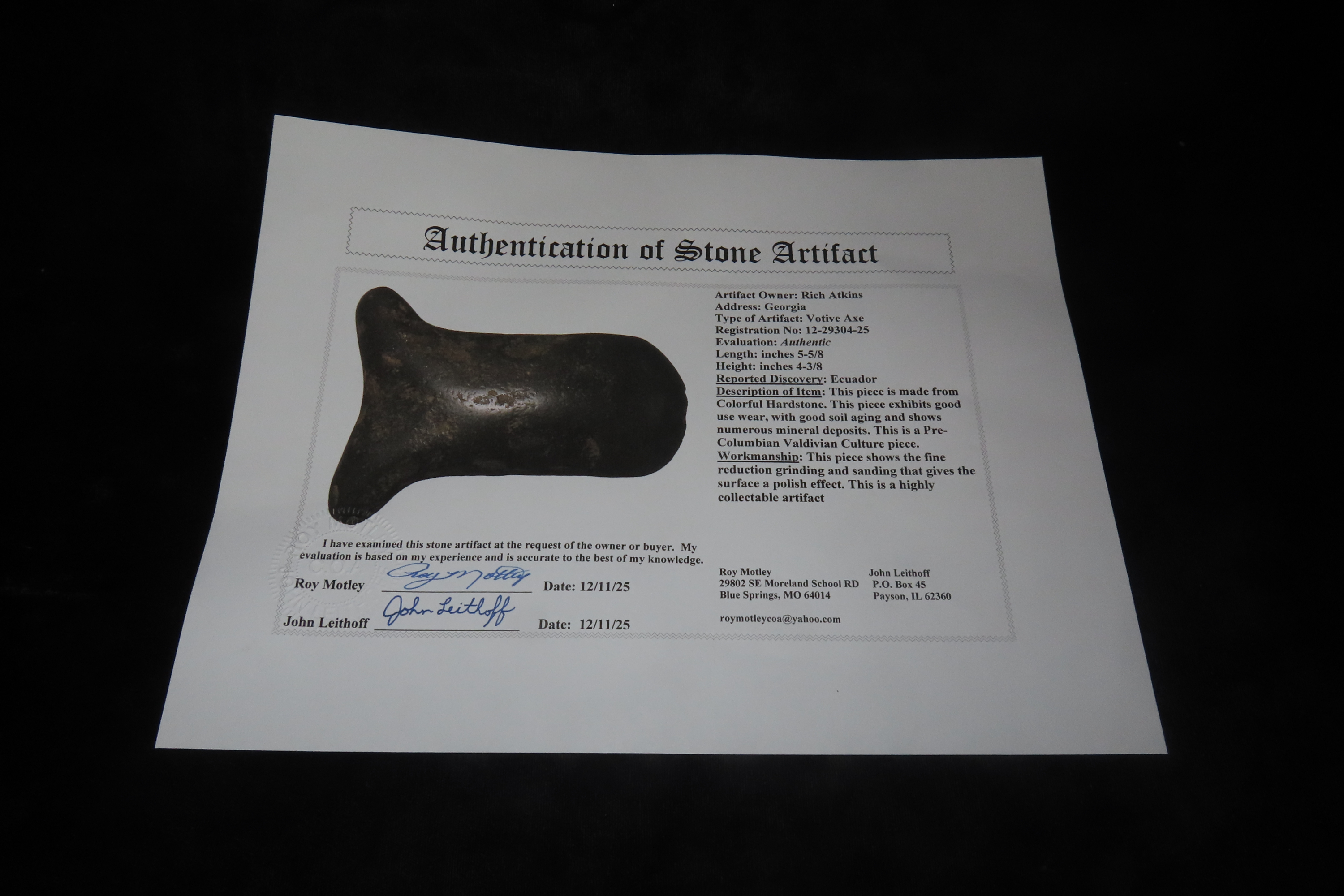 5 5/8″ x 4 3/8″ Pre-Columbian Colorful Hardstone Votive(Ceremonial)Hand Axe, Motley COA, from Ecuador, Valdivian Period, Ex Rich Atkins Collection