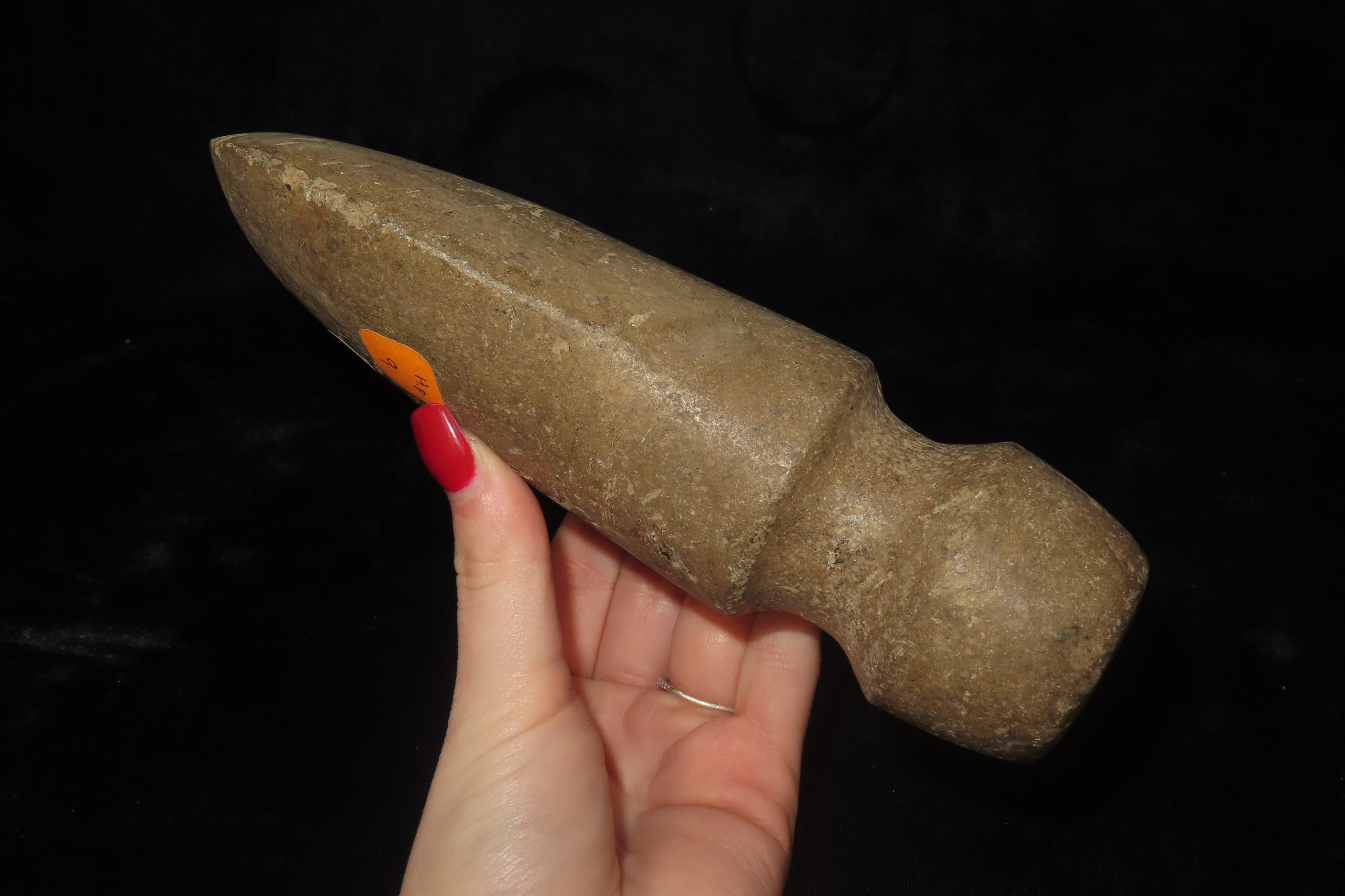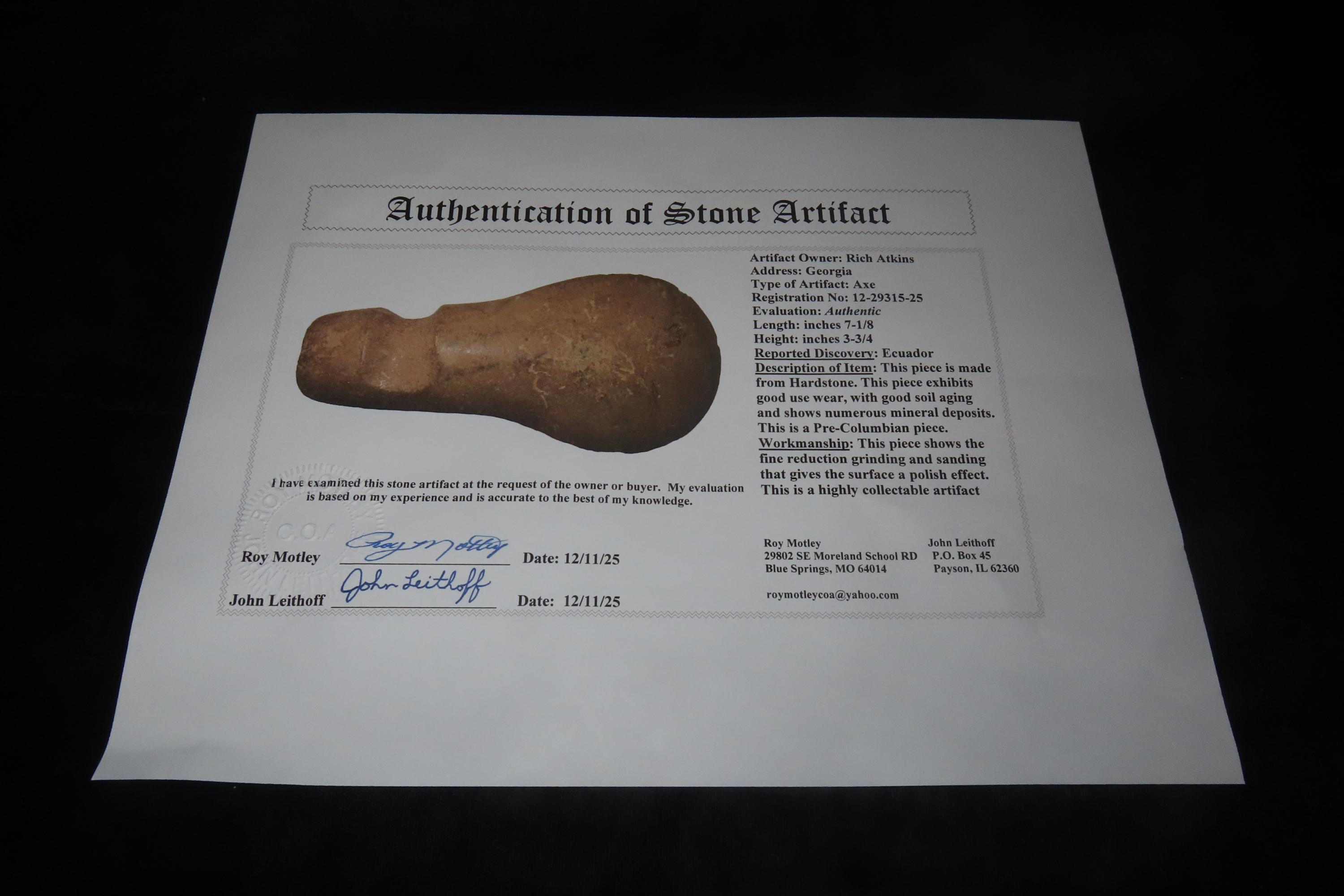 7 1/8″ x 3 3/4″ Pre-Columbian Axe, Motley COA, Made of Hardstone, from Ecuador, Ex Rich Atkins Collection