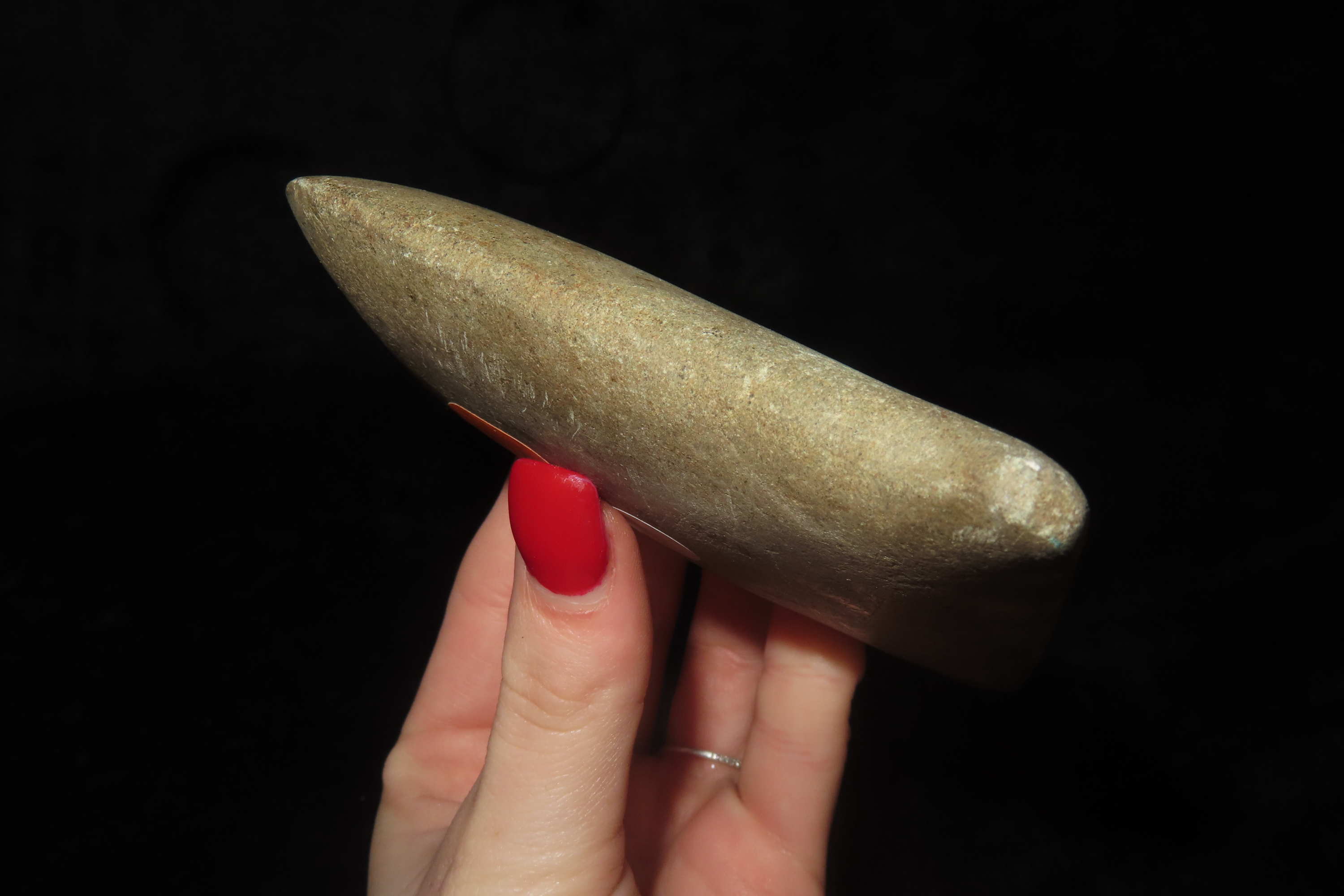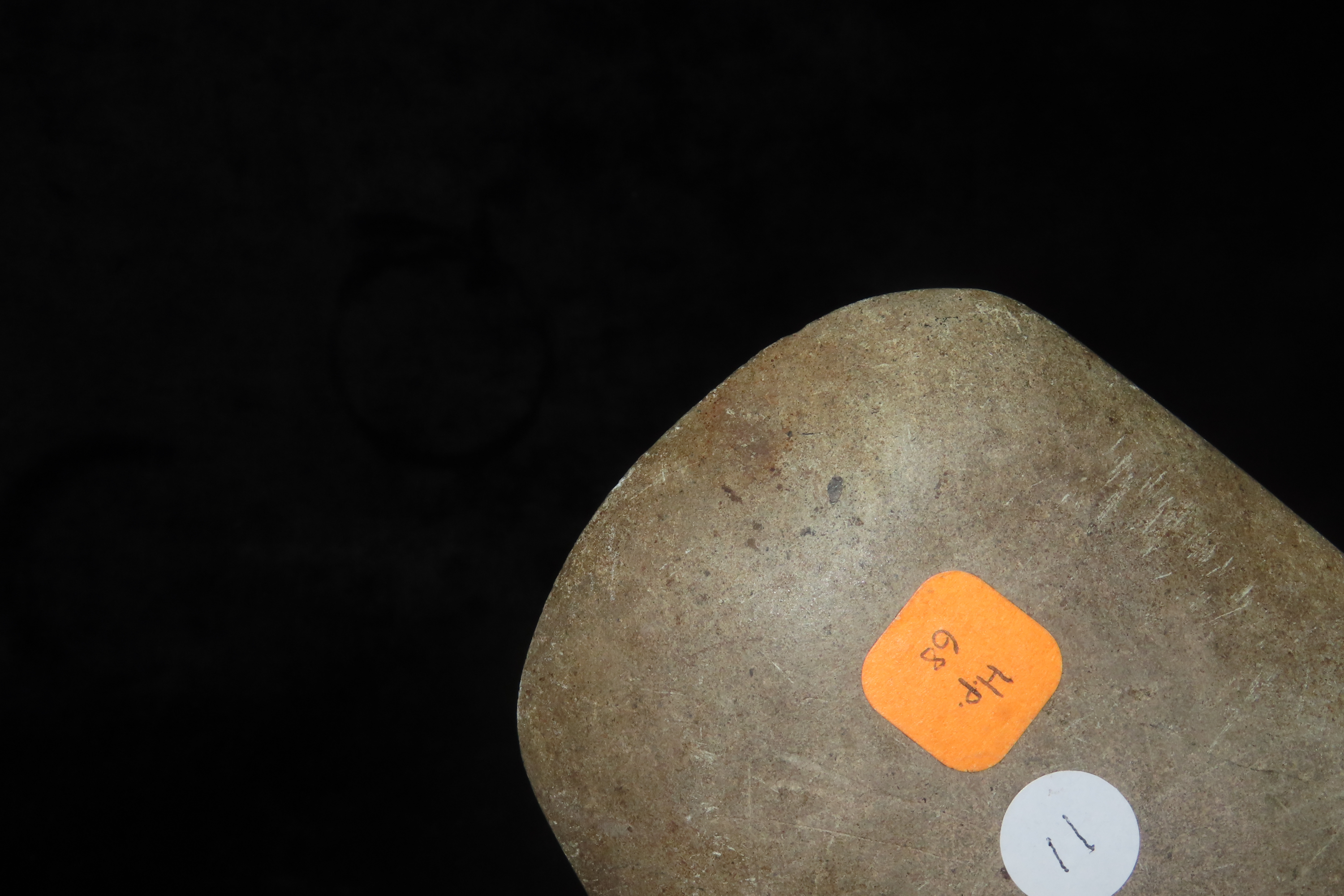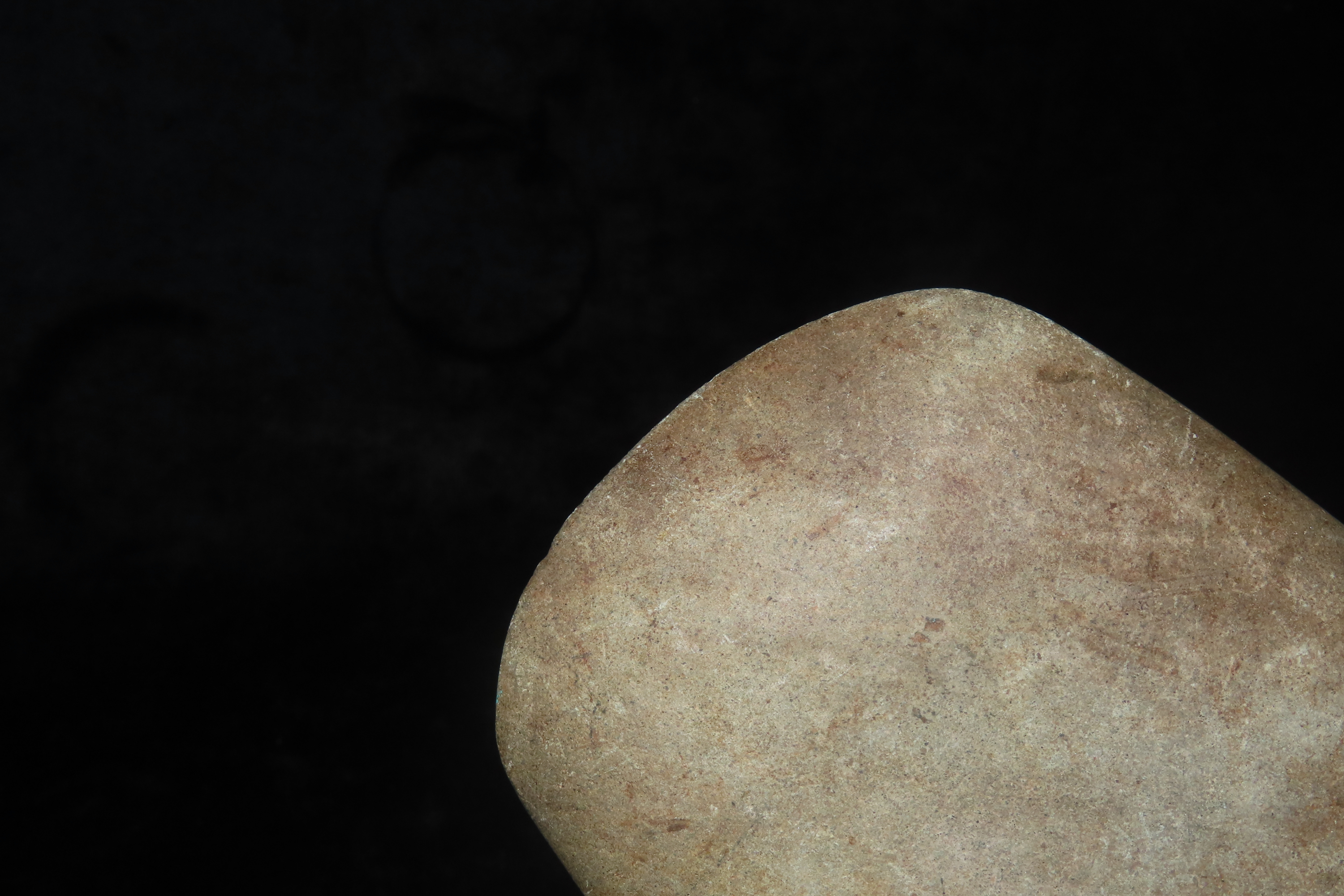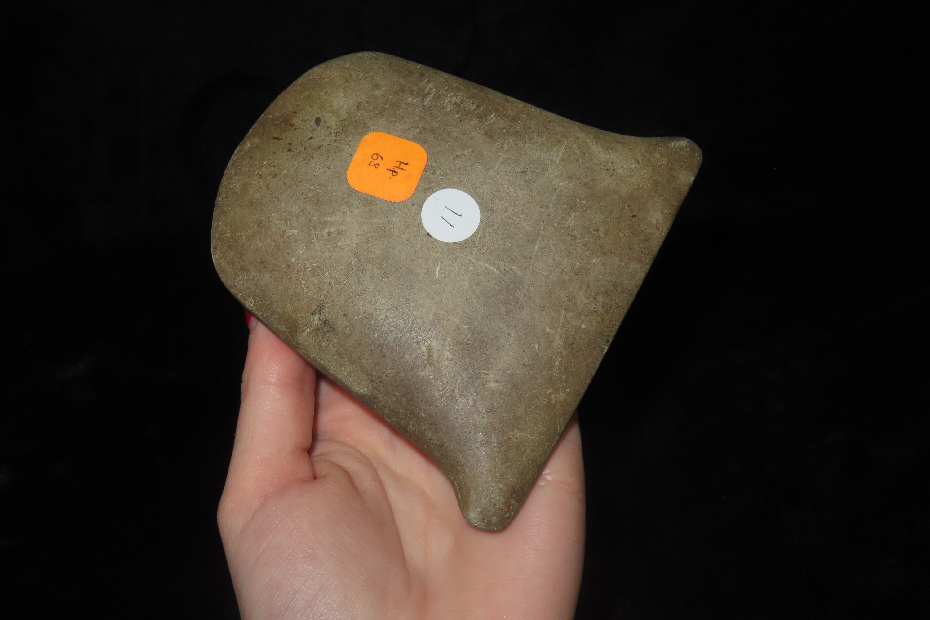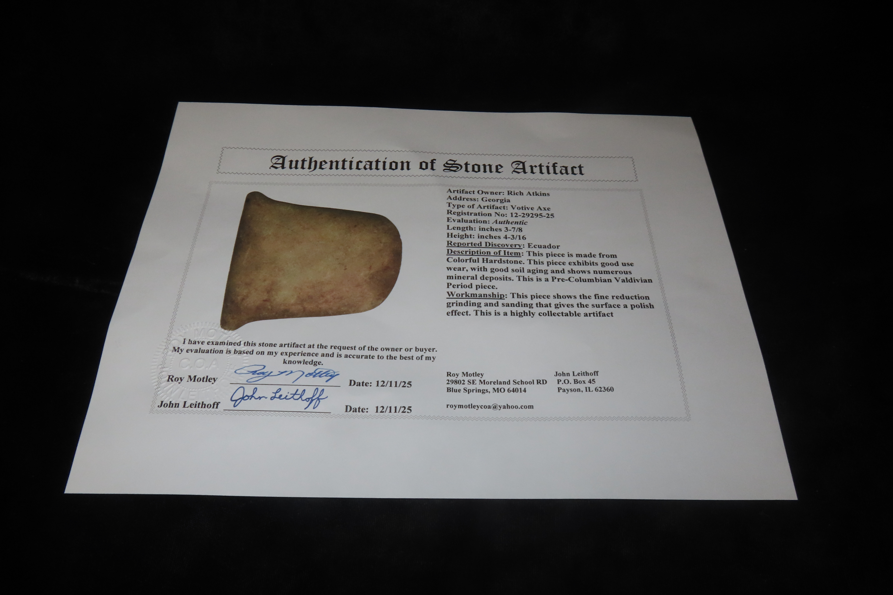 3 7/8″ x 4 3/16″ Pre-Columbian Colorful Hardstone Votive(Ceremonial)Hand Axe, Motley COA, from Ecuador, Valdivian Period, Ex Rich Atkins Collection