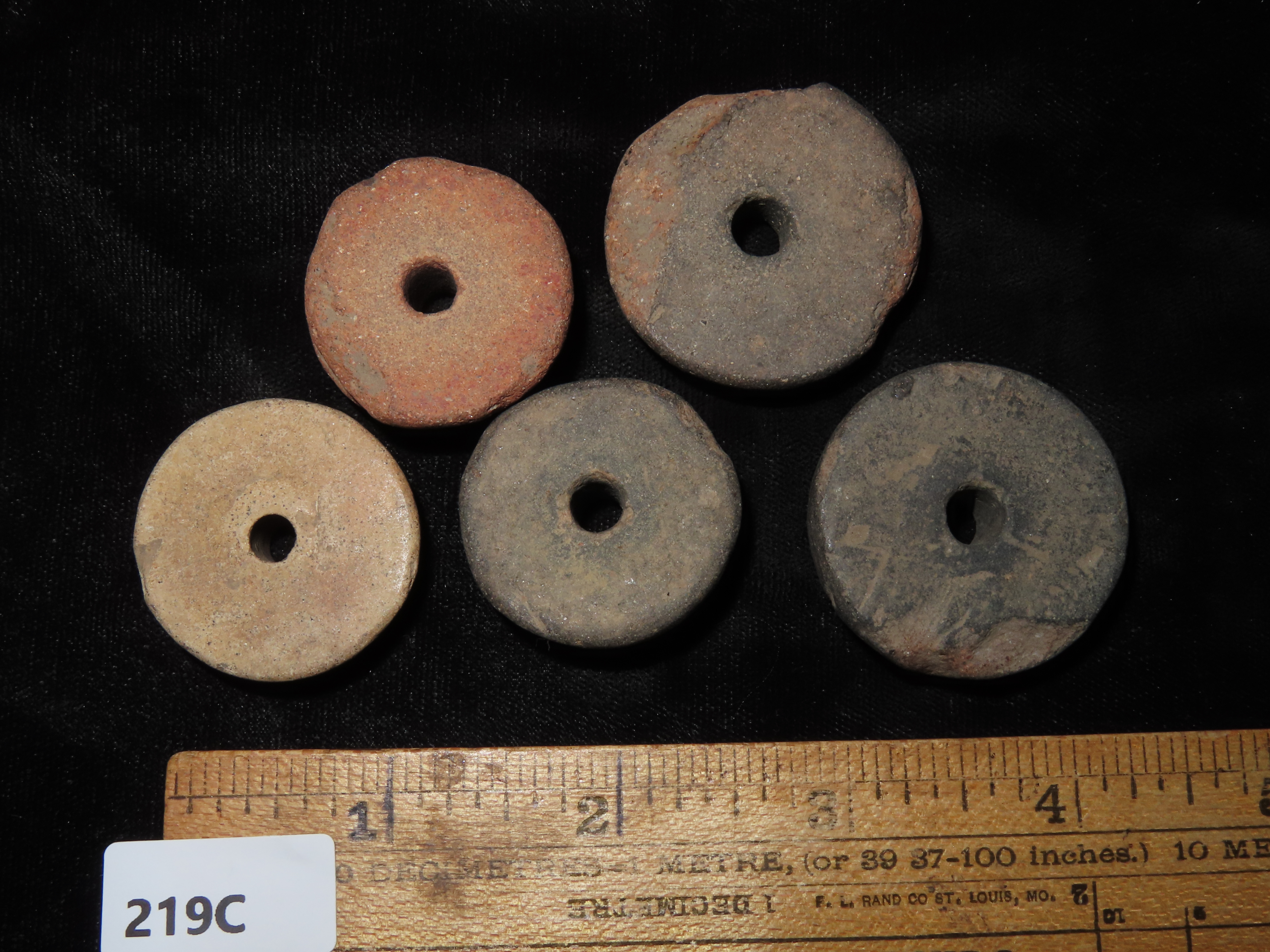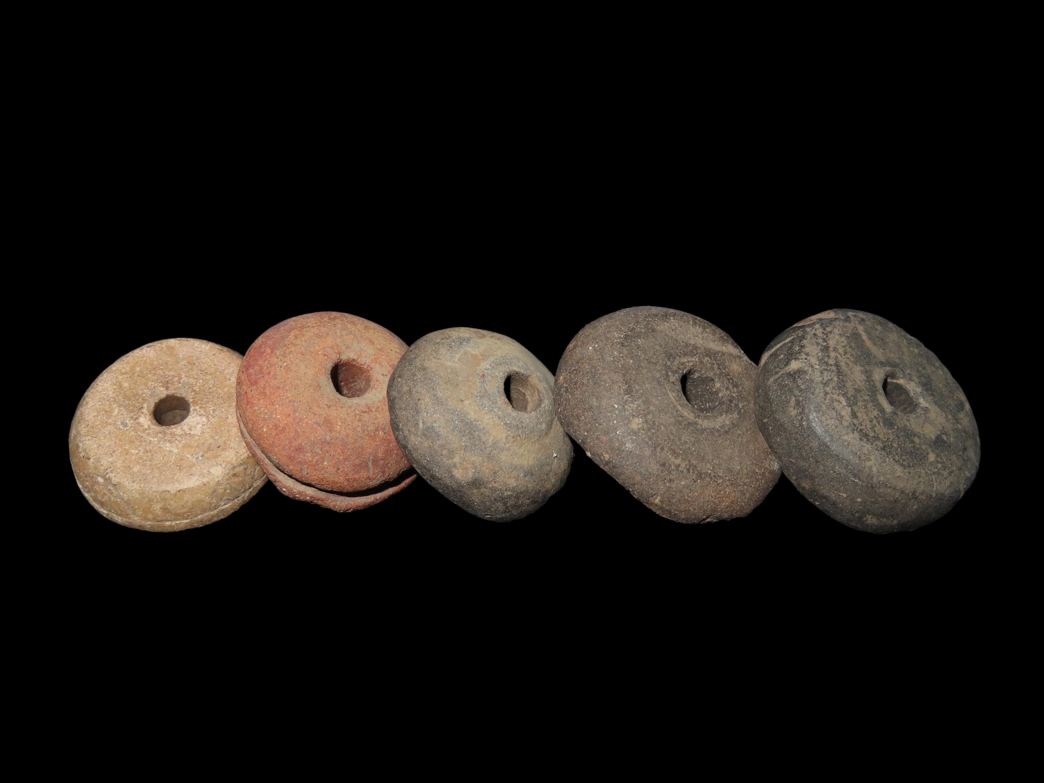 Lot of 5 Pre-Columbian Pottery Whorl Beads, Some Engraved/Notched, Guatemala, Ex Rich Atkins Collection
