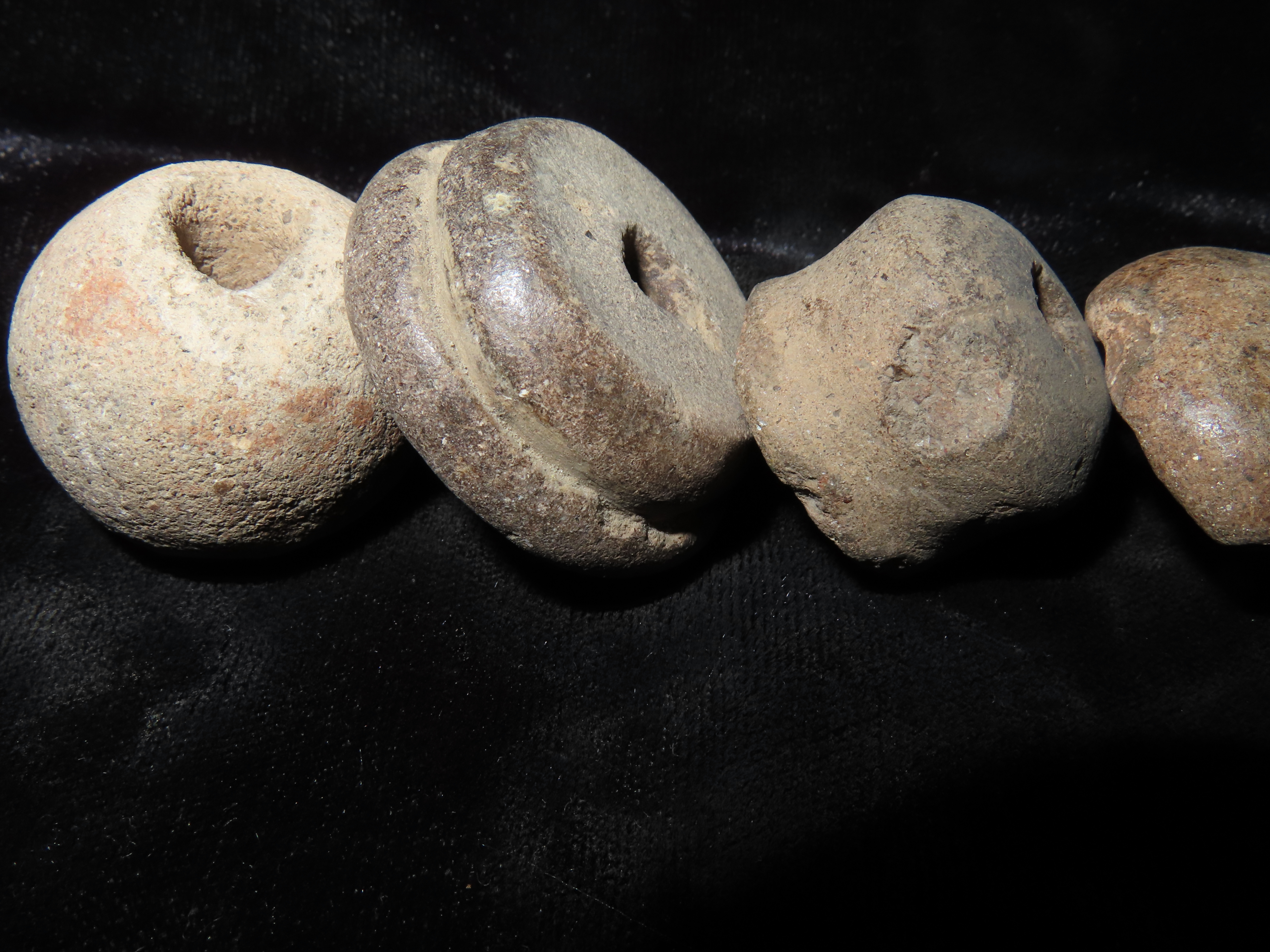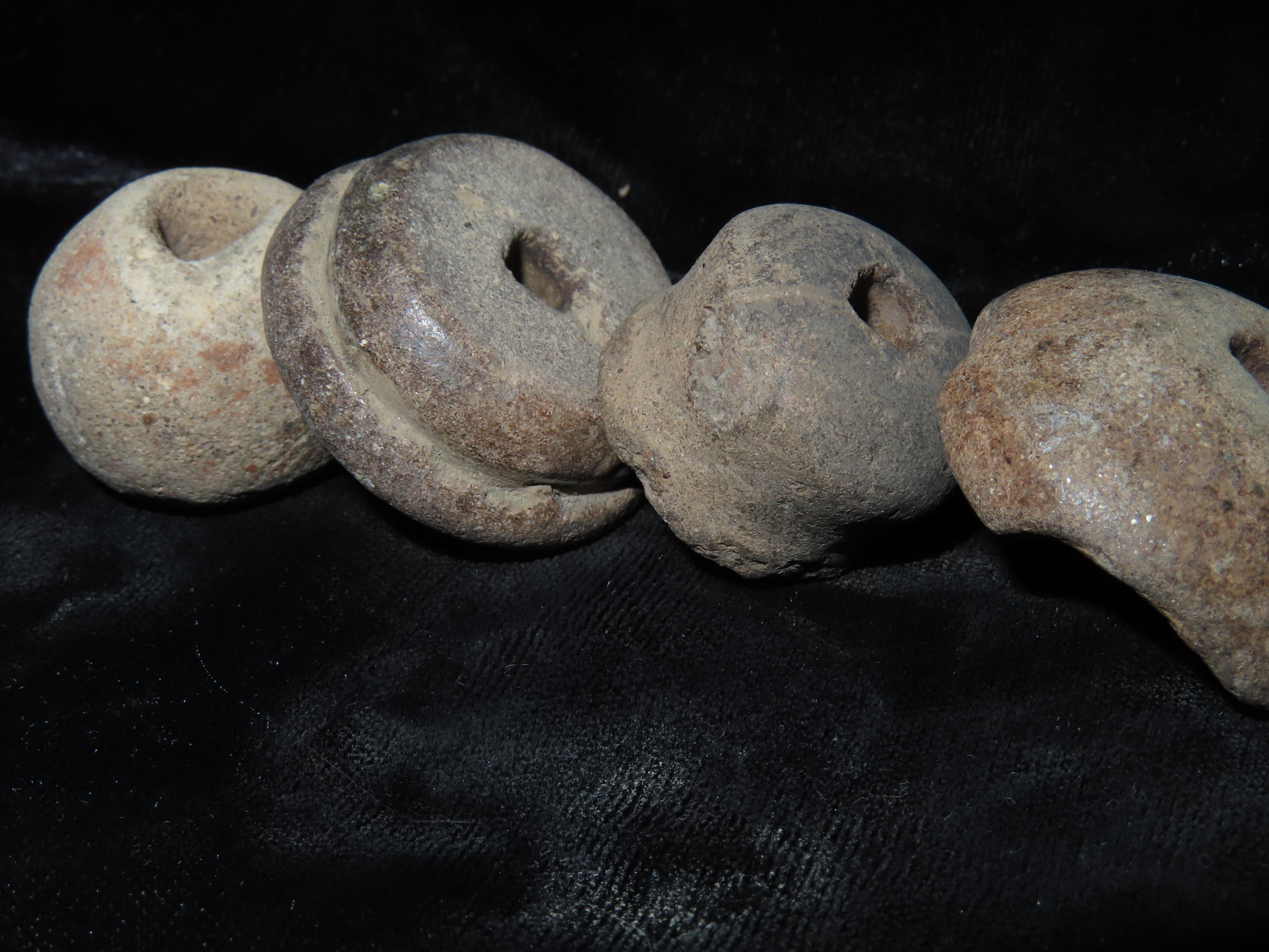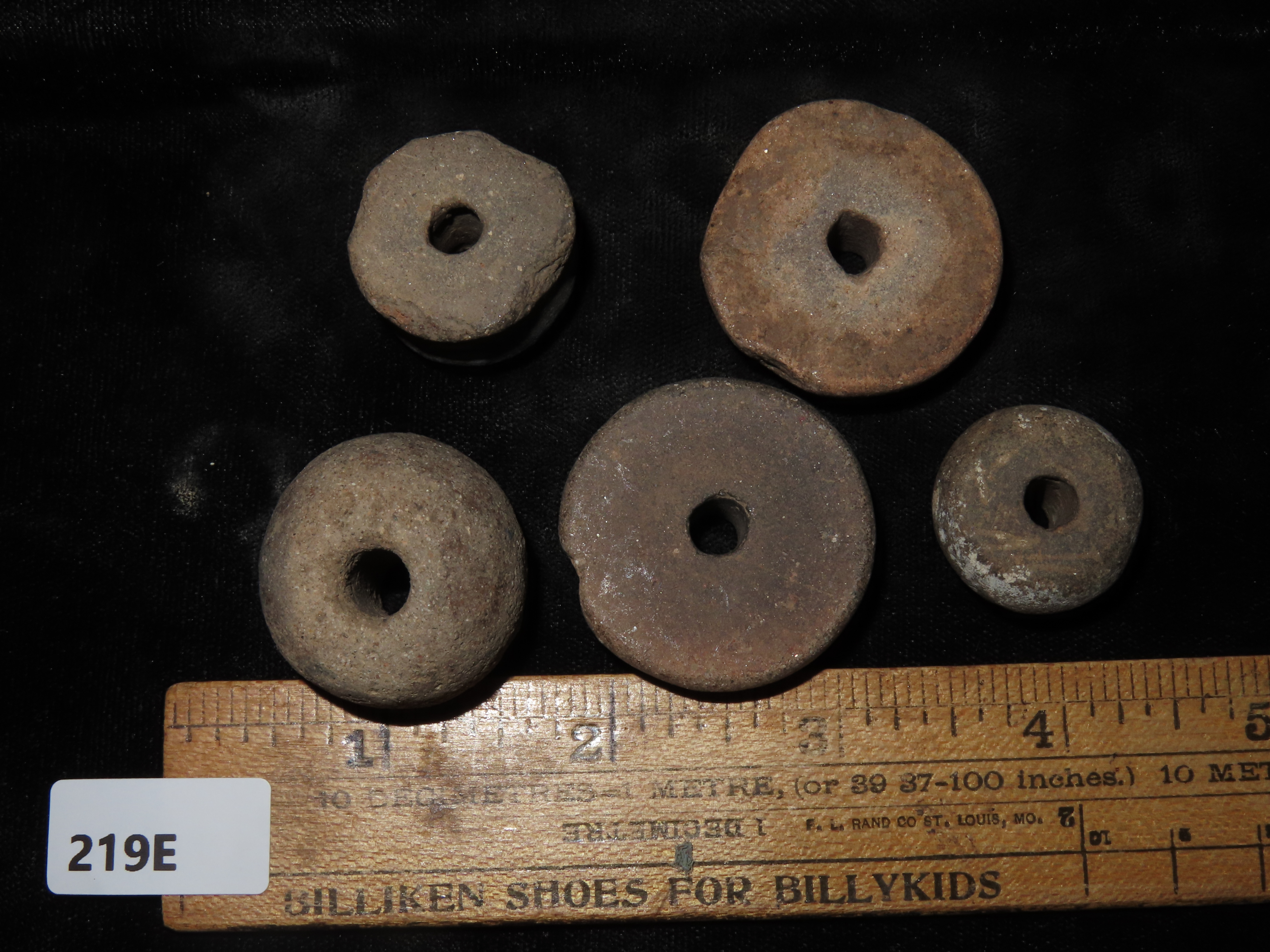 Lot of 5 Pre-Columbian Pottery Whorl Beads, Some Engraved/Notched, Guatemala, Ex Rich Atkins Collection