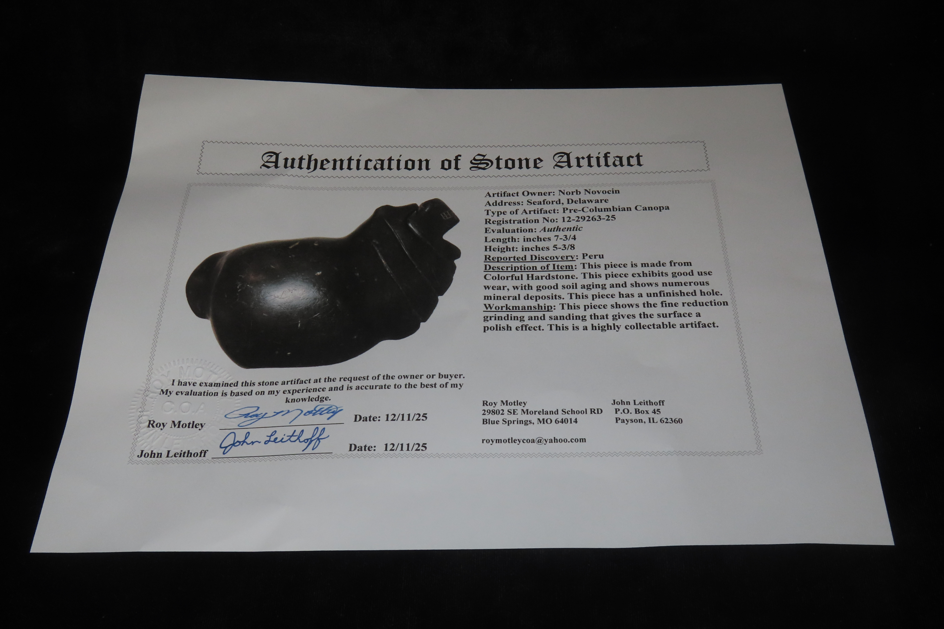 7 3/4″ x 5 3/8″ Pre-Columbian Llama Effigy Canopa, Found in Peru, Motley COA, From Private Collection in Delaware