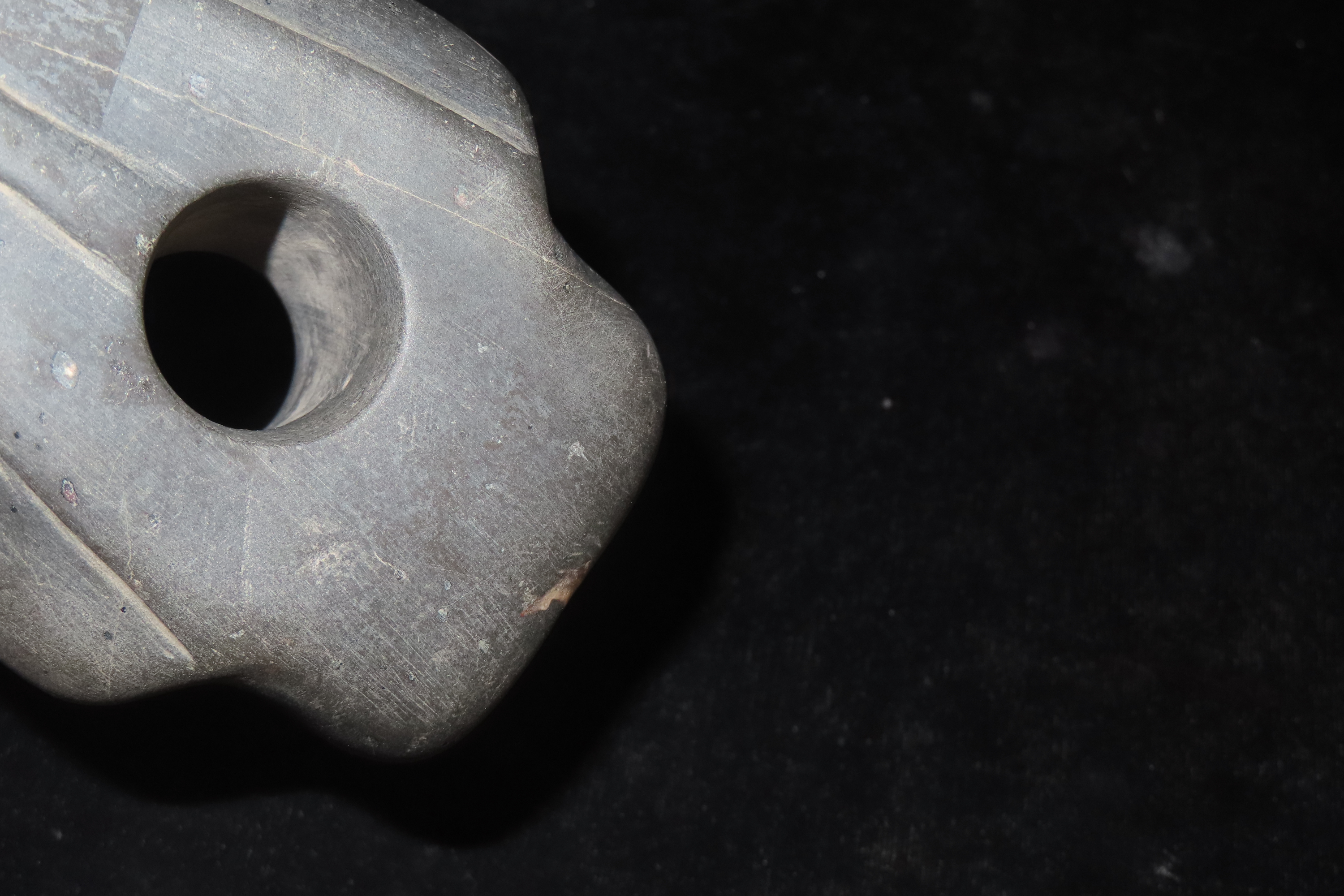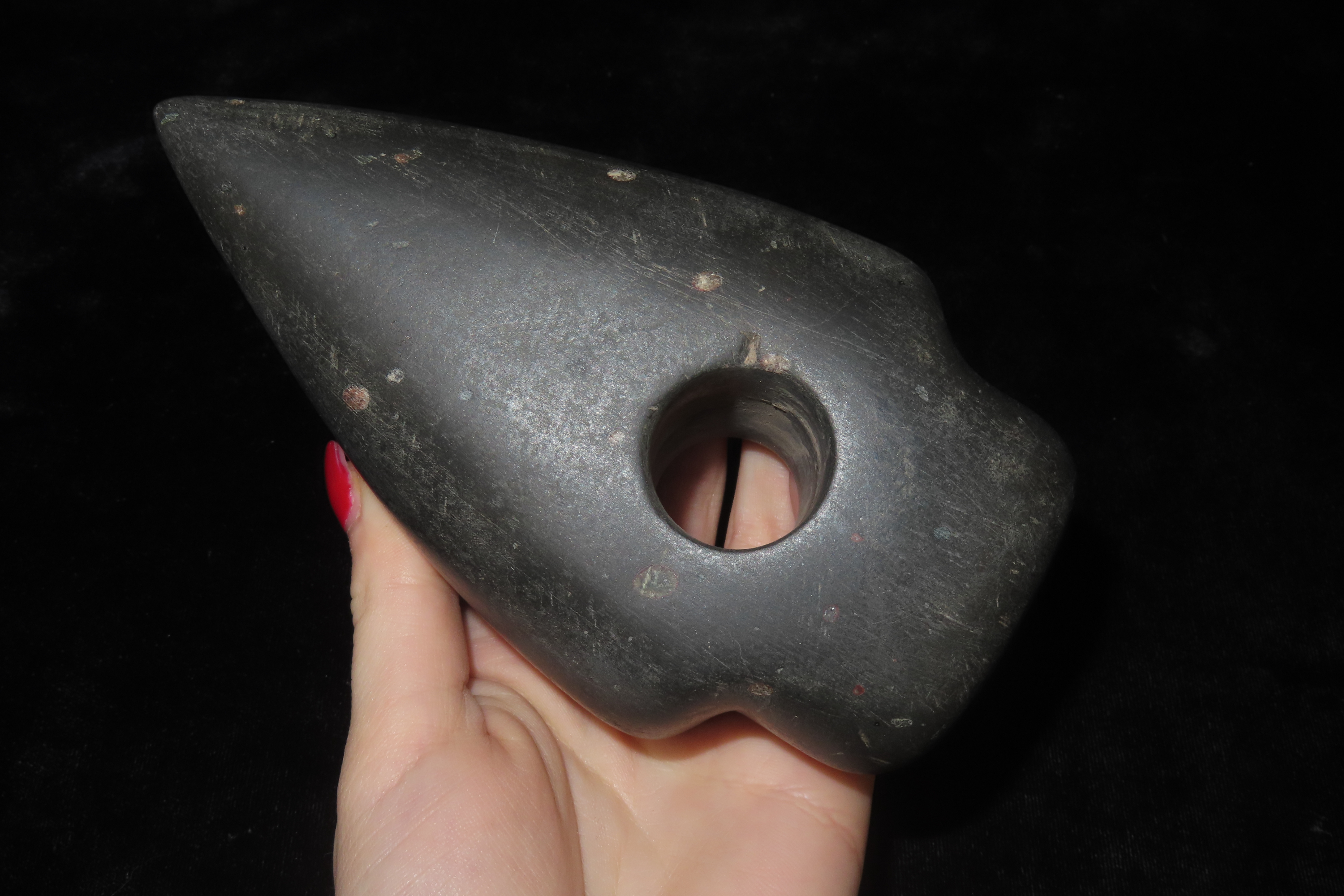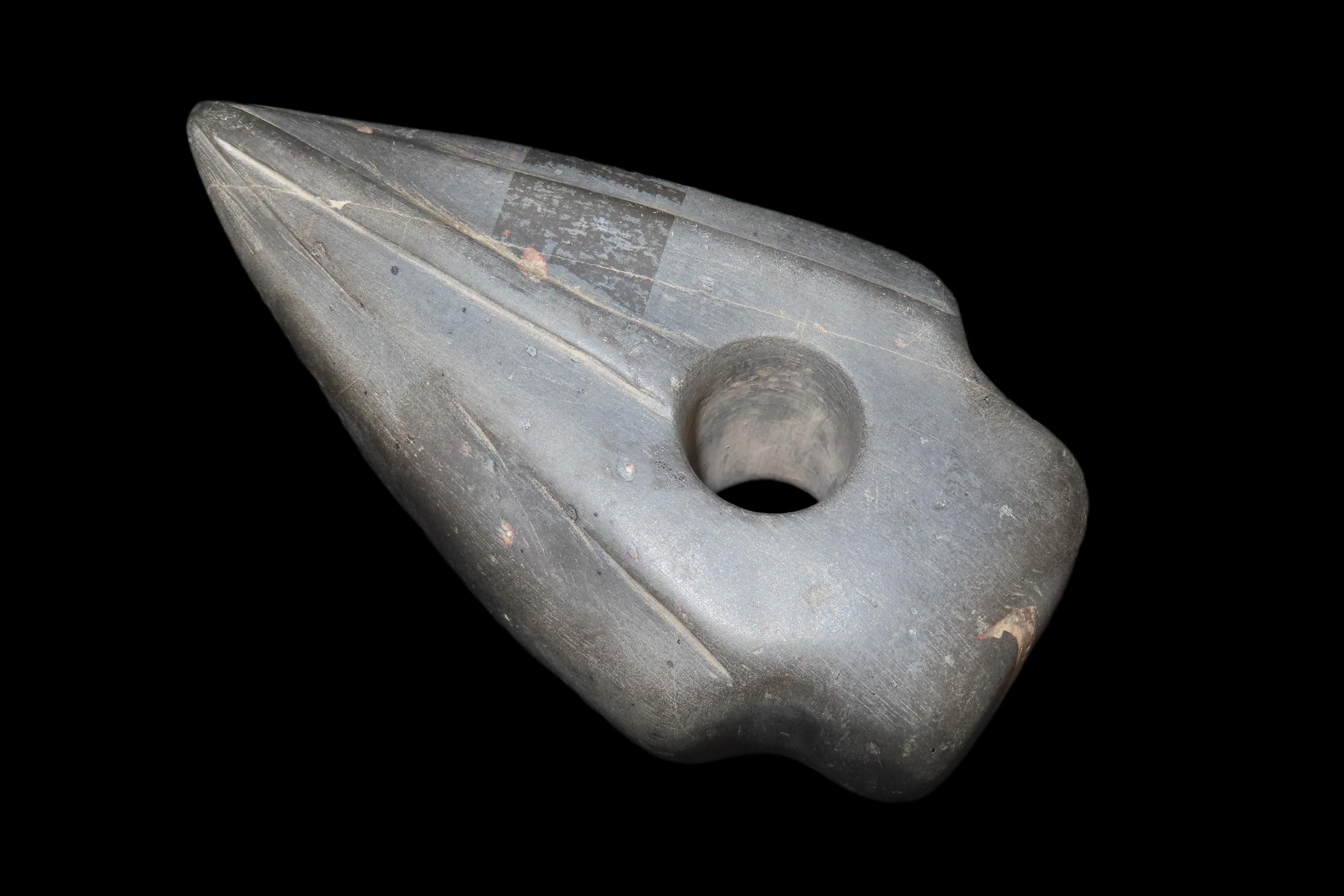 It is made of hardstone and features a polished, boat-axe shape with a hole for a handle.