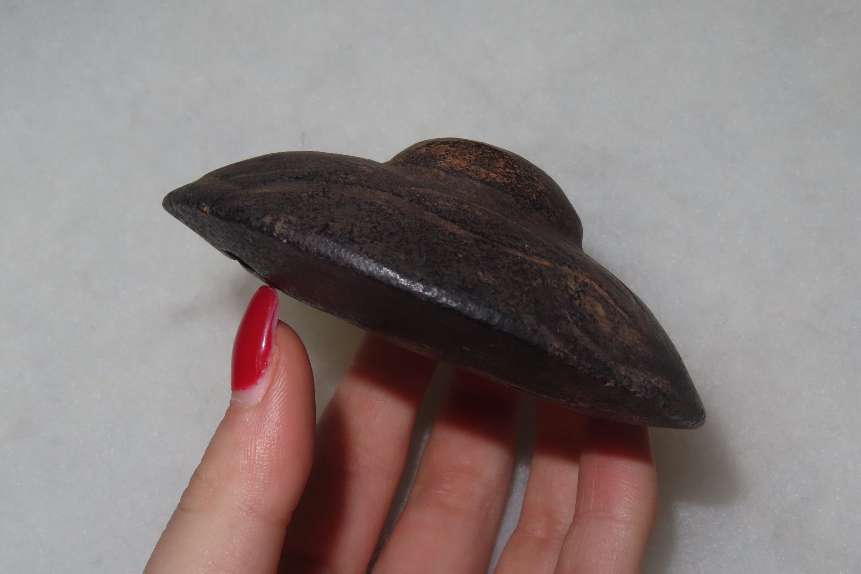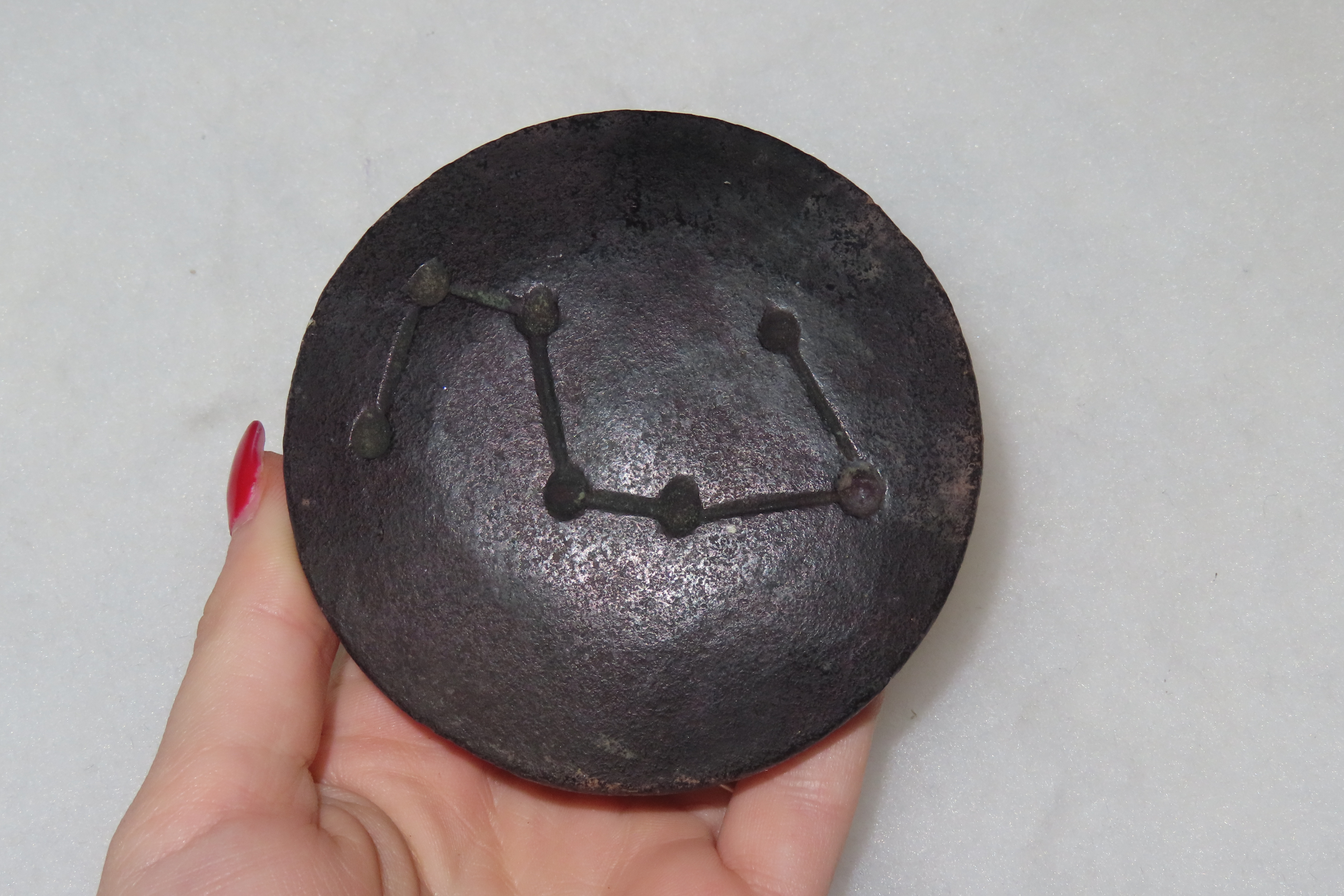 Old China Hongshan Culture Meteorite (Black Magnet) Feng Shui Gossip UFO Spaceship collectible. The item is associated with the prehistoric Hongshan culture of northern China (c. 4000–3000 BCE). It is made from meteorite iron and features a black color. The design is in the shape of a “UFO spaceship,” sometimes referred to as “Feng Shui Gossip”. It is a unique piece of jewelry or a collectible item, often found in the Asian antiques market. Features Constellation Engraving on Bottom.