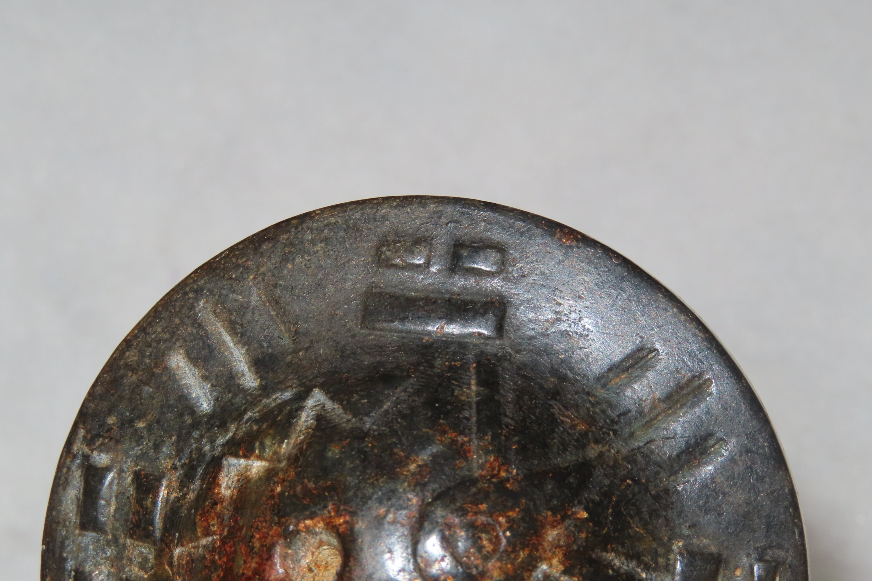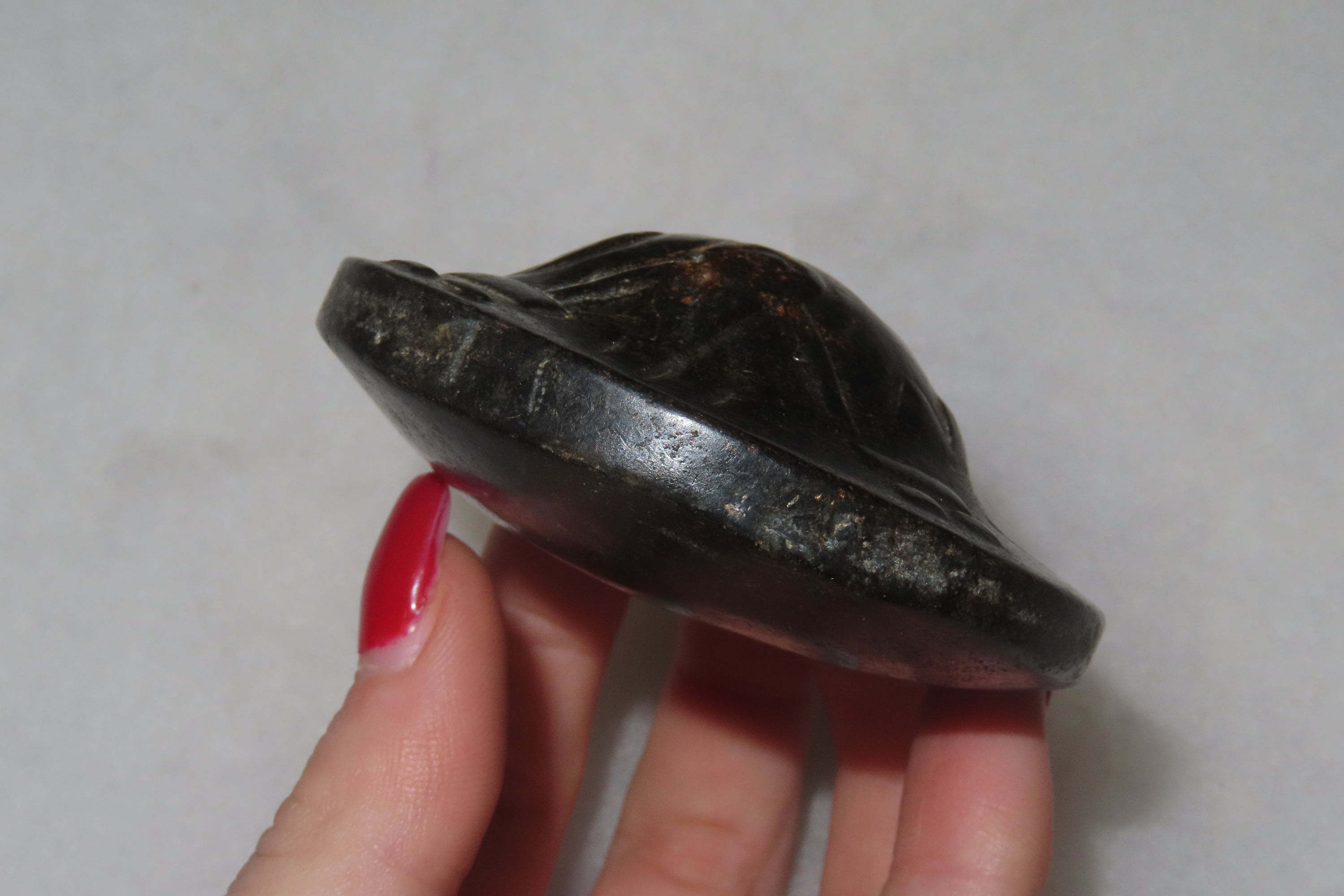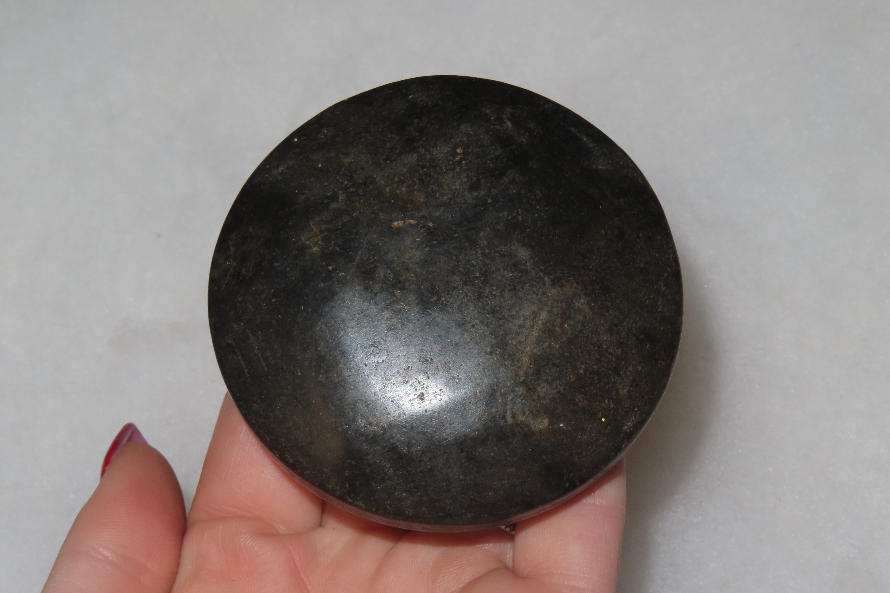 Old China Hongshan Culture Meteorite (Black Magnet) Feng Shui Gossip UFO Spaceship collectible. The item is associated with the prehistoric Hongshan culture of northern China (c. 4000–3000 BCE). It is made from meteorite iron and features a black color. The design is in the shape of a “UFO spaceship,” sometimes referred to as “Feng Shui Gossip”. It is a unique piece of jewelry or a collectible item, often found in the Asian antiques market. Features Constellation Engraving on Bottom.