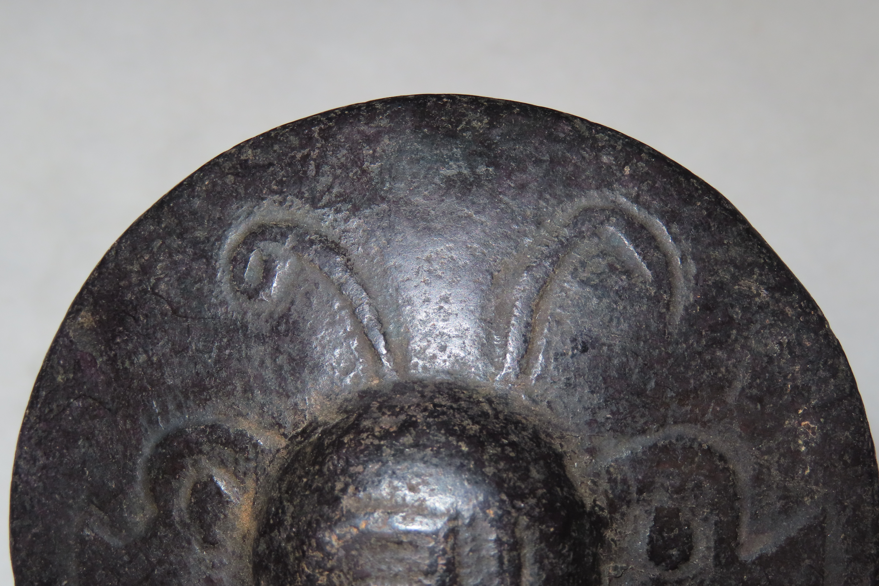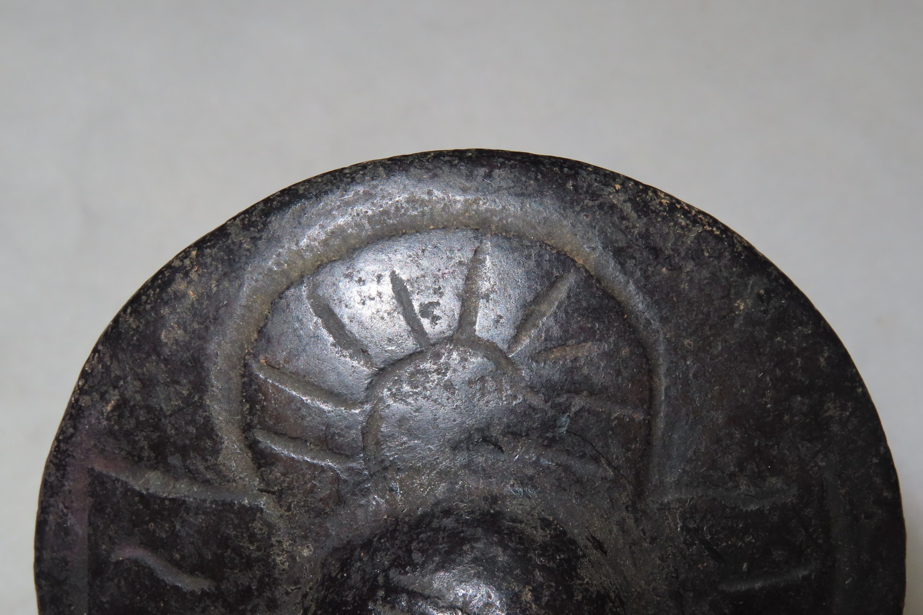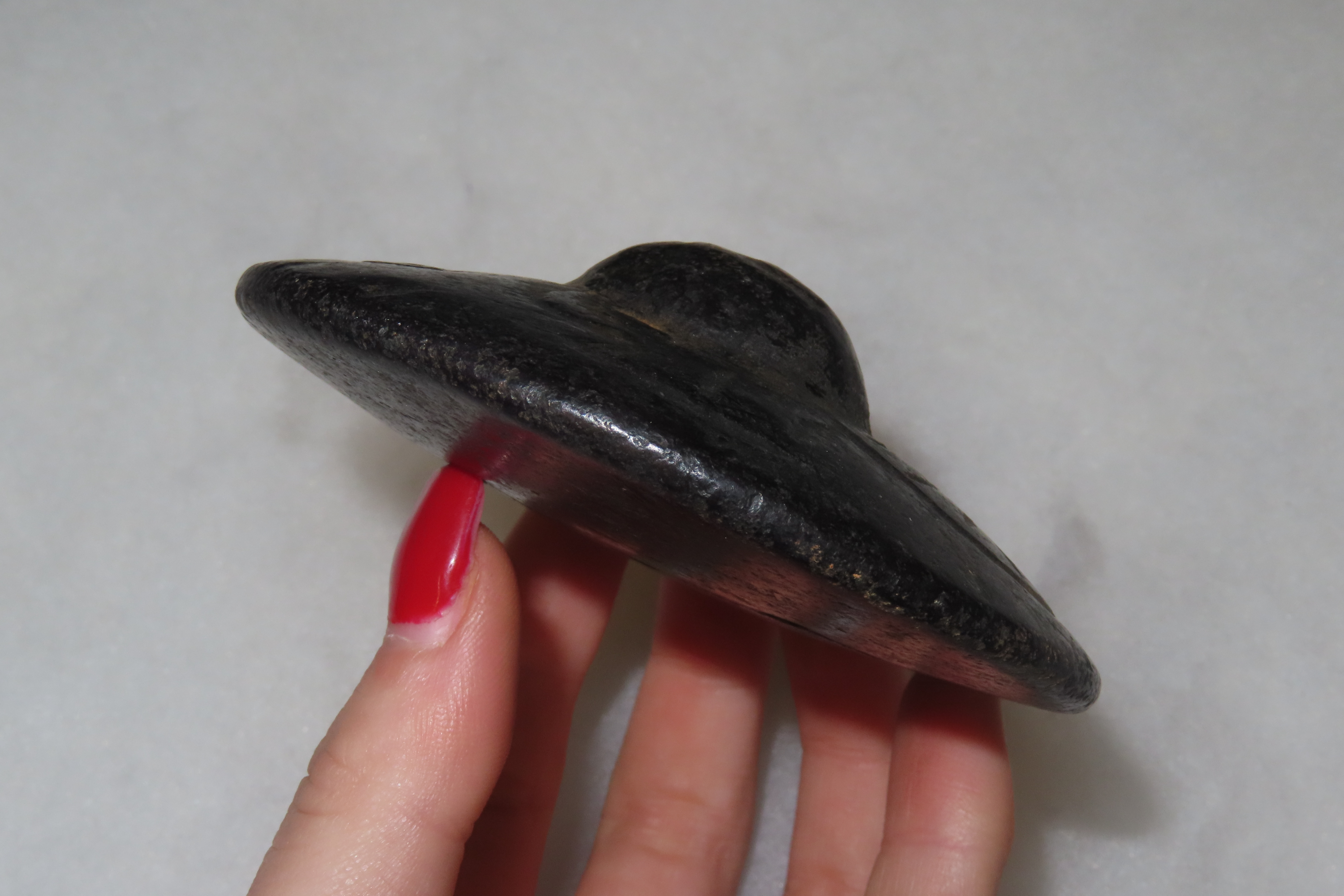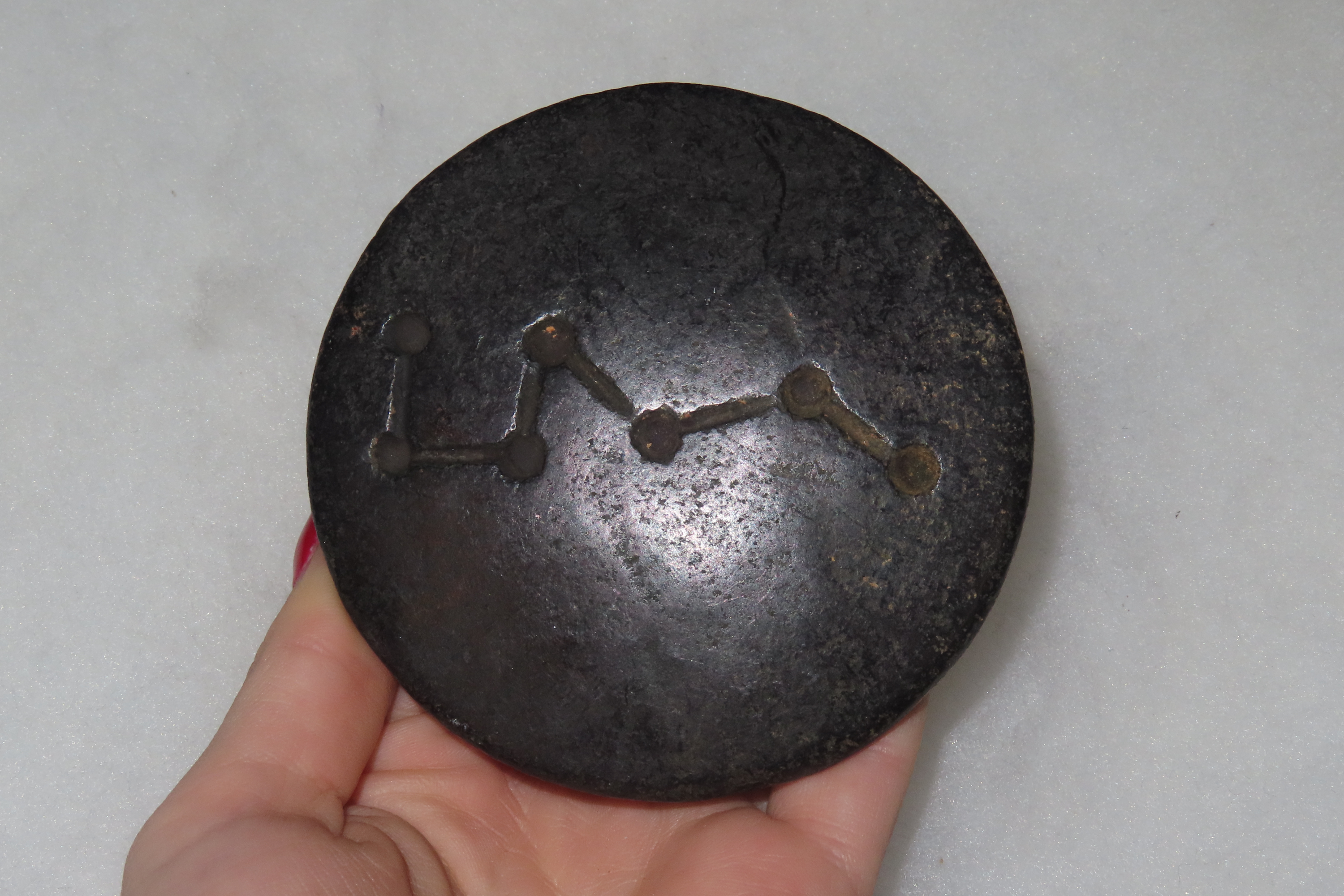 Old China Hongshan Culture Meteorite (Black Magnet) Feng Shui Gossip UFO Spaceship collectible. The item is associated with the prehistoric Hongshan culture of northern China (c. 4000–3000 BCE). It is made from meteorite iron and features a black color. The design is in the shape of a “UFO spaceship,” sometimes referred to as “Feng Shui Gossip”. It is a unique piece of jewelry or a collectible item, often found in the Asian antiques market. Features Constellation Engraving on Bottom.