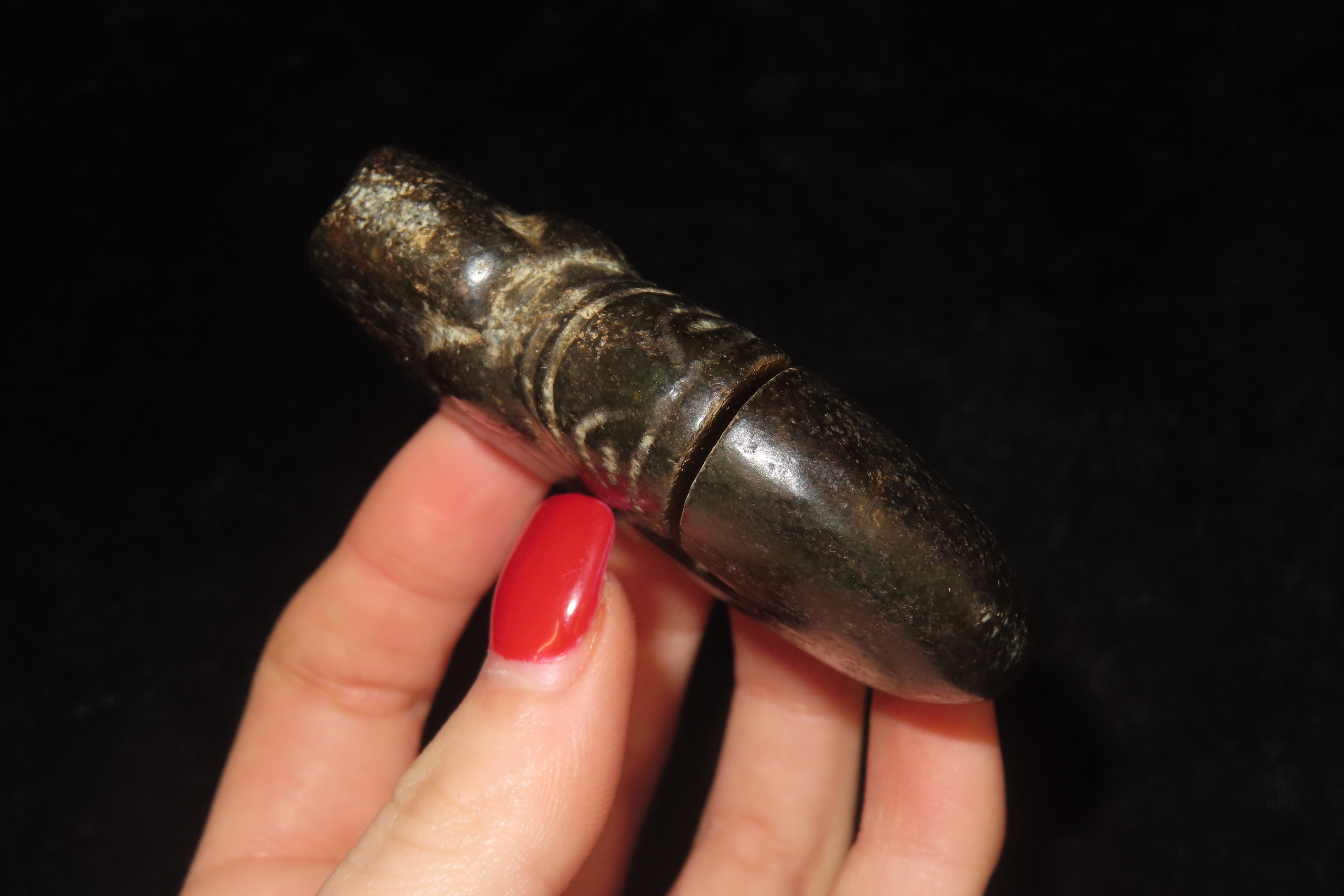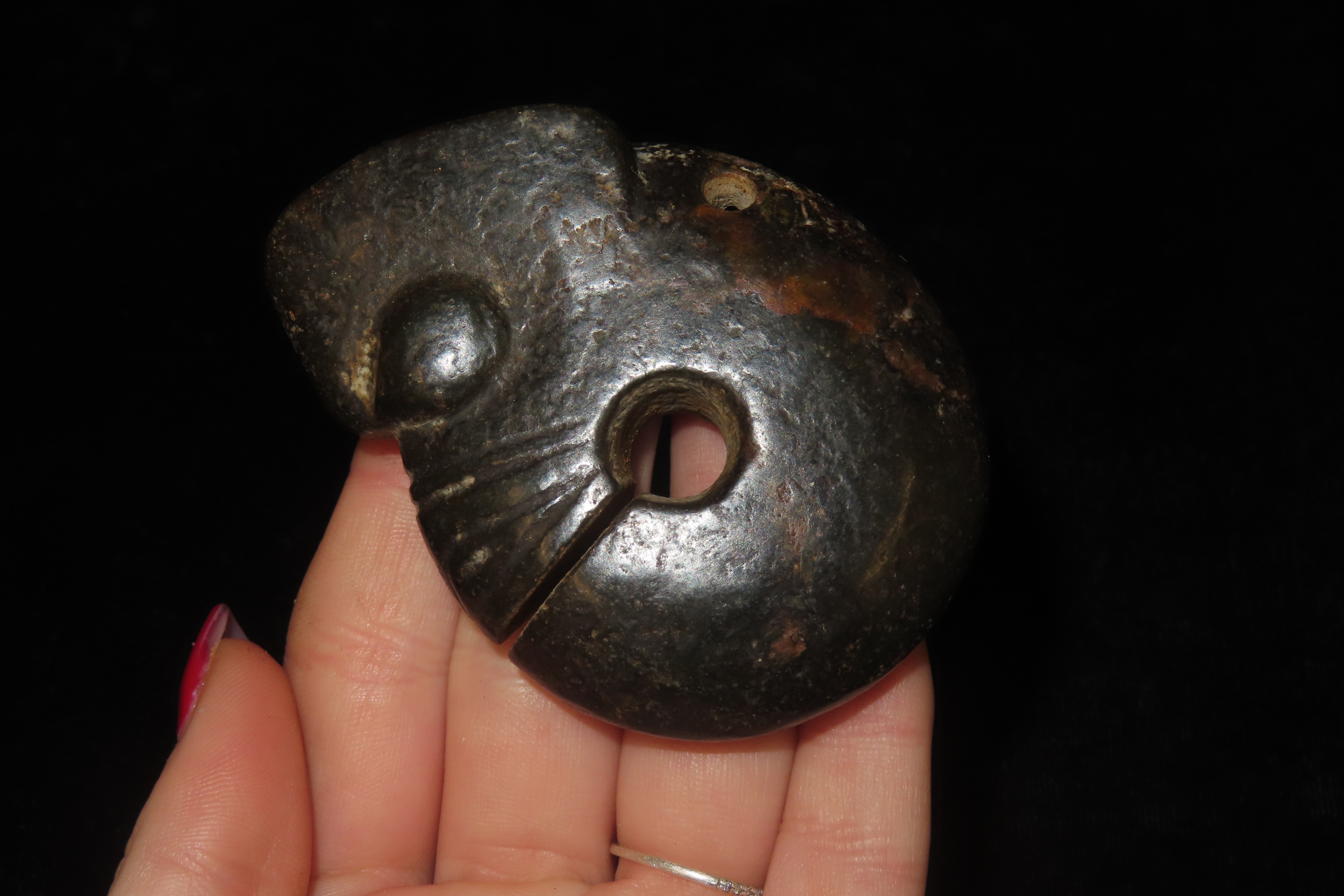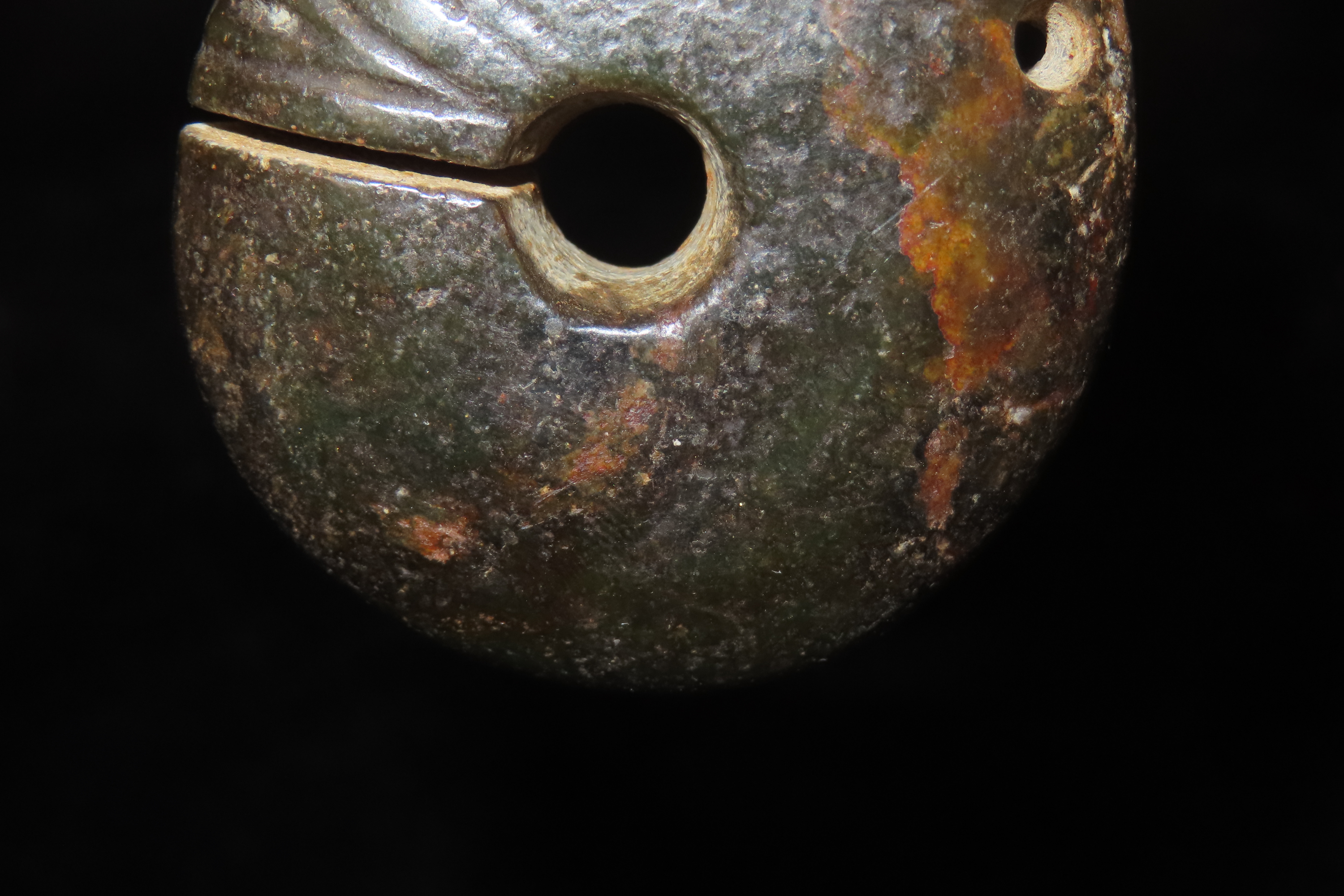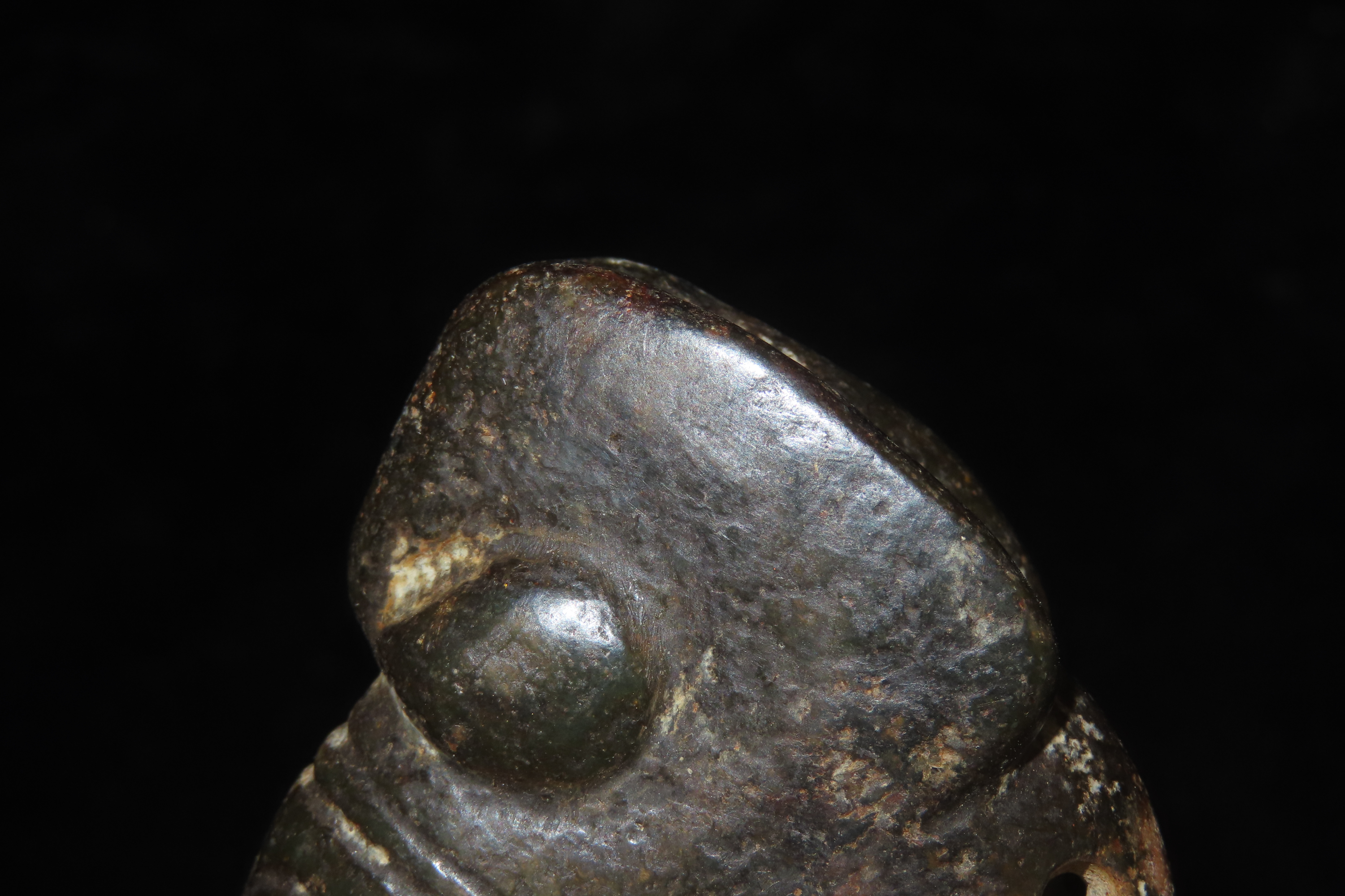 2 3/4″ Chinese Hongshan culture jade pig-dragon, or zhūlóng, dating from the Neolithic period. These artifacts typically feature a pig-like head with a coiled, serpent-like body, often described as “suggestively fetal”. They were produced by the Hongshan culture (c. 4700 to 2900 BC) and frequently included as grave goods in burials, suggesting ritual significance.