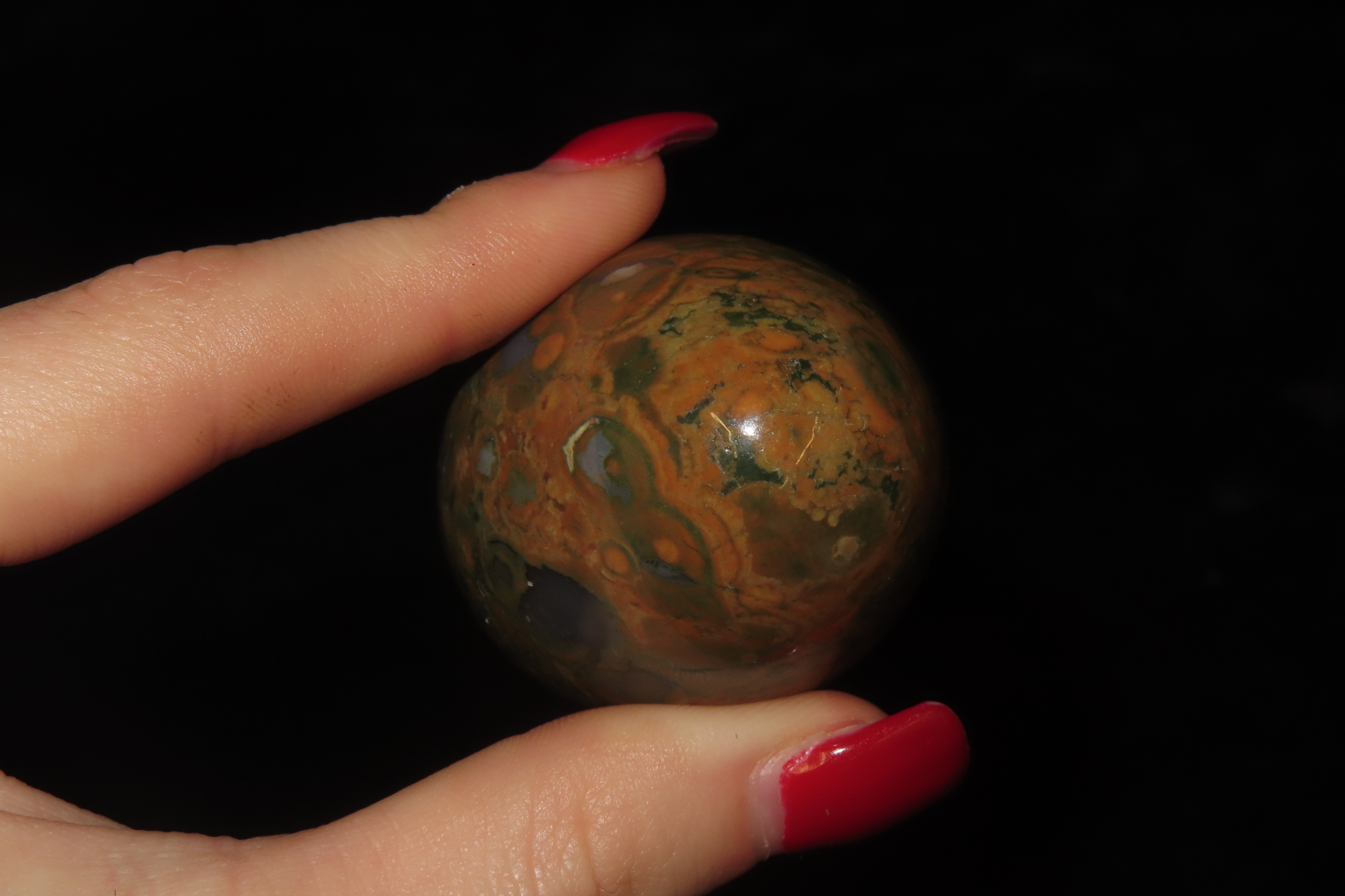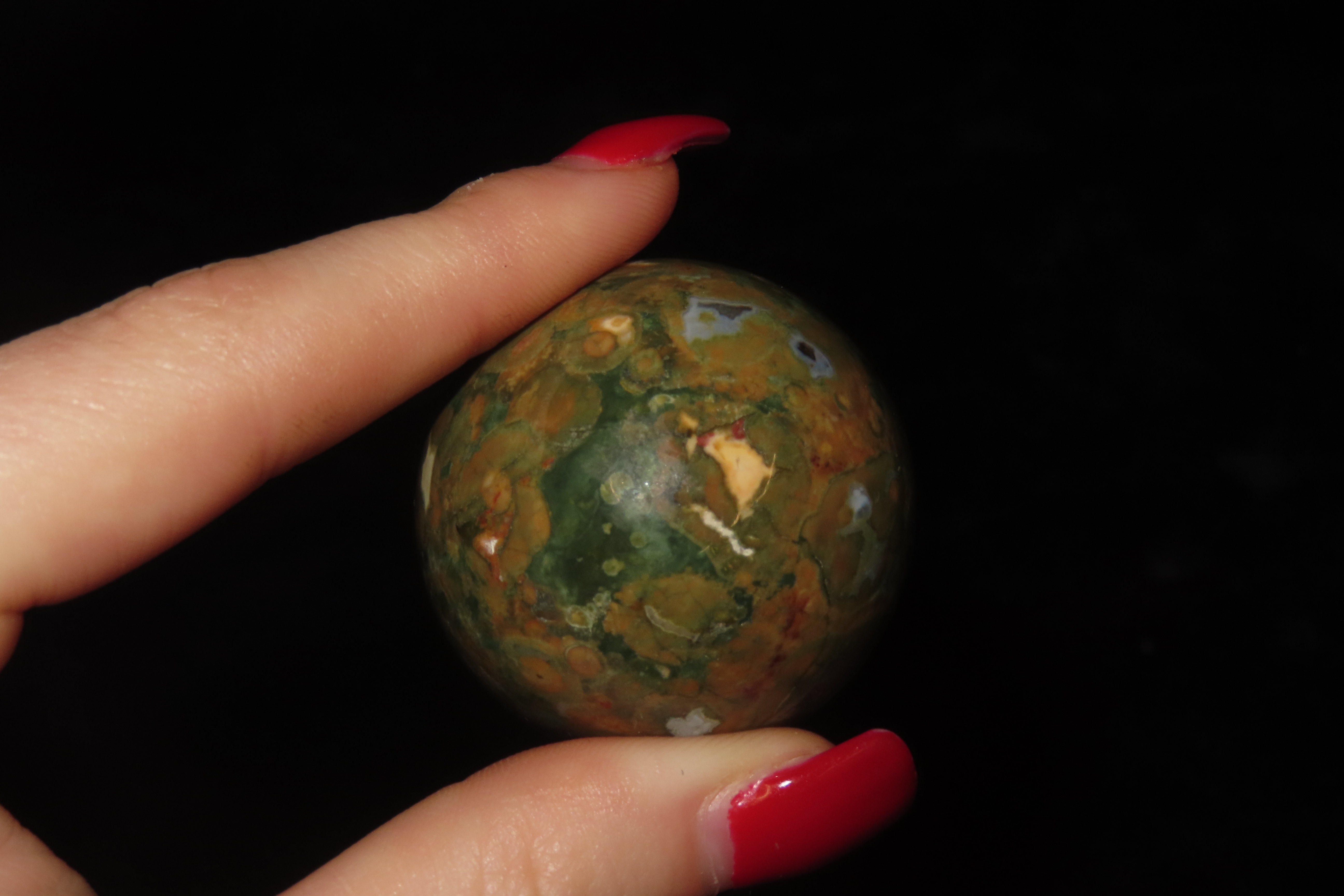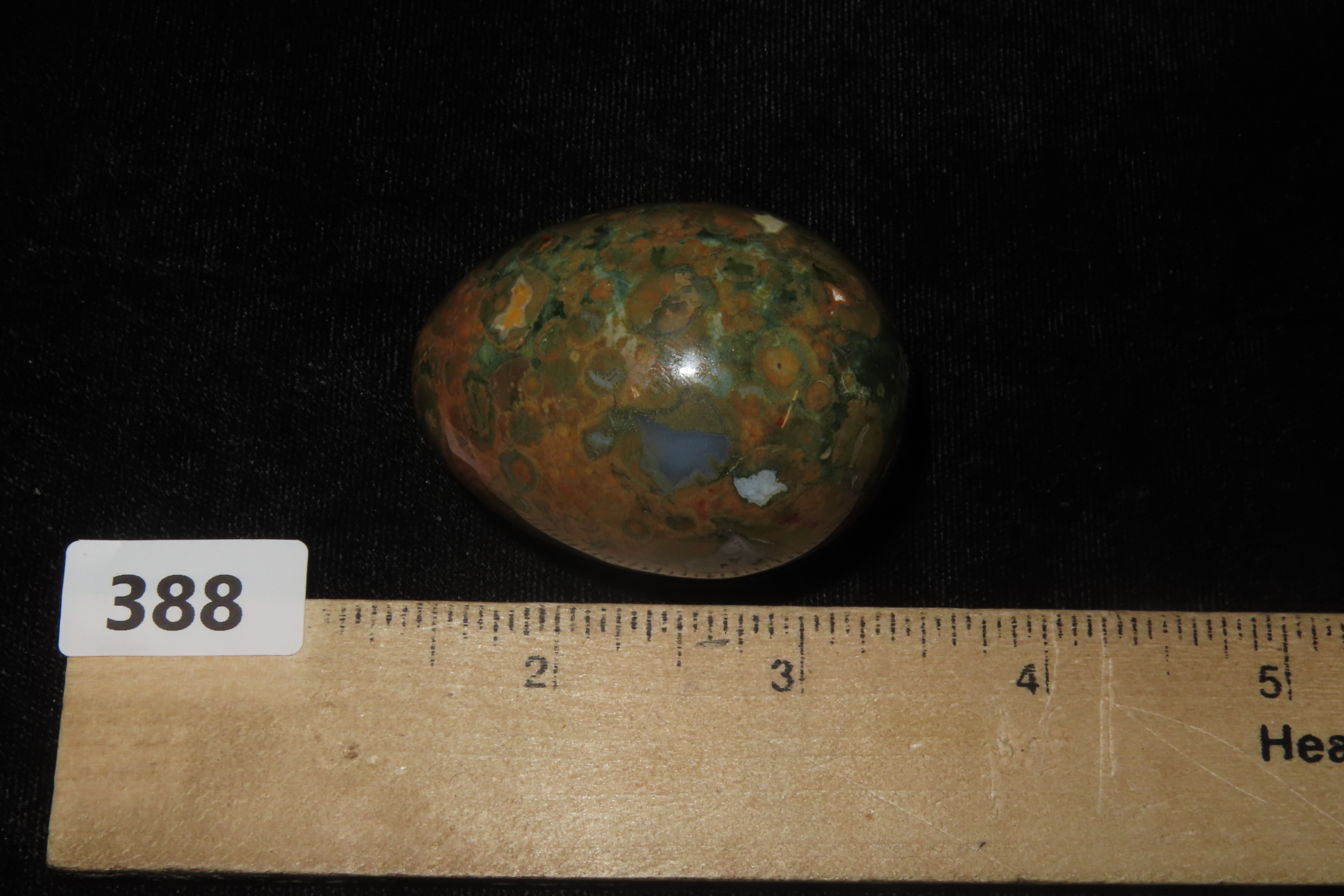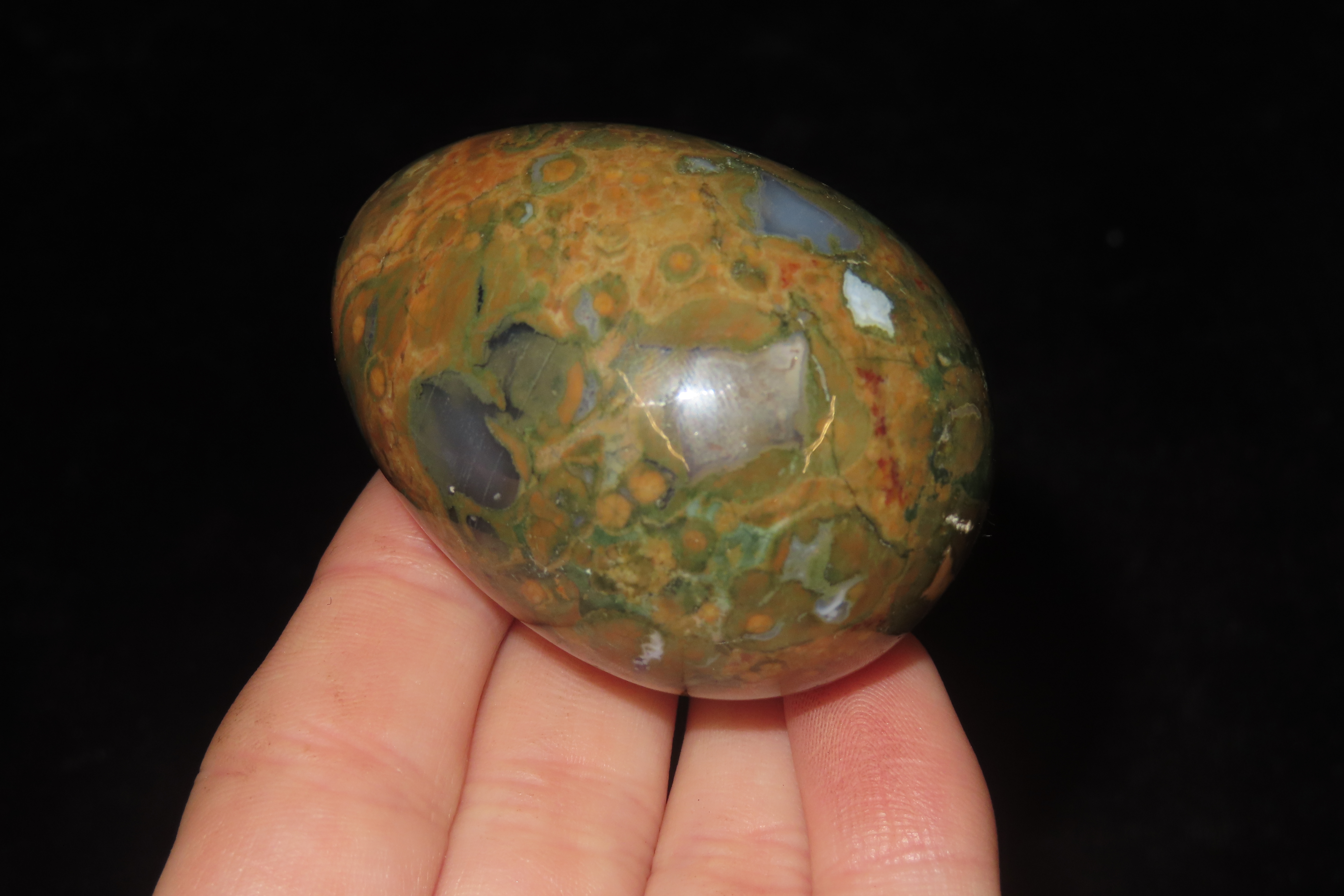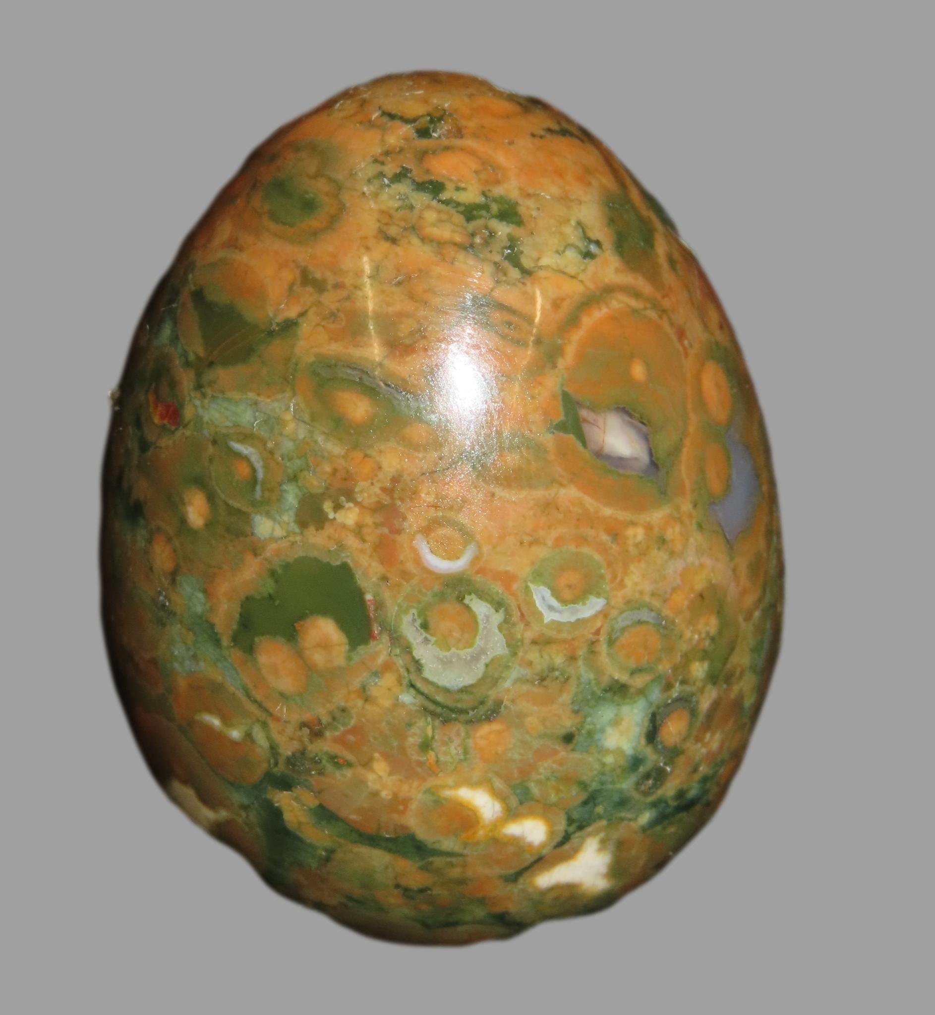 2″ Polished Rainforest Jasper (Rhyolite) egg.It is a form of rhyolitic lava that formed from the Mount Hay volcano near Queensland, Australia, approximately 120 million years ago. The green, yellow, brown, and orange colors evoke a rainforest canopy, while cavities filled with quartz and chalcedony create distinctive patterns. Geologists refer to the stone as rhyolite. It is often used for meditation and is believed to promote spiritual growth and inner peace