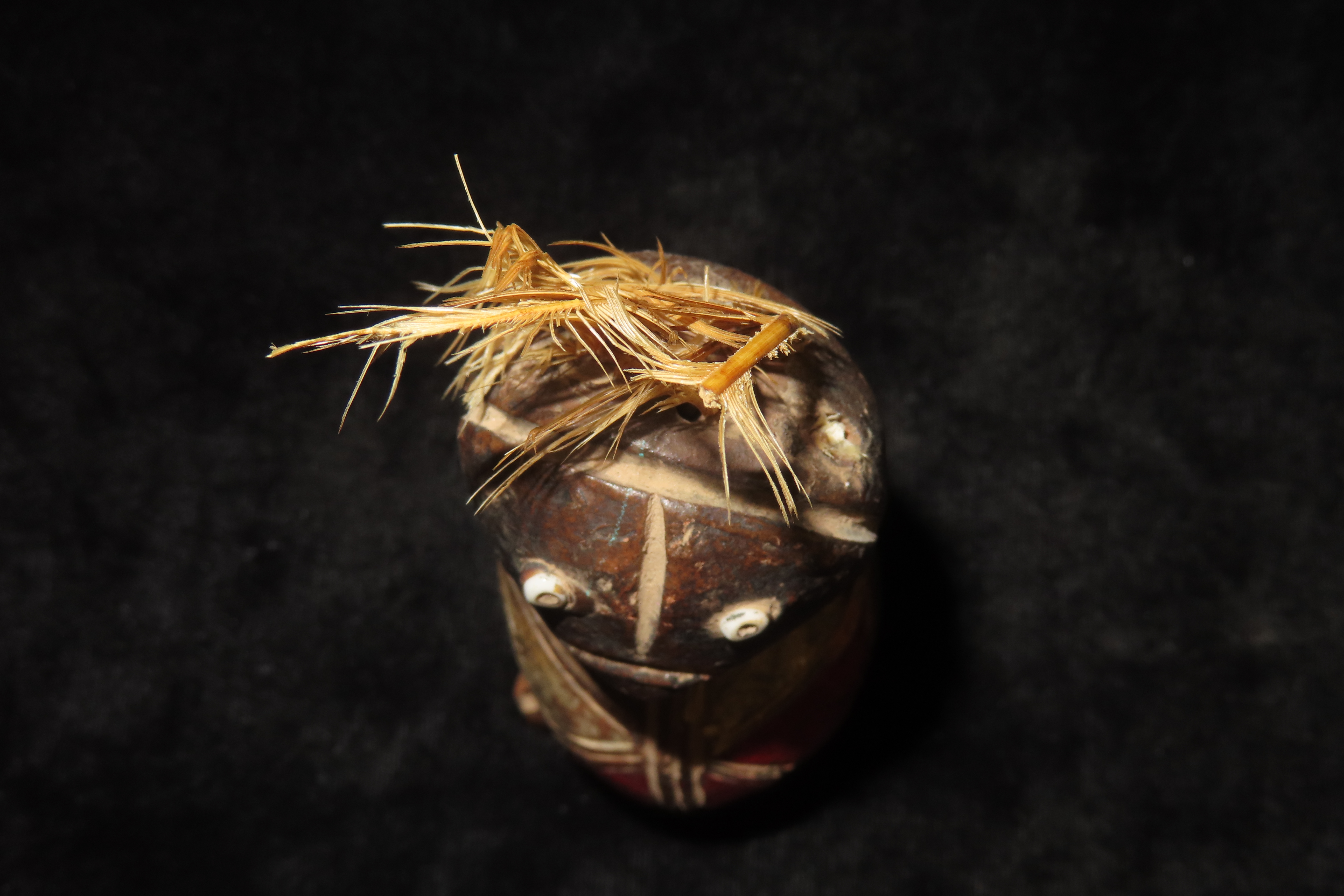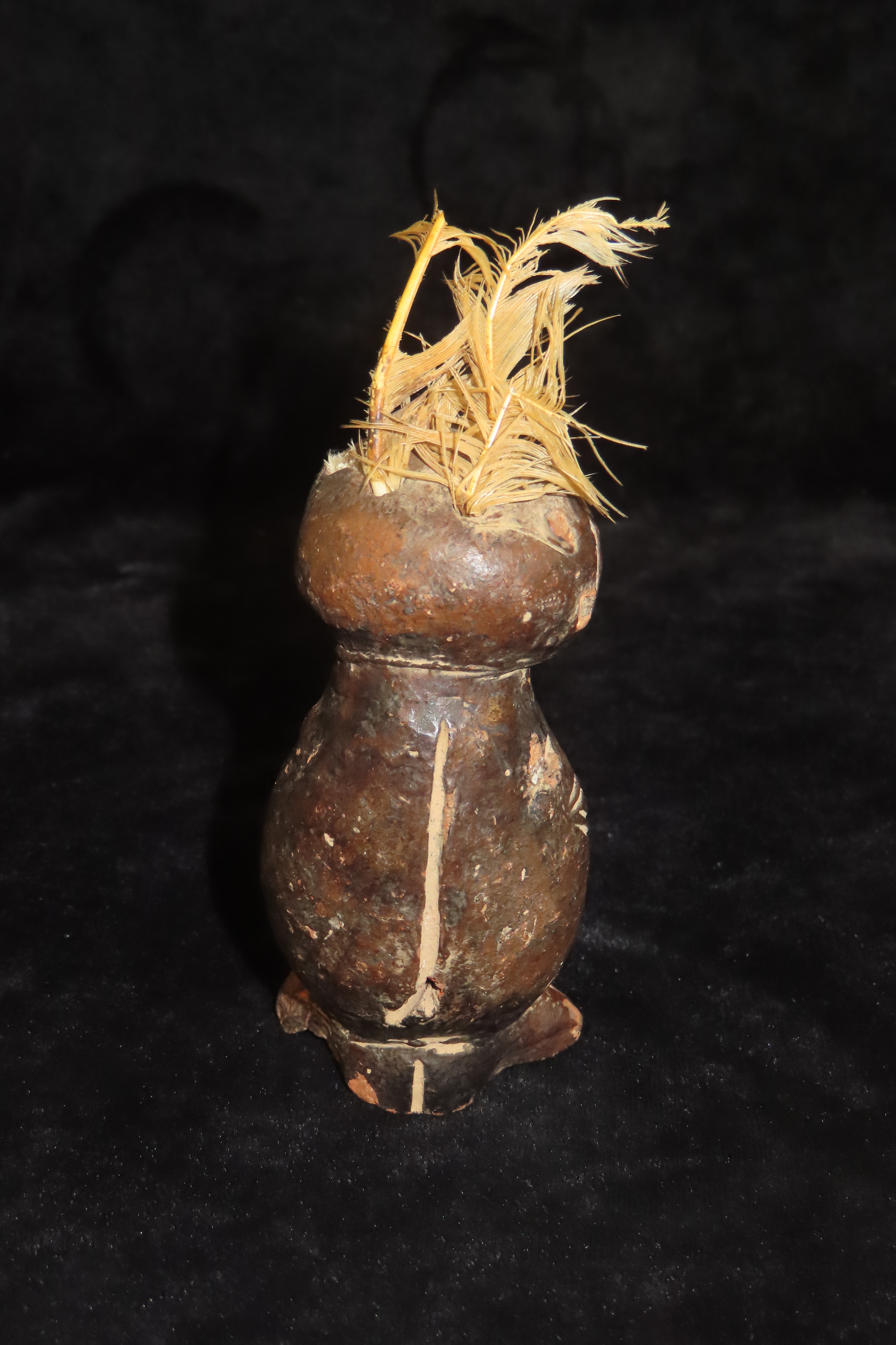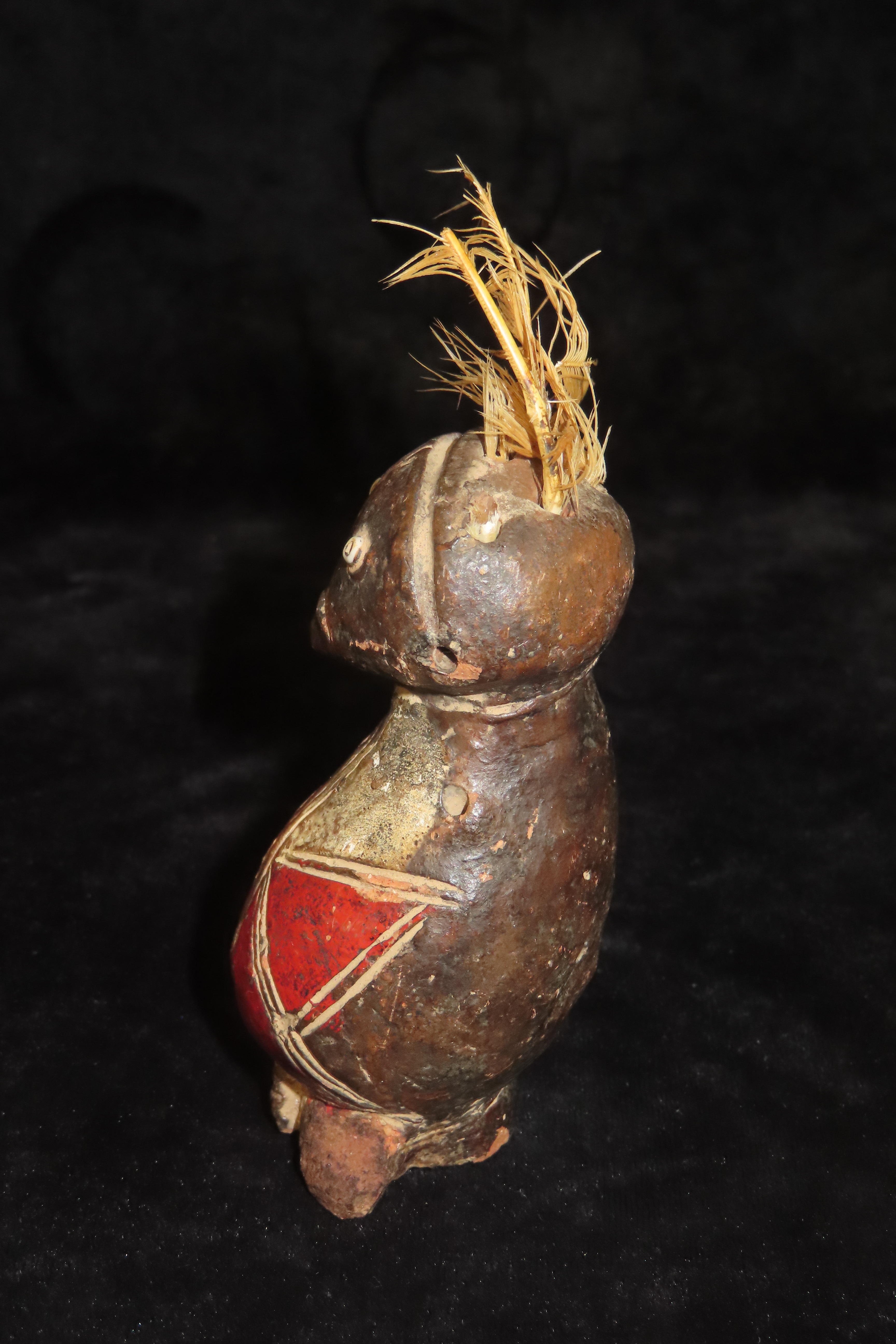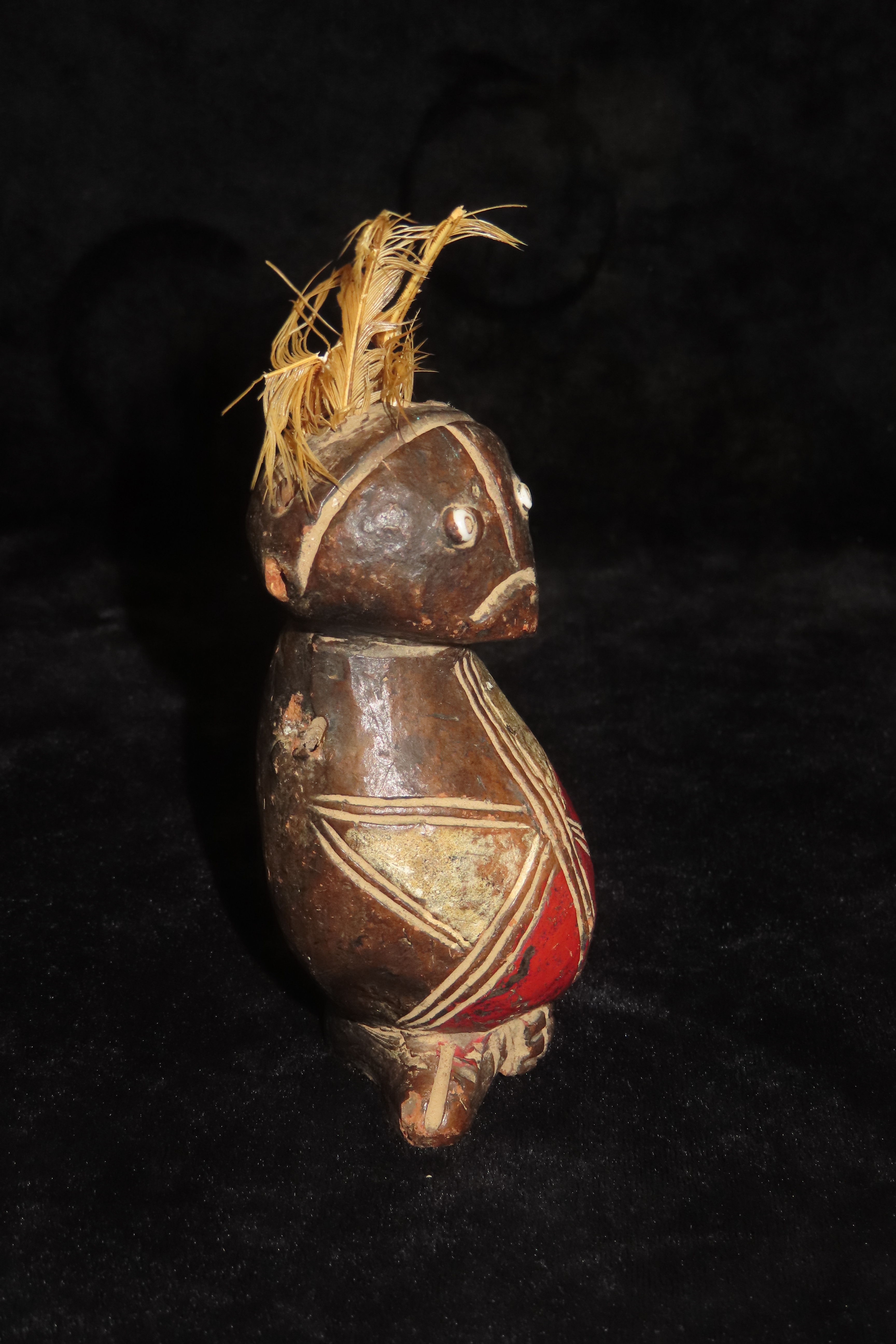 5″ African Fetish Doll, Cameroon, Tikar, Mambilla, Bomum, Painted Terracotta, Feather Headdress, missing arms and ear decorations.Glass Bead eyes.