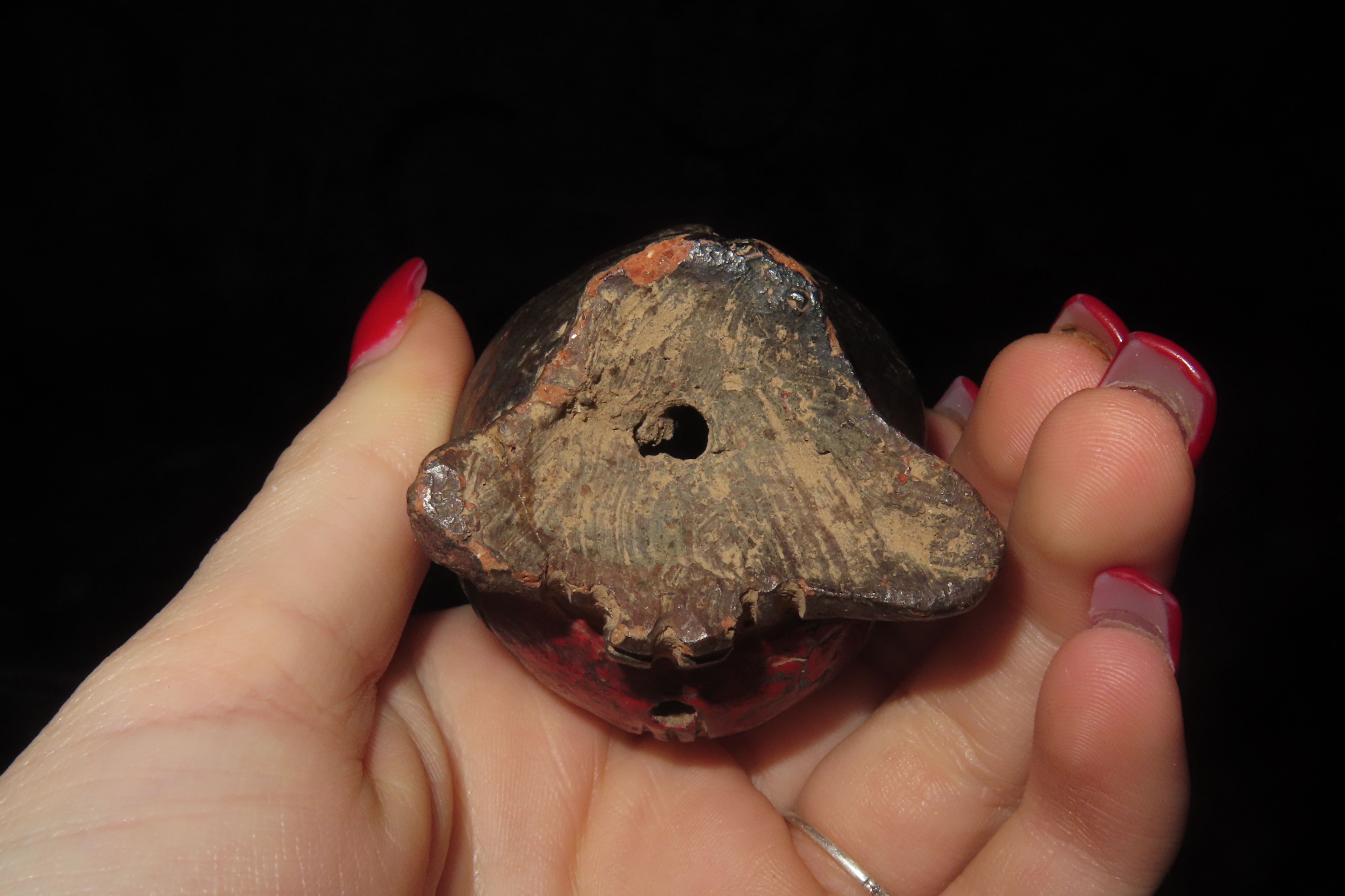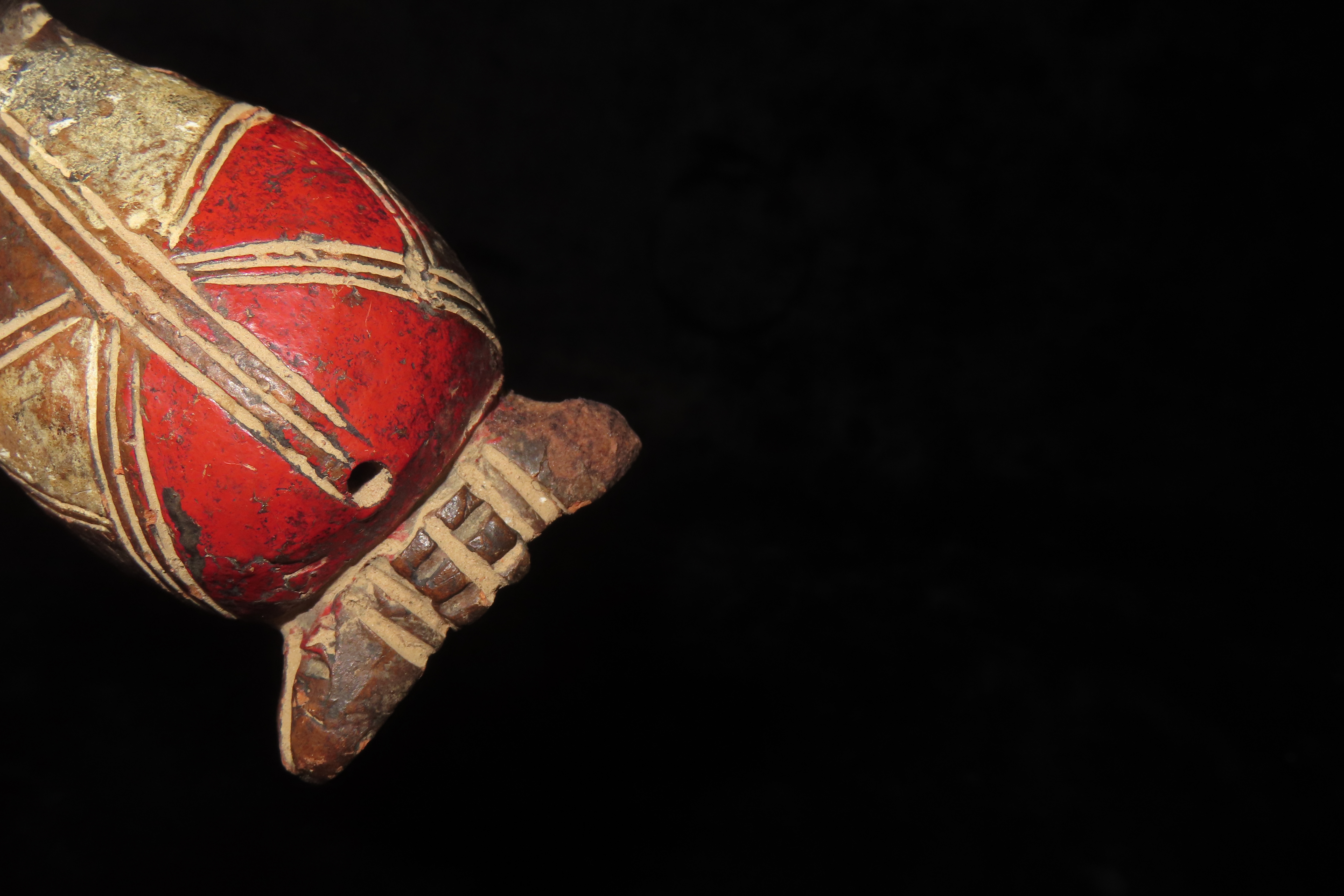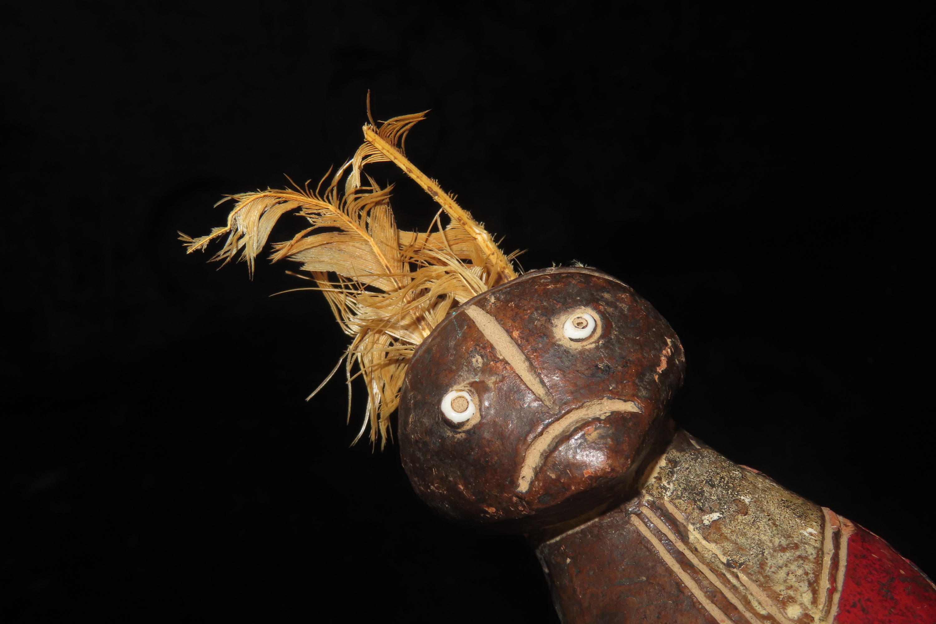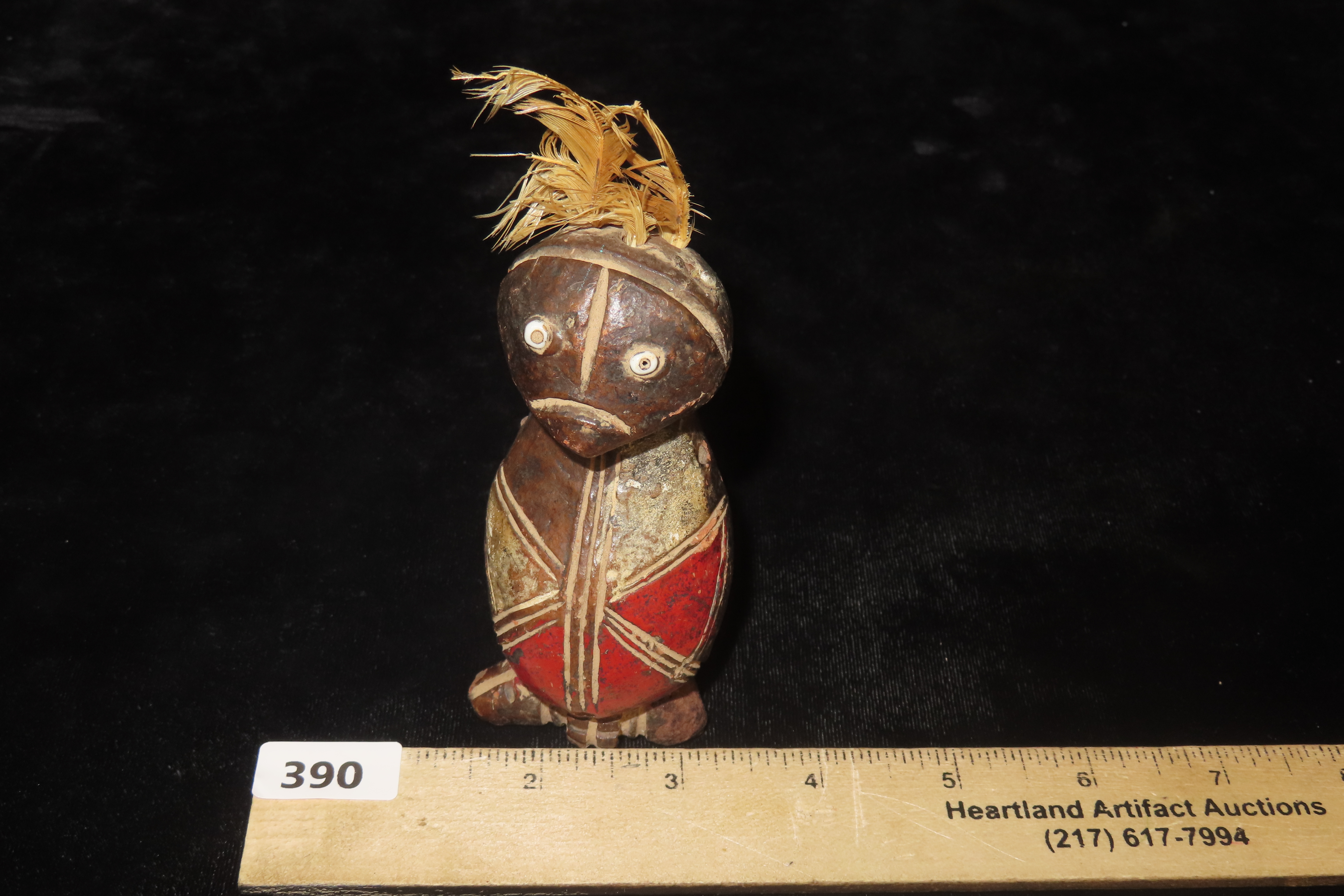 5″ African Fetish Doll, Cameroon, Tikar, Mambilla, Bomum, Painted Terracotta, Feather Headdress, missing arms and ear decorations.Glass Bead eyes.