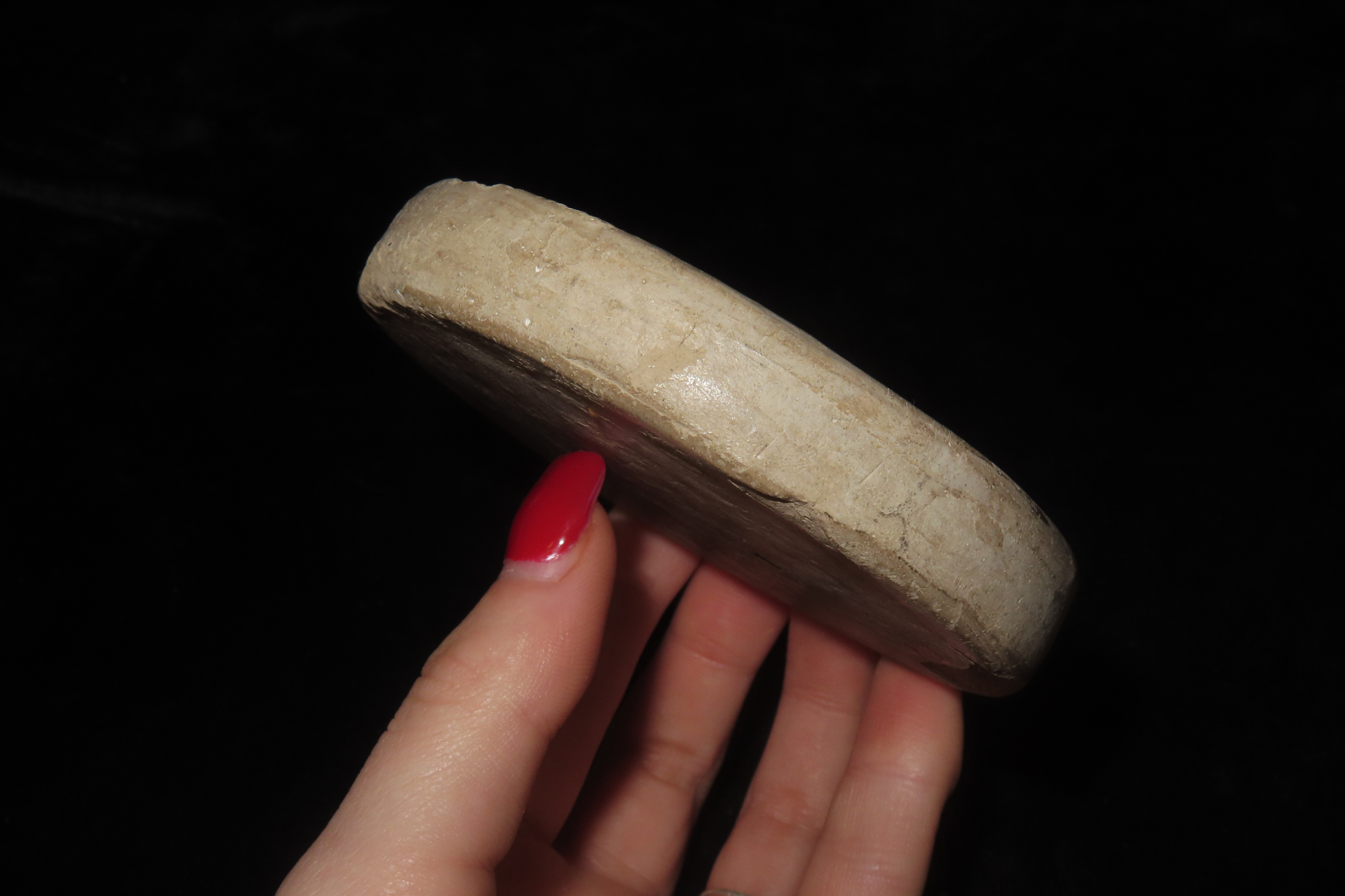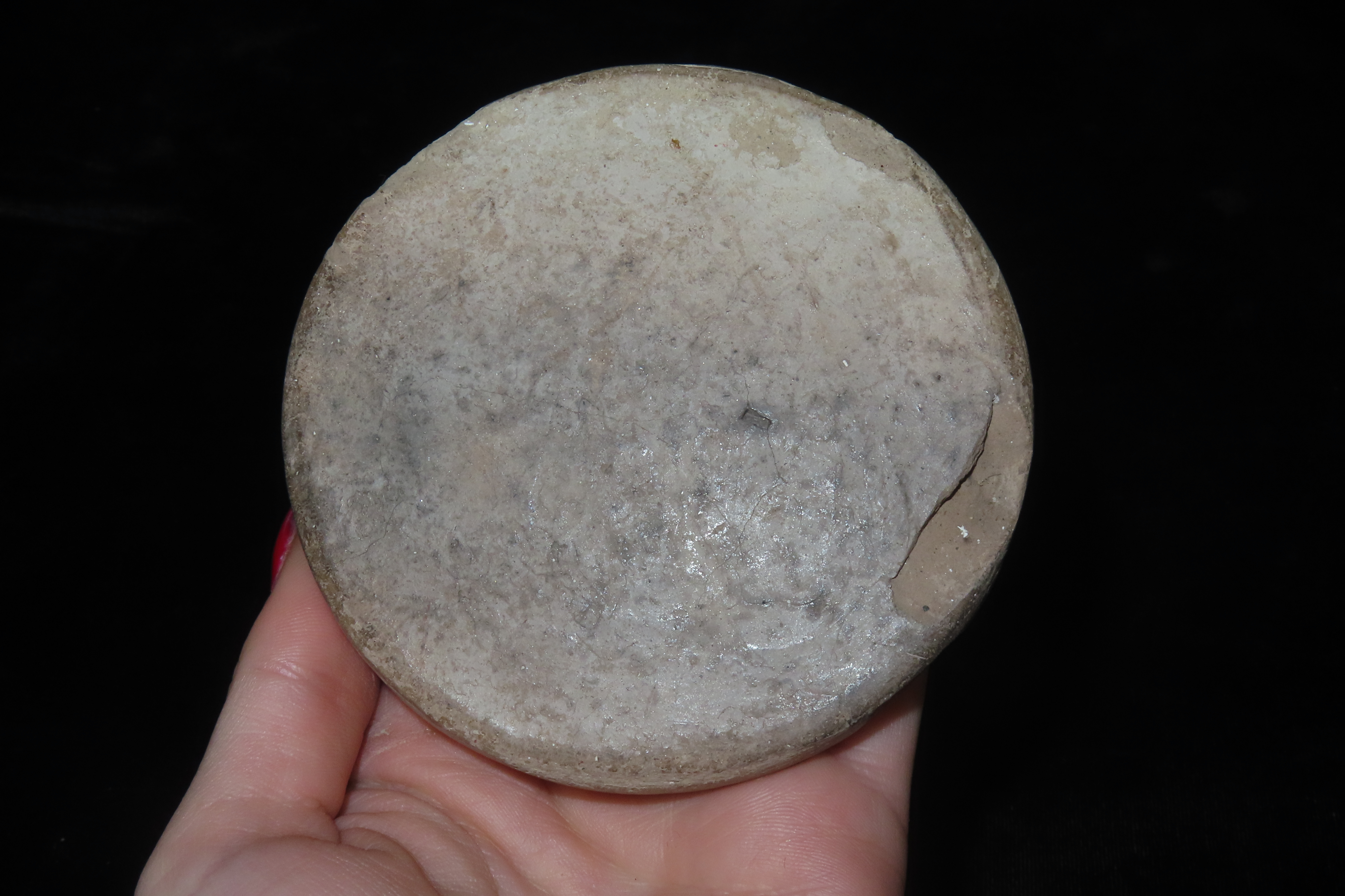 3 1/2″ Turbah, or prayer stone, a Shi’a Islamic artifact used during daily prayers. These are typically made from the clay of Karbala, a holy city in Iraq. The artifact is a circular, sun-dried clay disc with intricate, molded relief.The central image depicts a mosque structure with a dome and two flanking minarets.Arabic calligraphy surrounds the central image and is also featured in an oval cartouche at the bottom of the disc. The inscriptions often contain religious phrases, such as the Shahada (“There’s no god but Allah, Muhammad is the messenger of Allah”). Turbahs provide a clean surface of natural earth on which to place the forehead during sujood (prostration), which is a required part of the daily prayers.