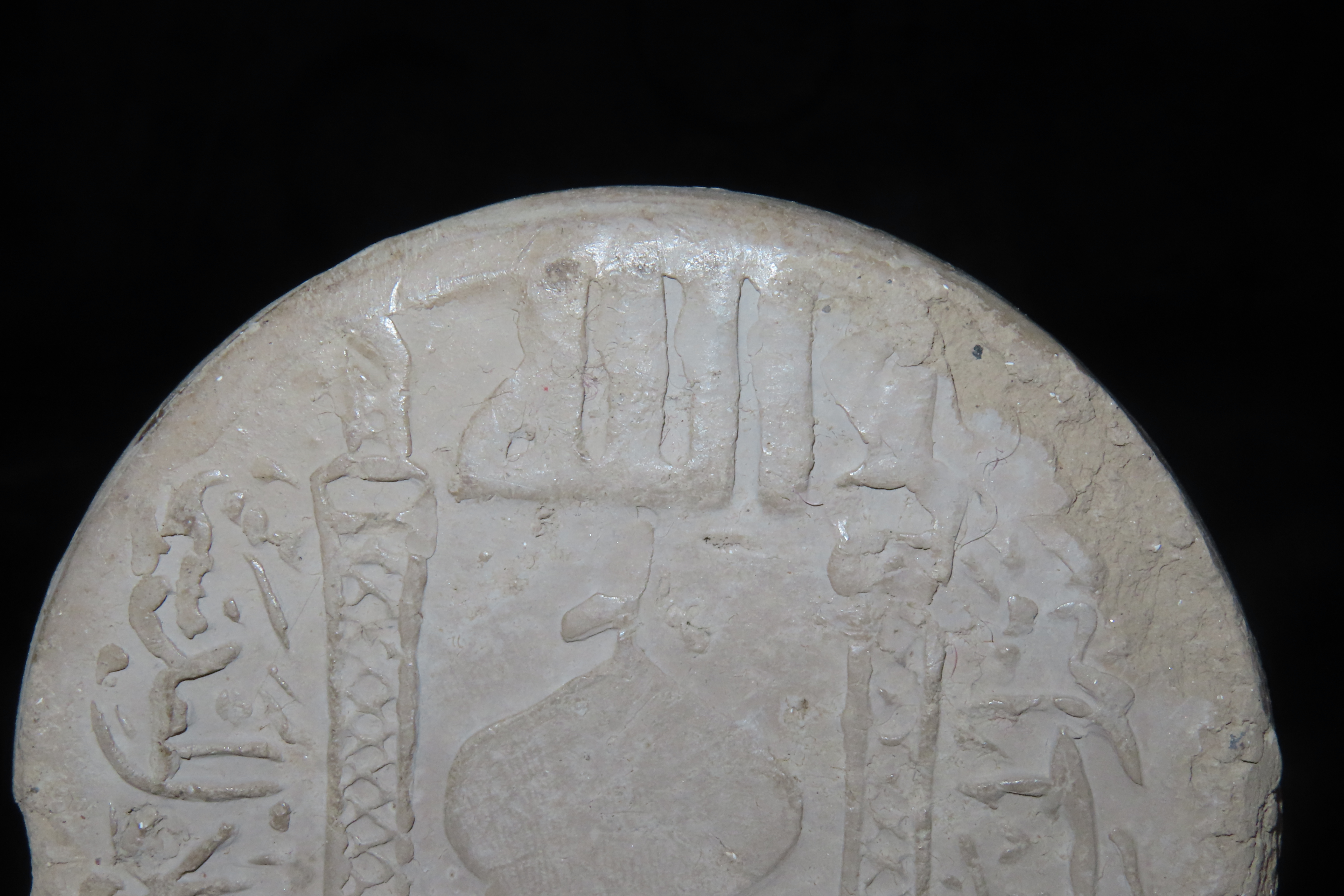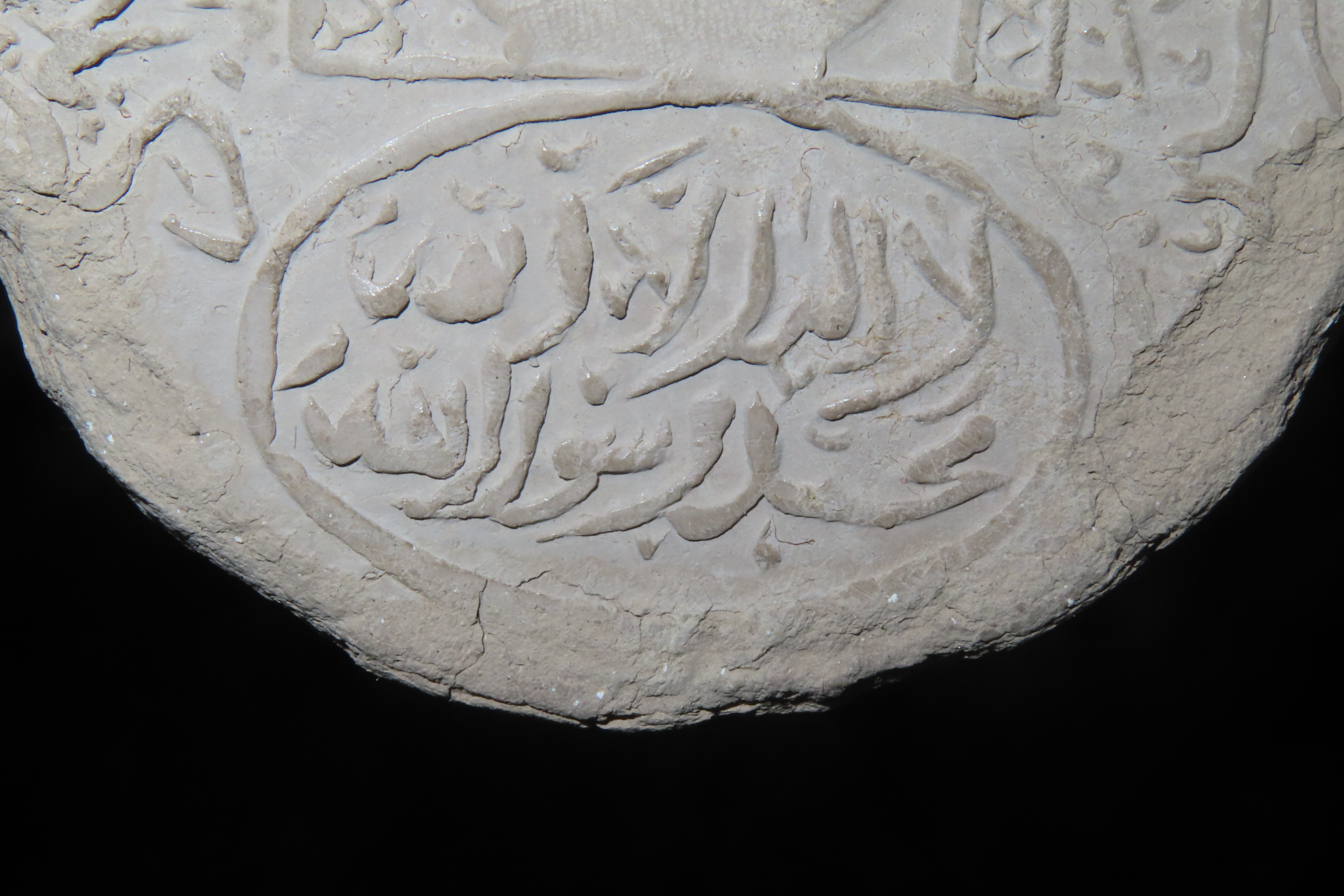 3 1/2" Turbah, or prayer stone, a Shi'a Islamic artifact used during daily prayers. These are typically made from the clay of Karbala, a holy city in Iraq. The artifact is a circular, sun-dried clay disc with intricate, molded relief.The central image dep