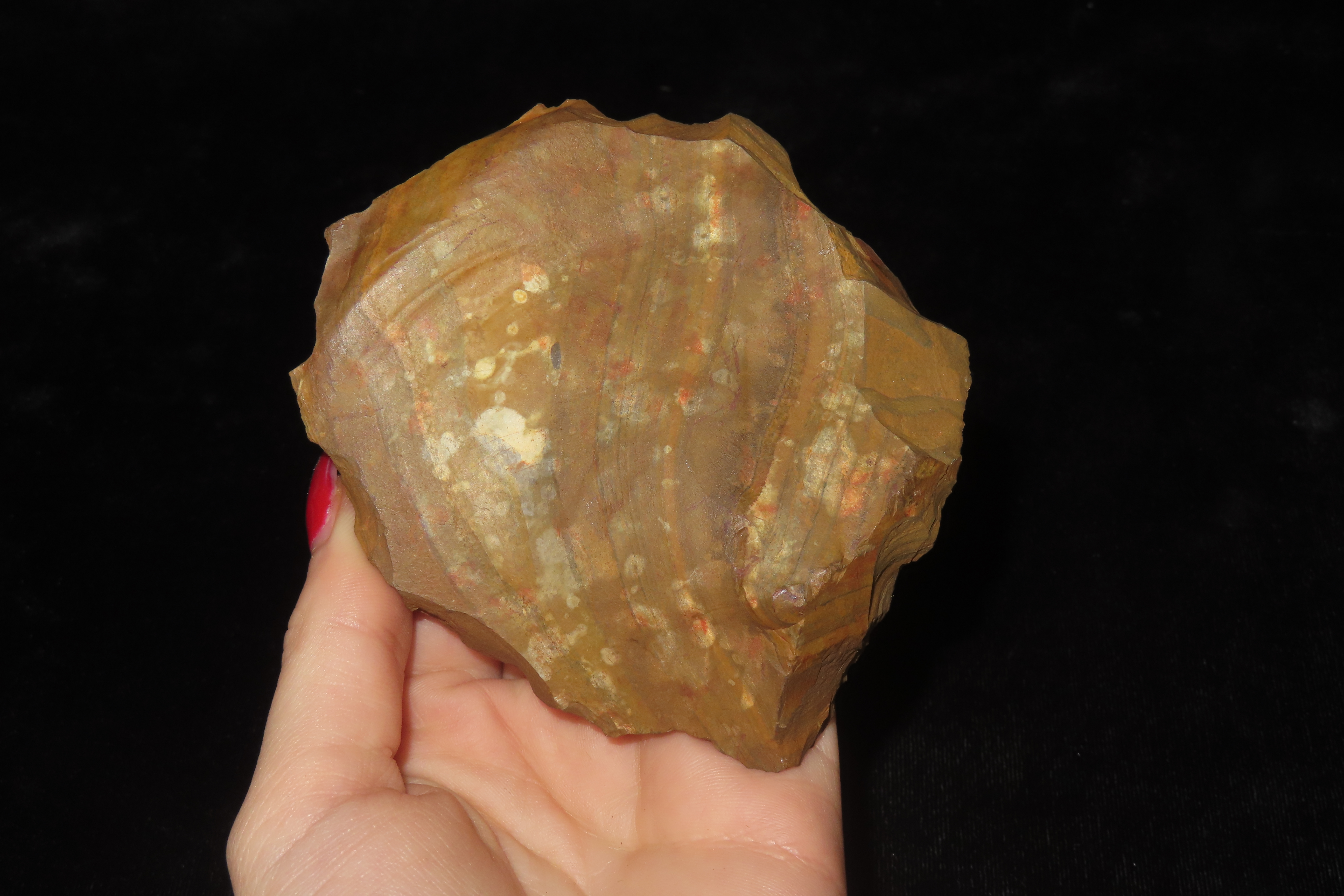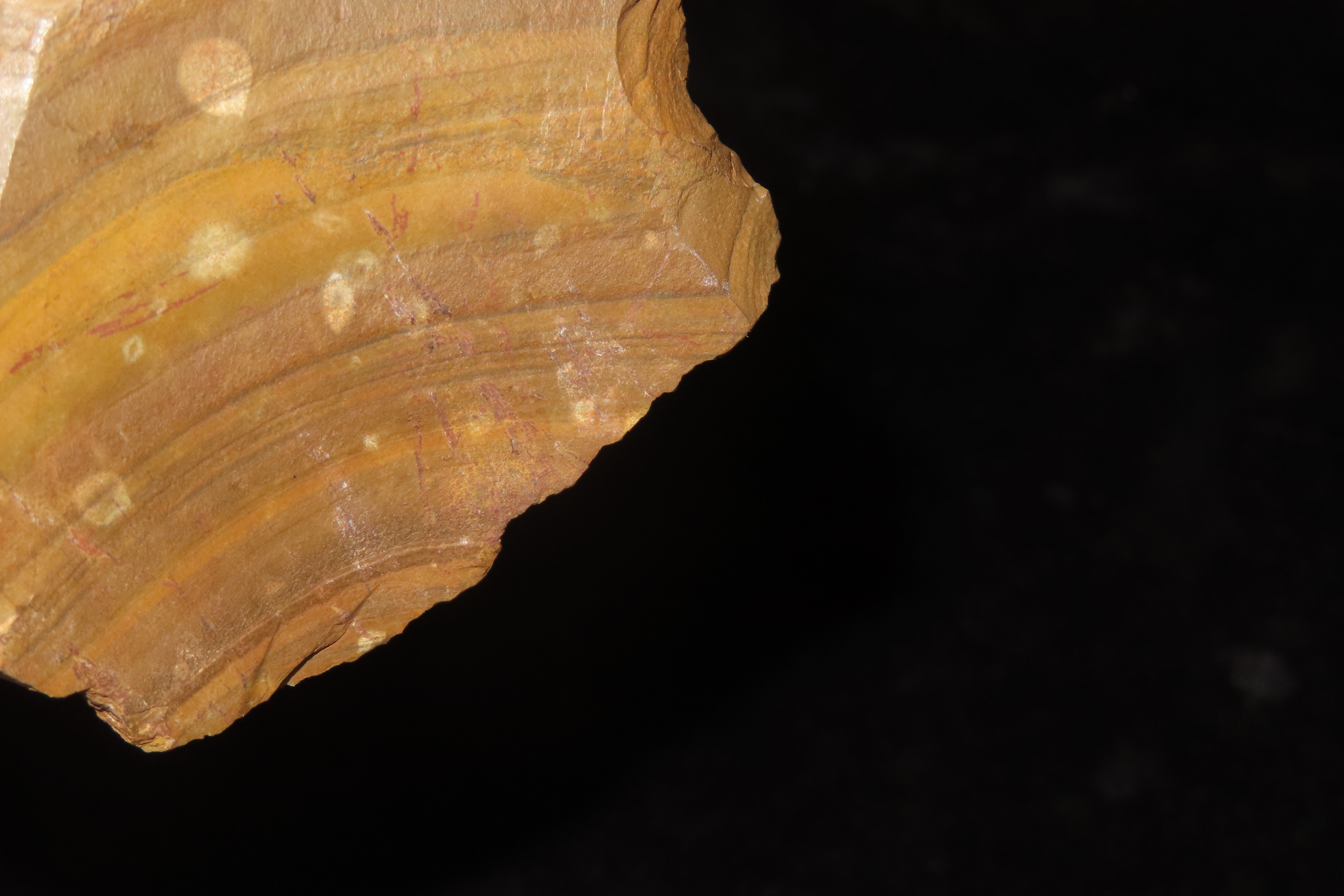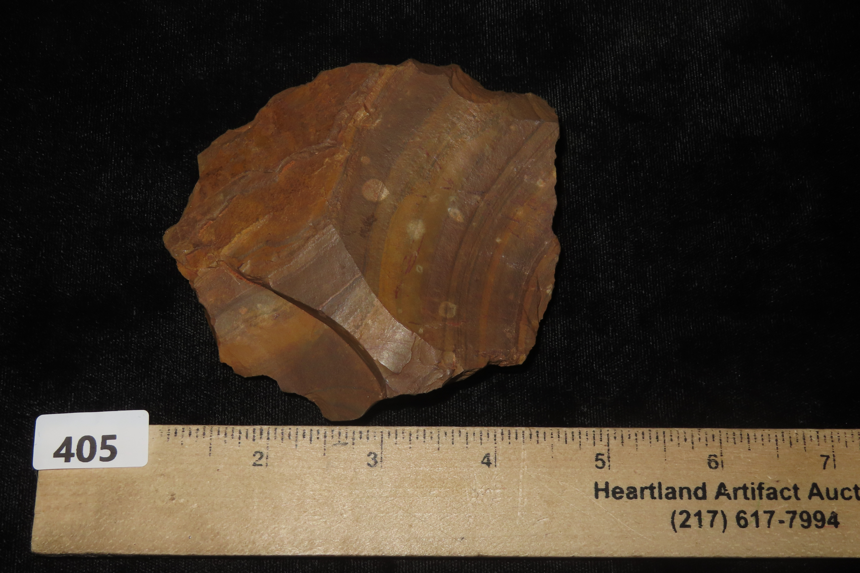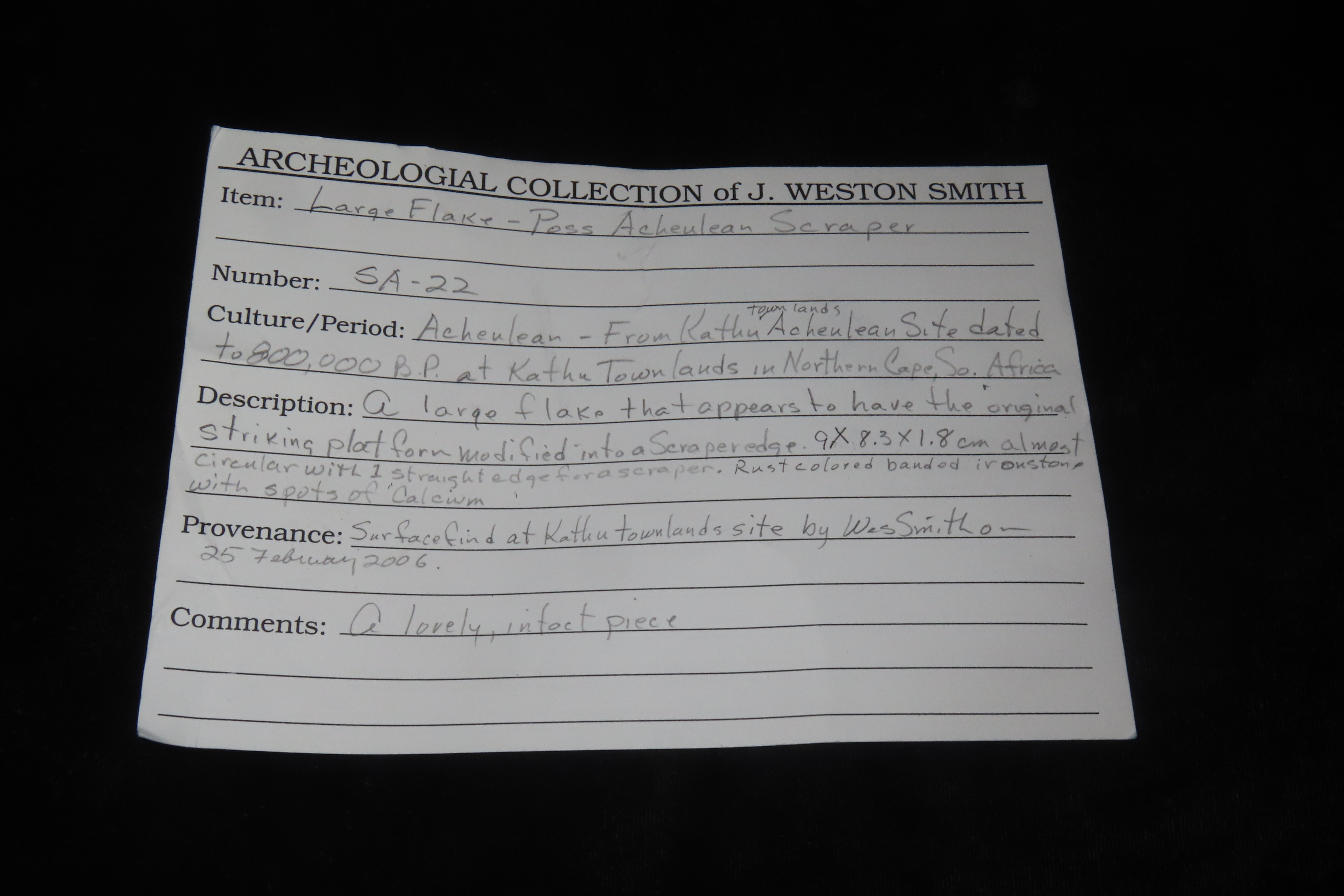 3 1/2″ x 3 1/4″ x 3/4″ Acheulean Flake Scraper/Blade, found at Kathu Townlands Site, Northern Cape Province, South Africa by Wes Smith 2/25/06.