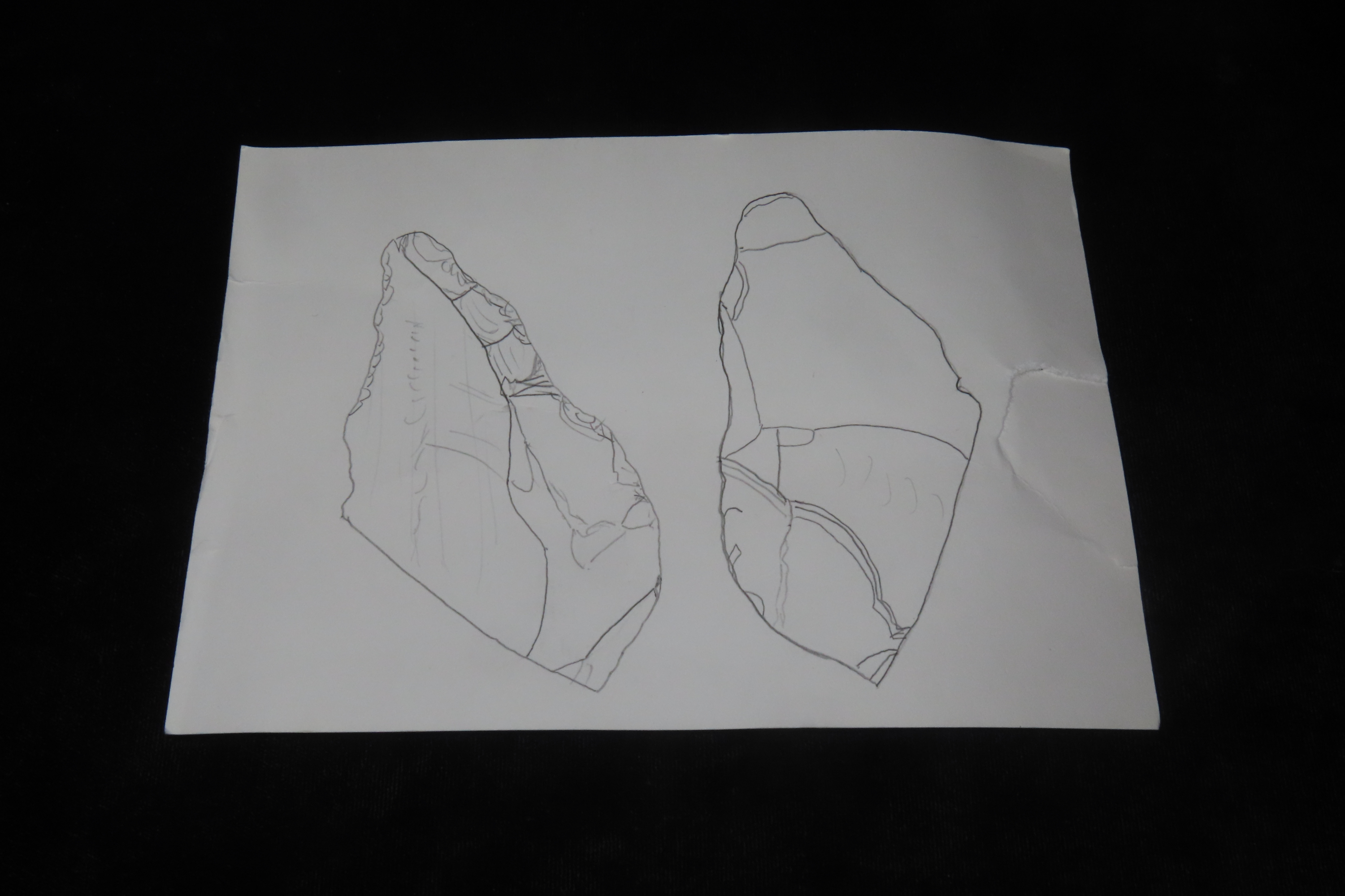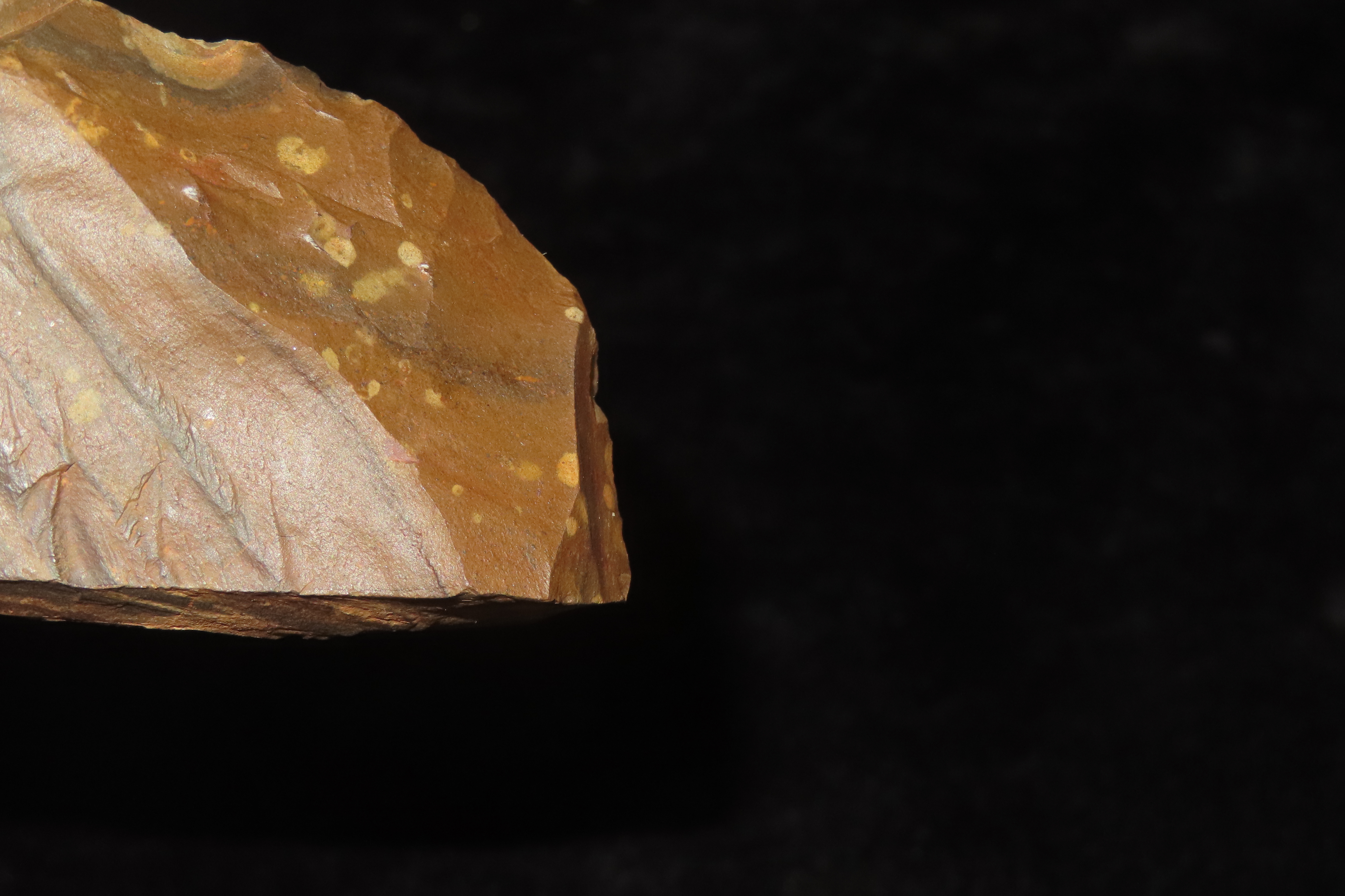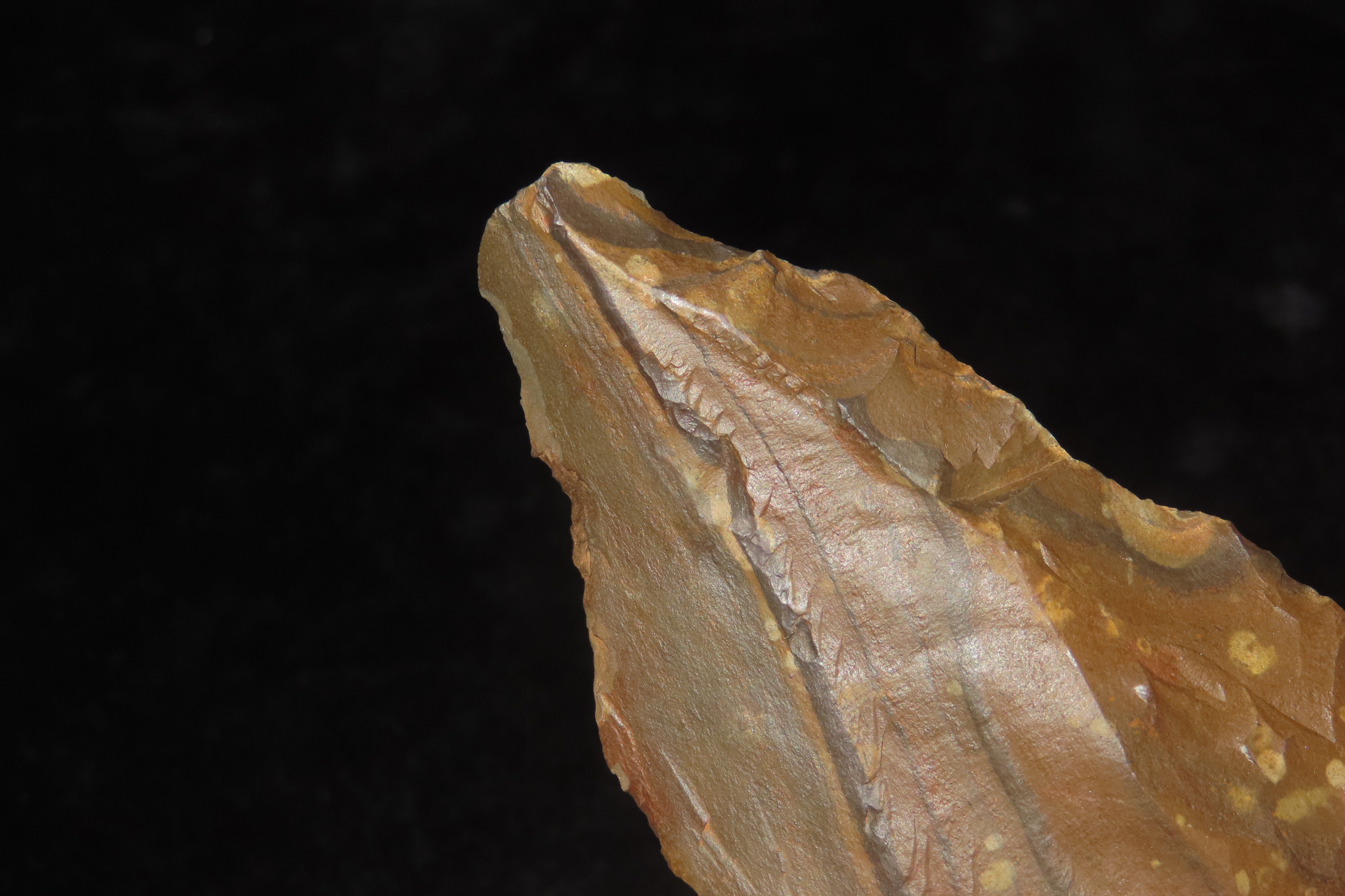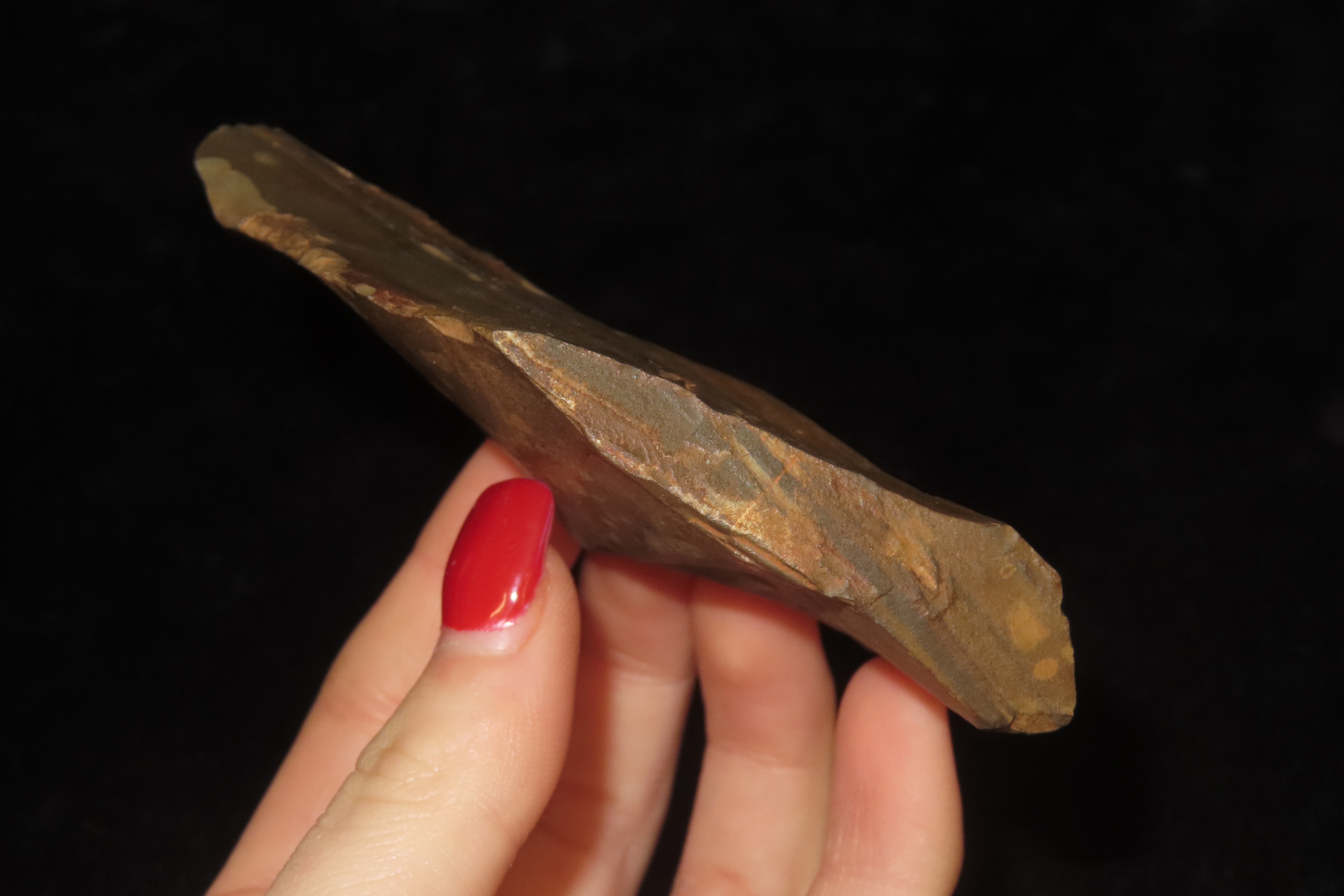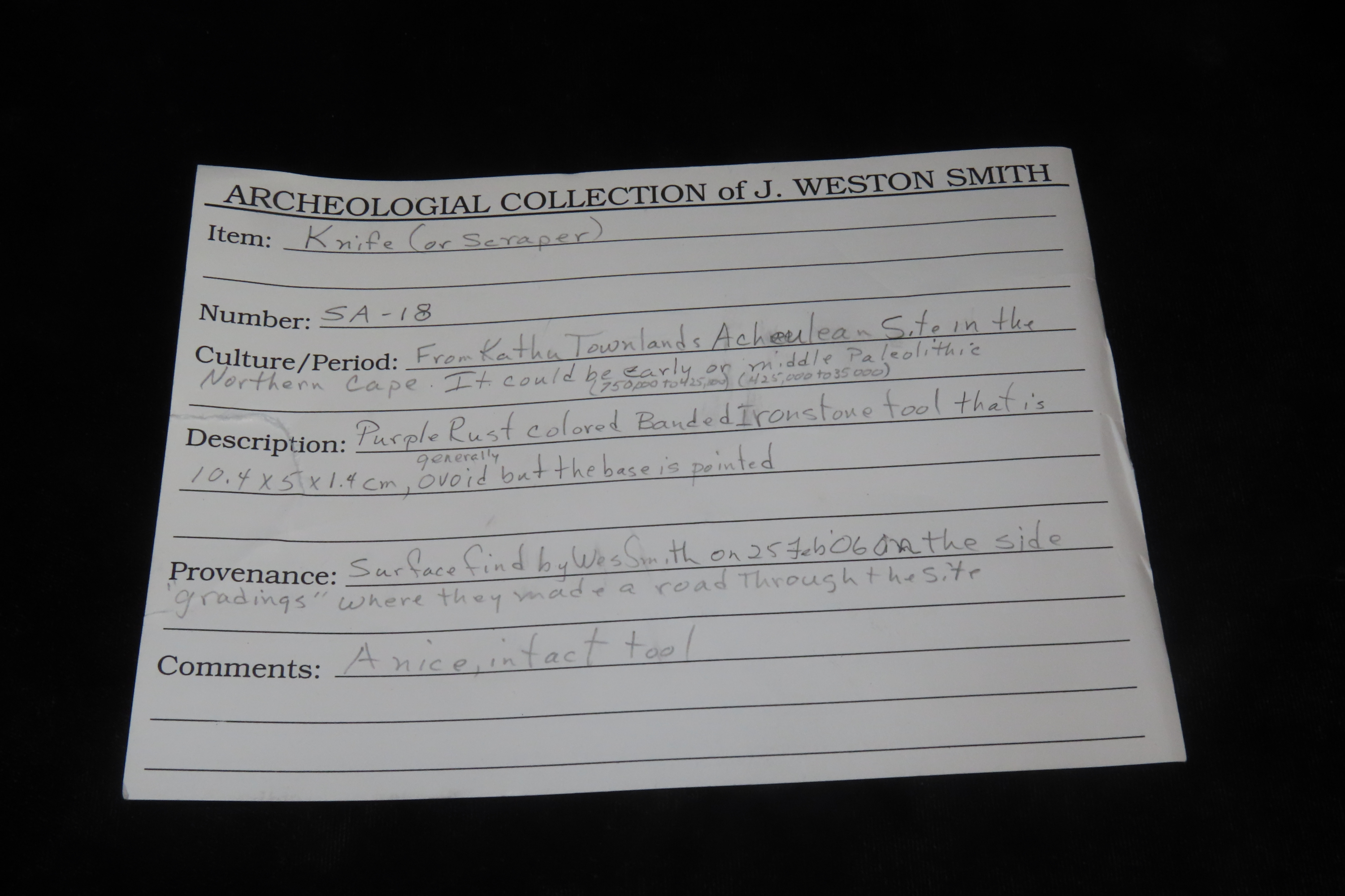 4 1/8″ x 1 7/8″ x 1/2″ Acheulean Knife/Scraper, found at Kathu Townlands Site, Northern Cape Province, South Africa by Wes Smith 2/25/06.