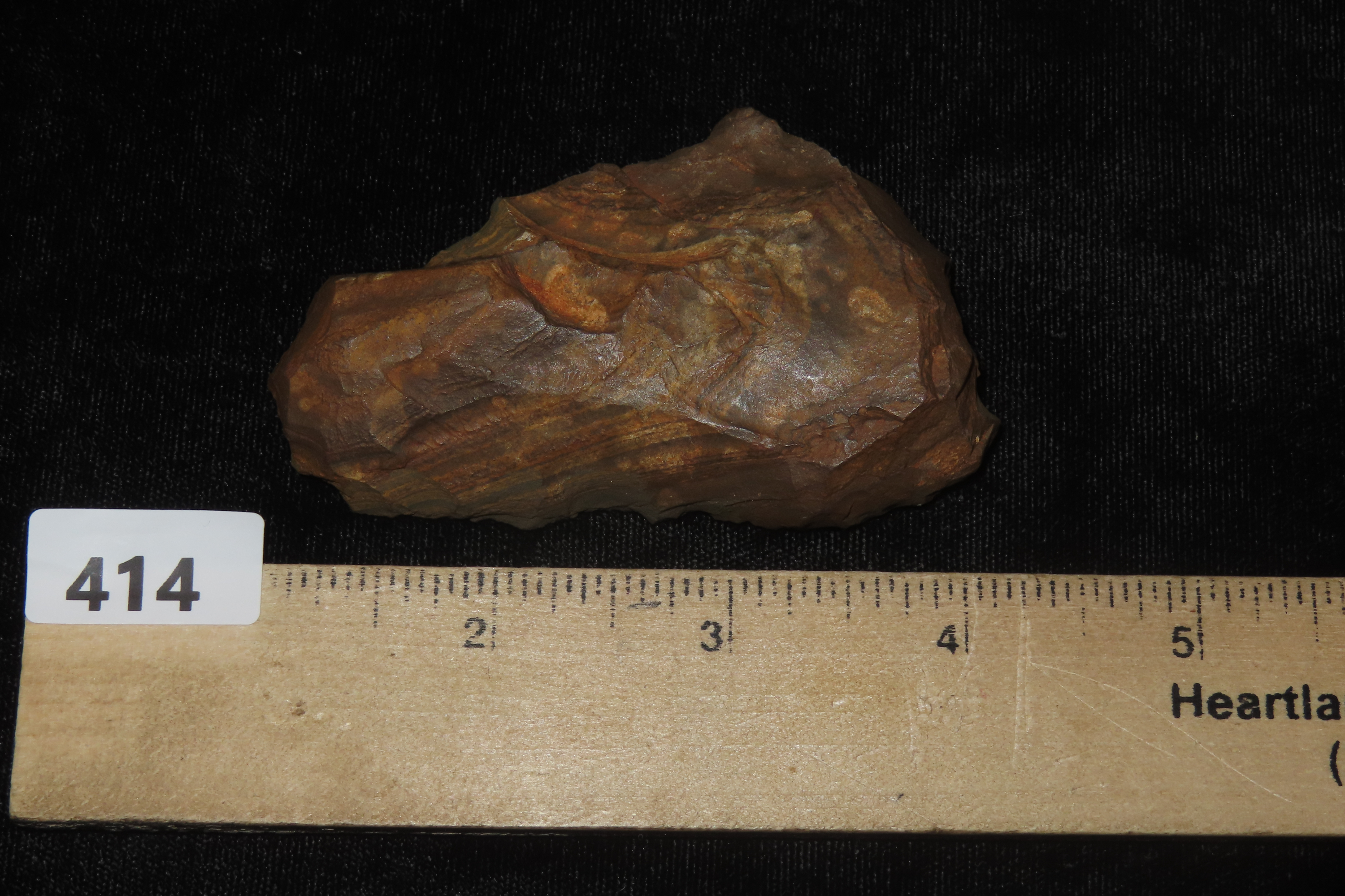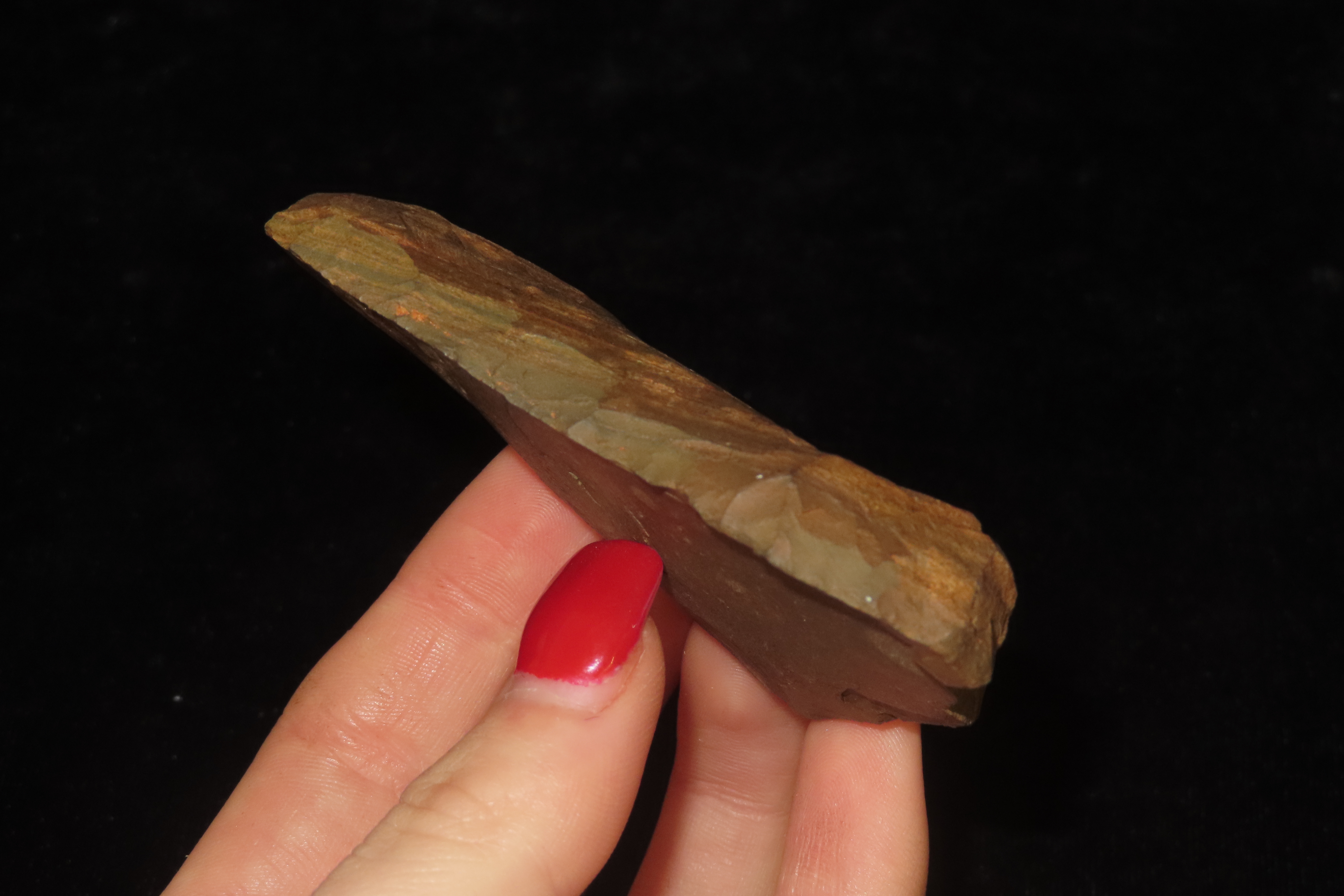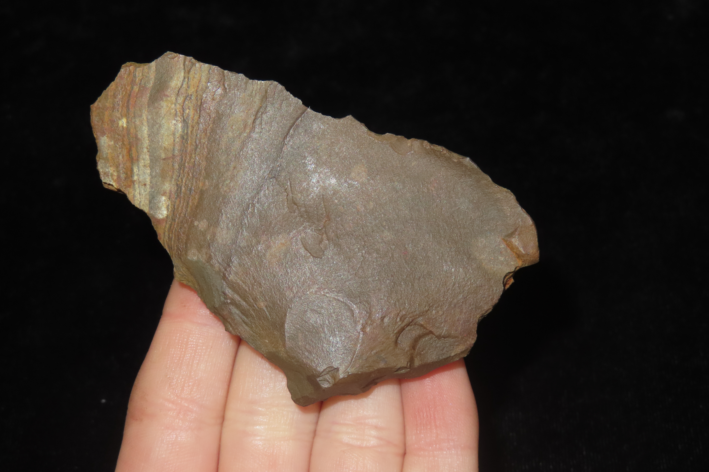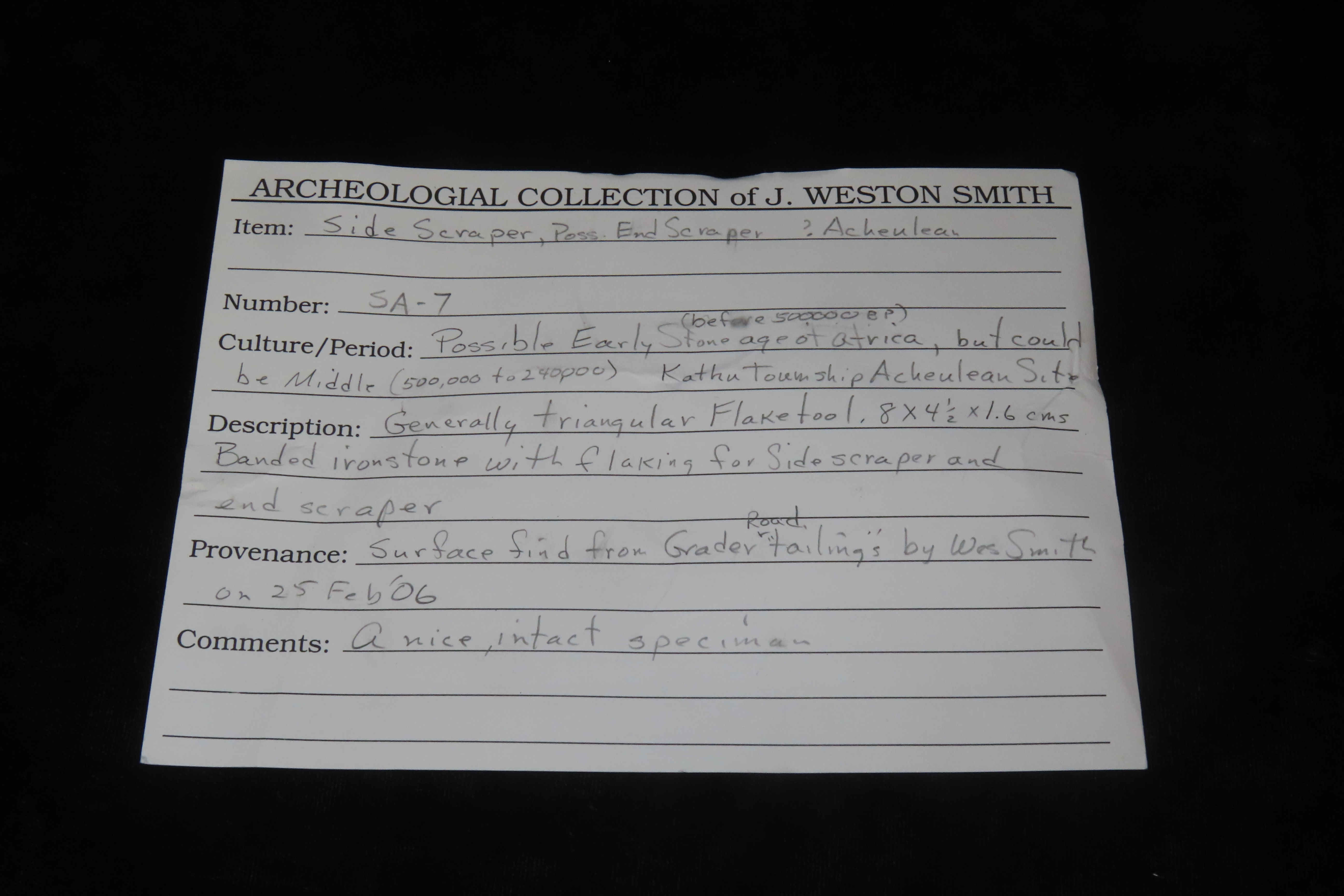 3 1/4″ x 1 3/4″ x 5/8″ Acheulean Side or End Scraper, found at Kathu Townlands Site, Northern Cape Province, South Africa by Wes Smith 2/25/06.