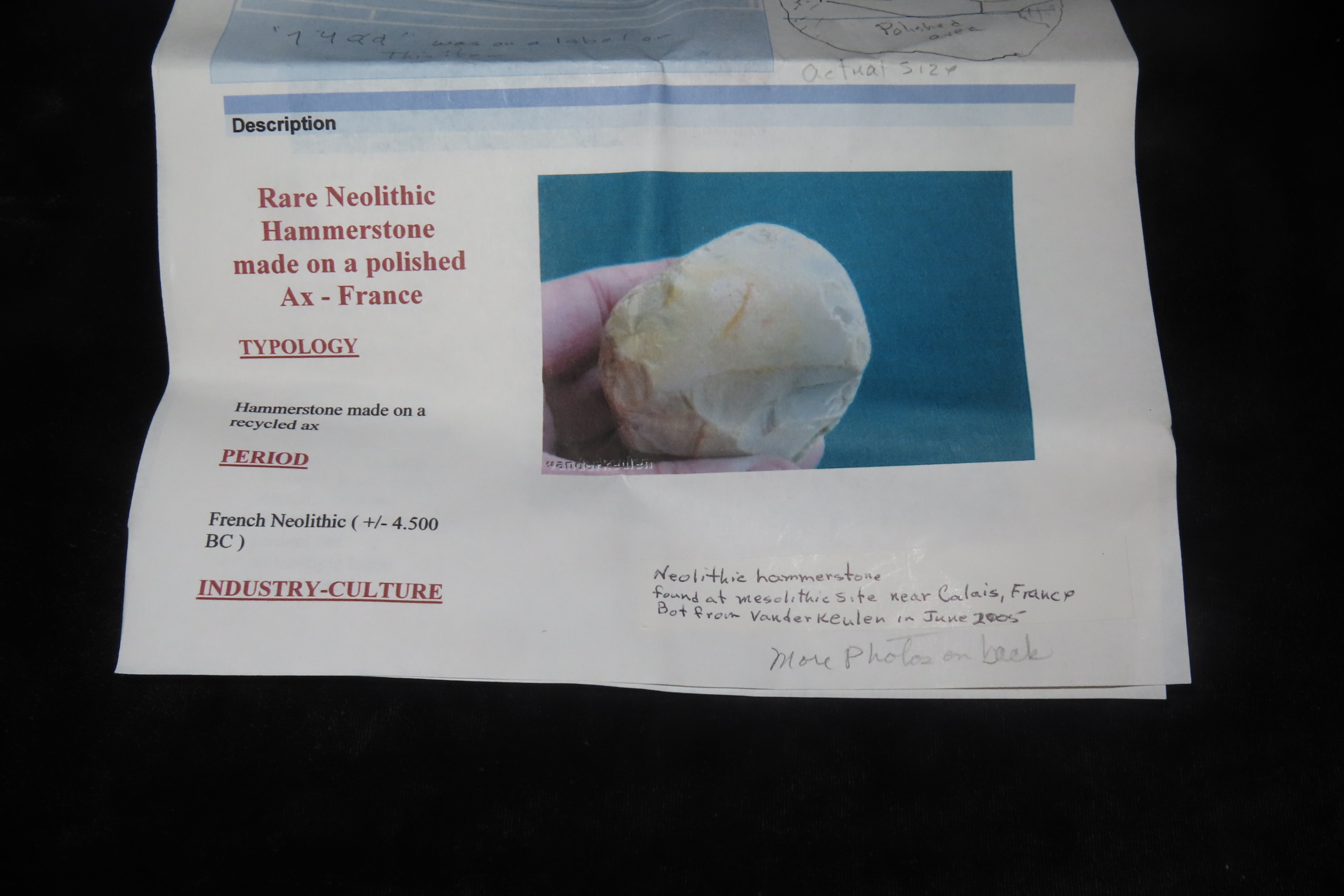2 1/2″ x 2 1/2″ x 1 3/8″ Neolithic Hammerstone, found at Mesolithic Site near Calais