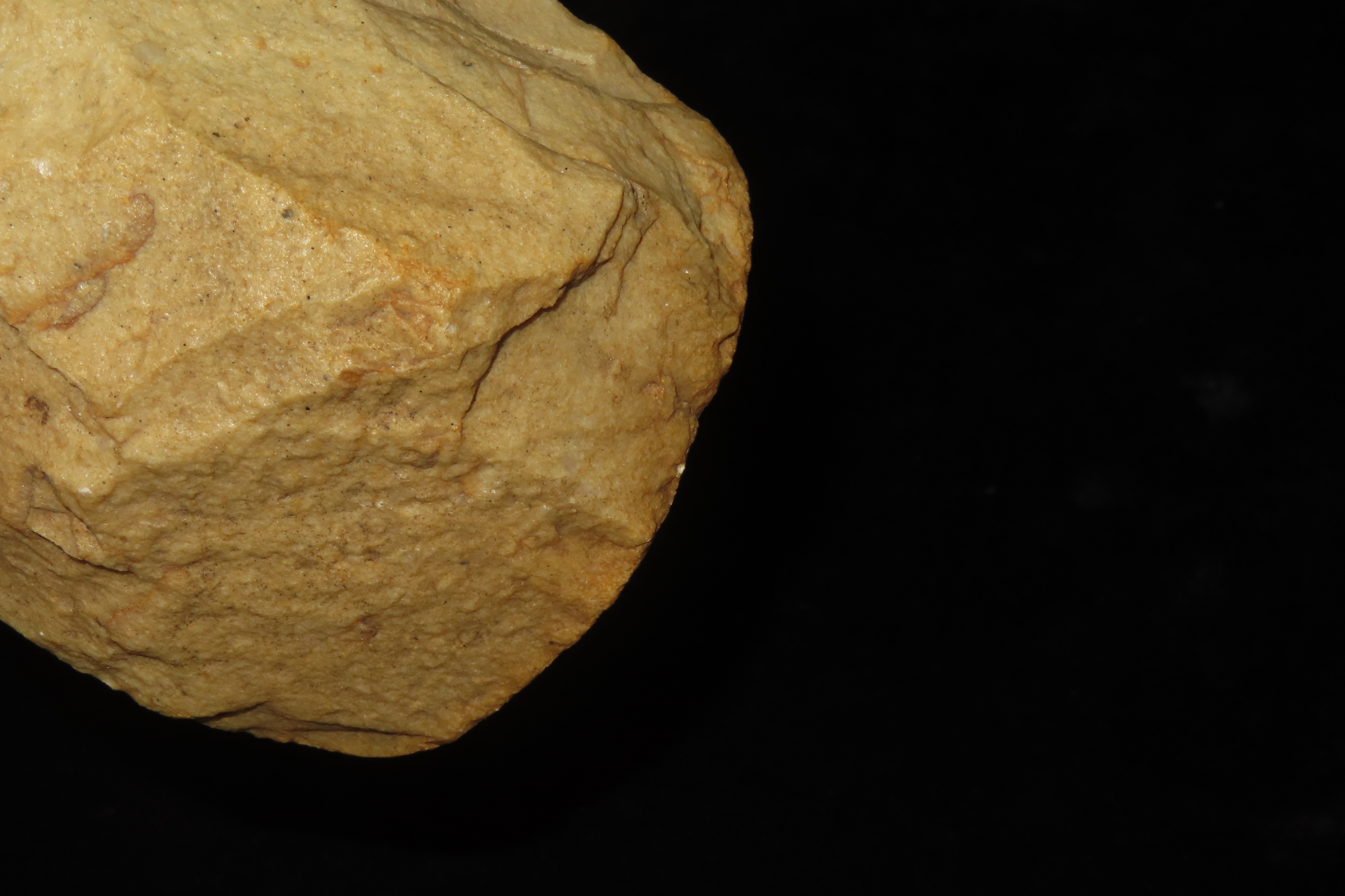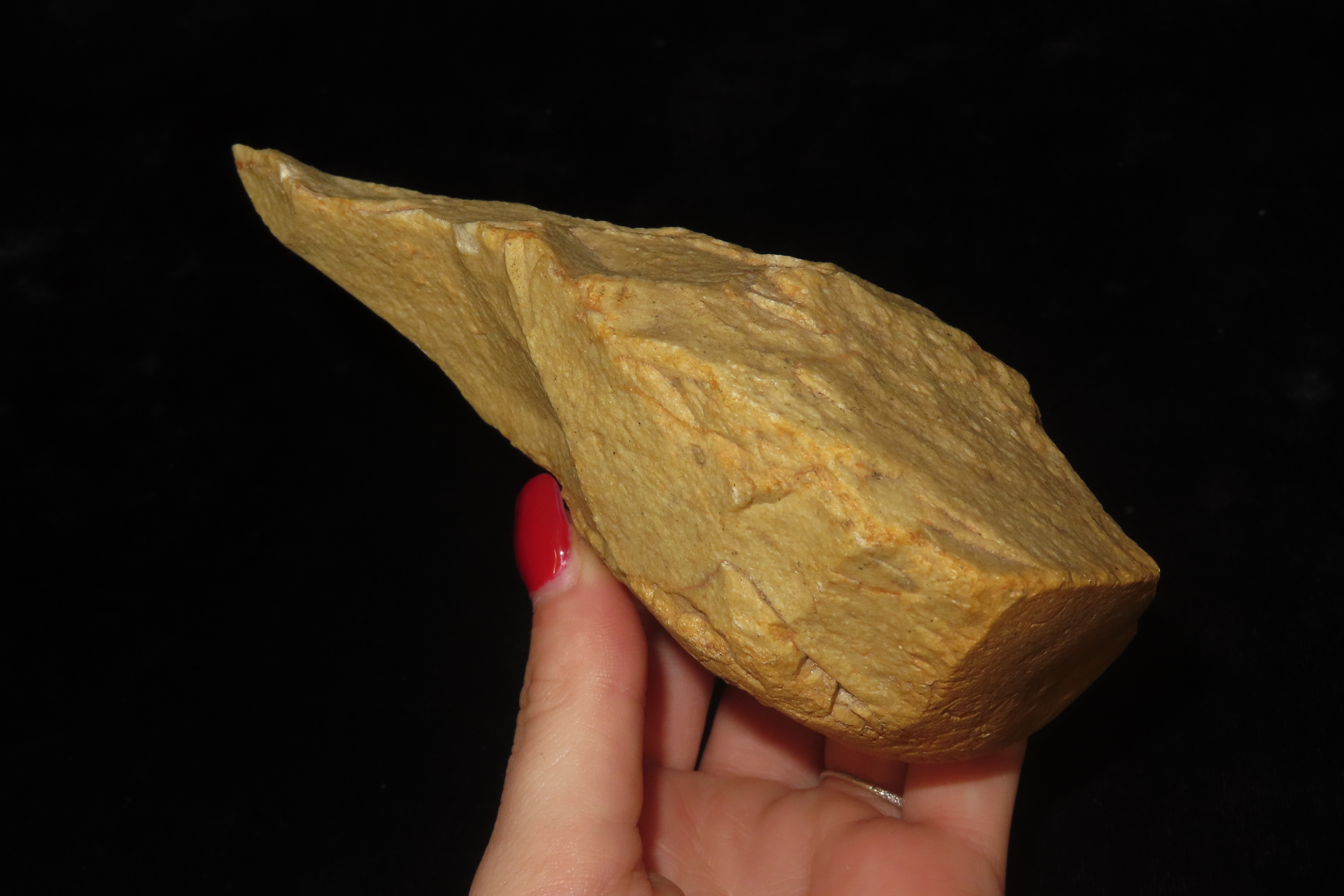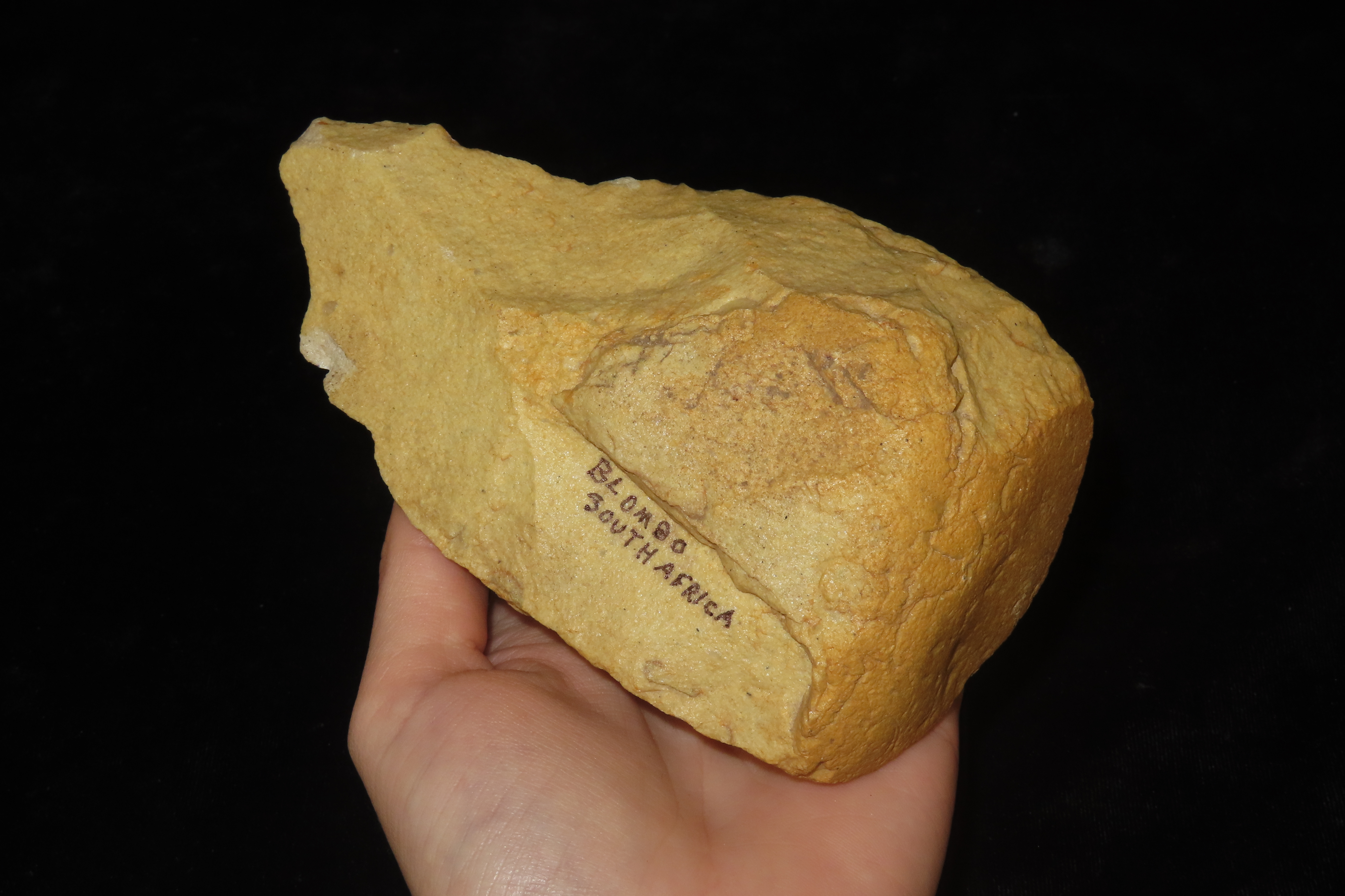 5 1/3″ x 3″ Hand Axe, Found near Blombos Cave in South Africa-Blombos Cave, located on South Africa’s southern coast, is a crucial Middle Stone Age archaeological site revealing early modern human behavior through finds like the oldest known drawings (73,000 years old), perforated shell beads for body decoration, sophisticated bone tools, and ancient “paint factories” (ochre, shell containers, grinding tools), demonstrating complex thought and symbolic culture over 100,000 years ago