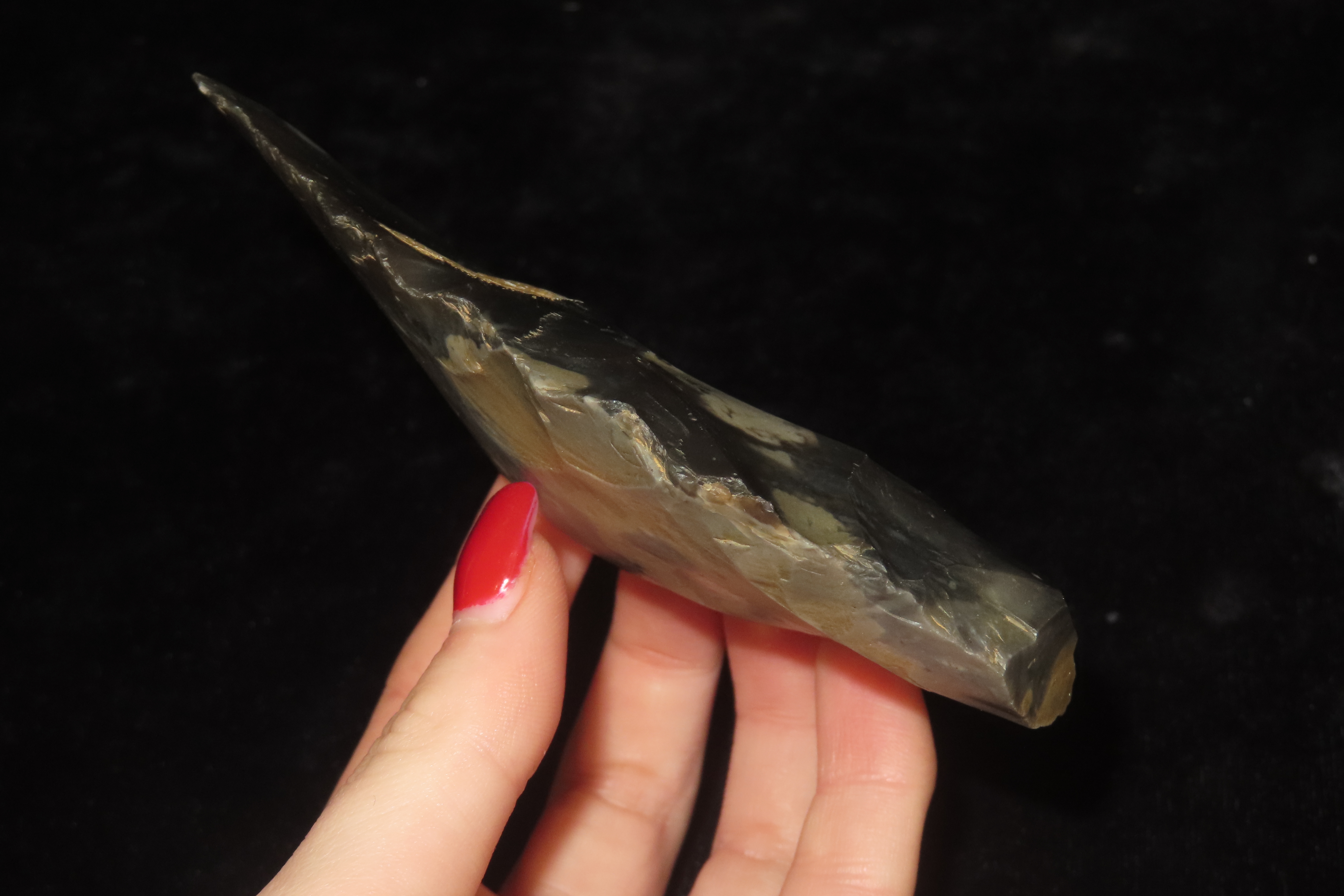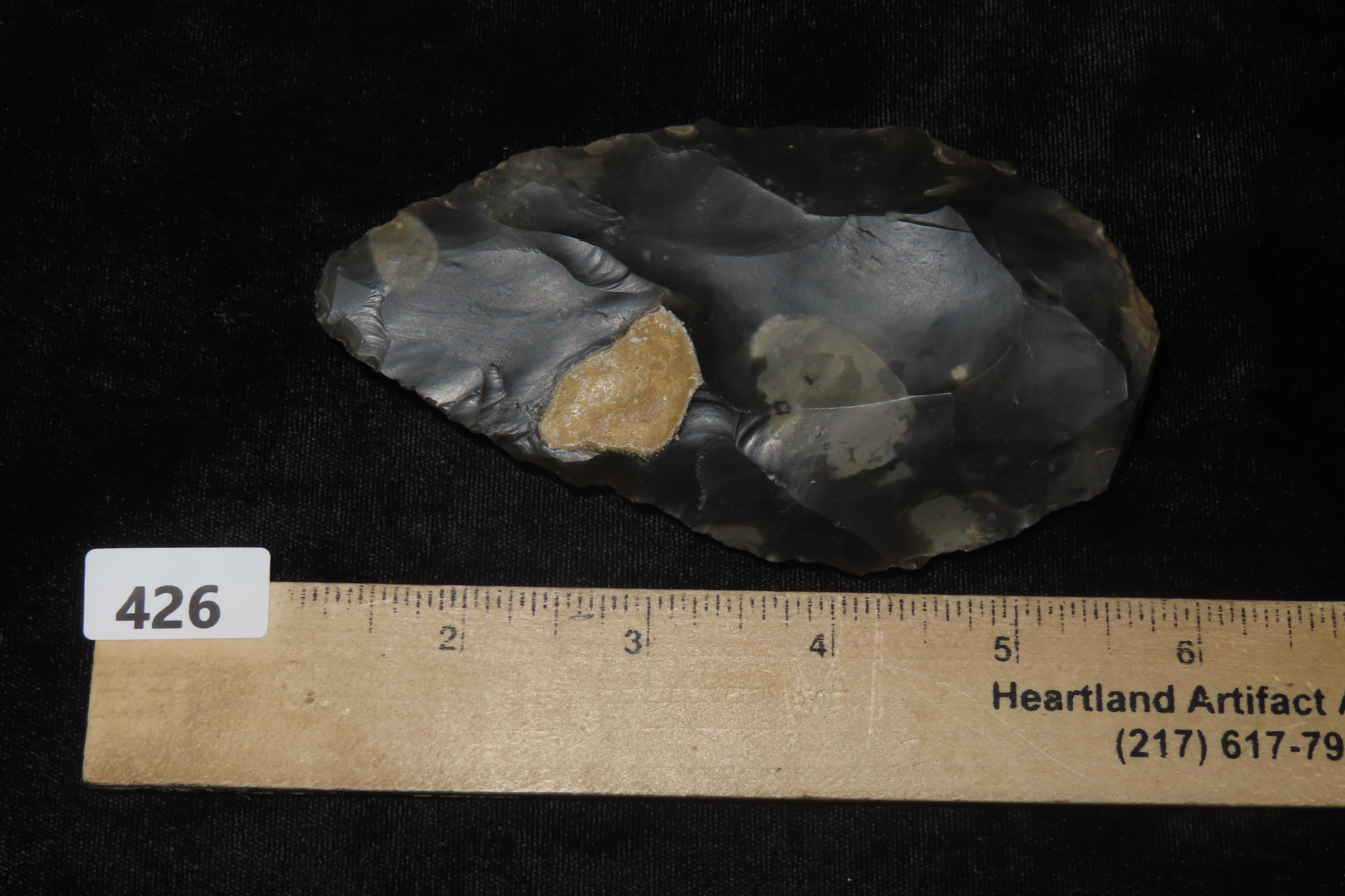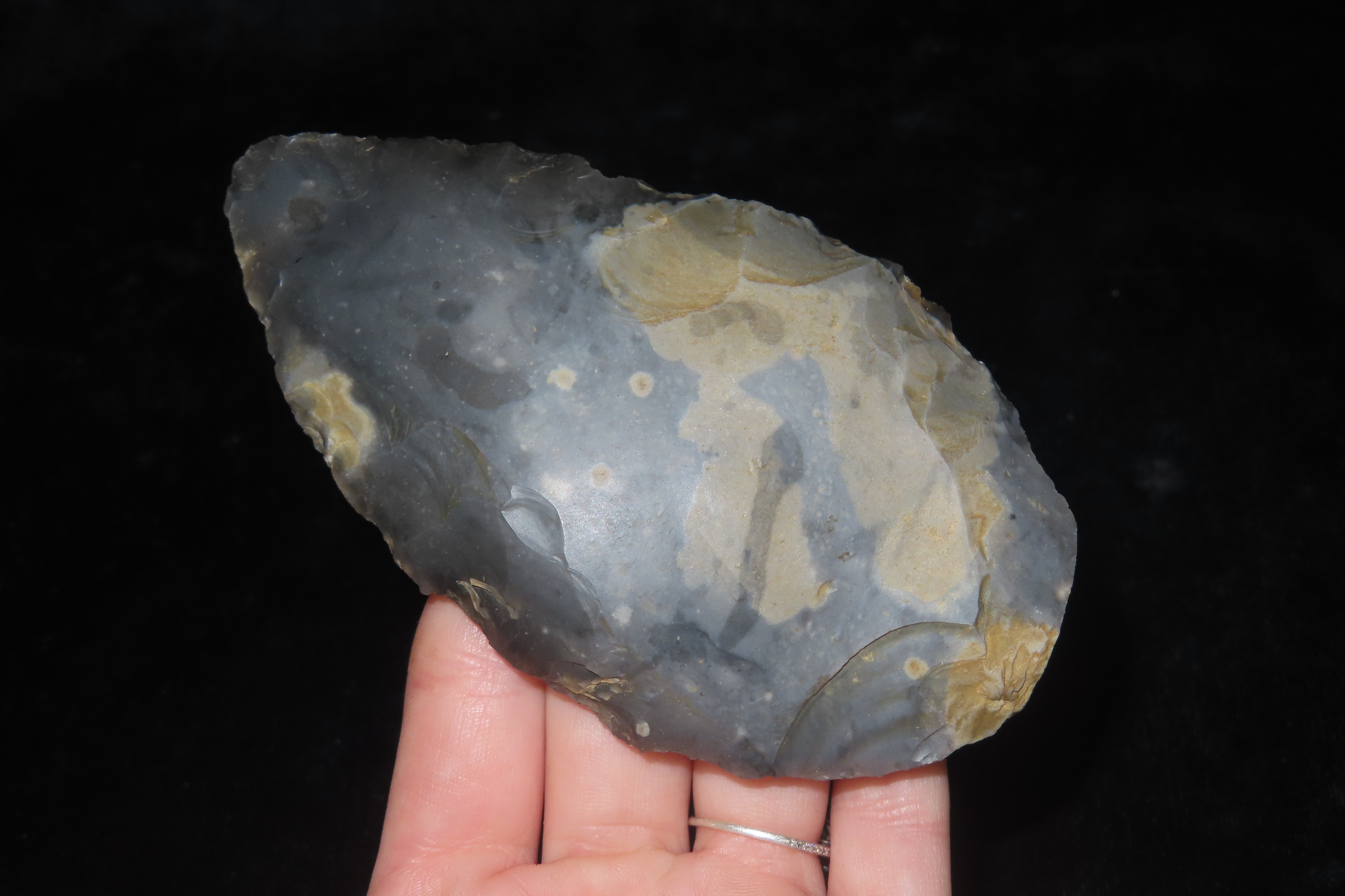 4 5/8″ x 2 1/2″ Acheulean Hand Axe, Paleolithic, Elongated Cordiform Shape of Spotted Blue/Black Flint, Found at Warren Hill, Mildenhall, NW Sussex, Ex Henry Dewey, Fenton, Richard Widdowson