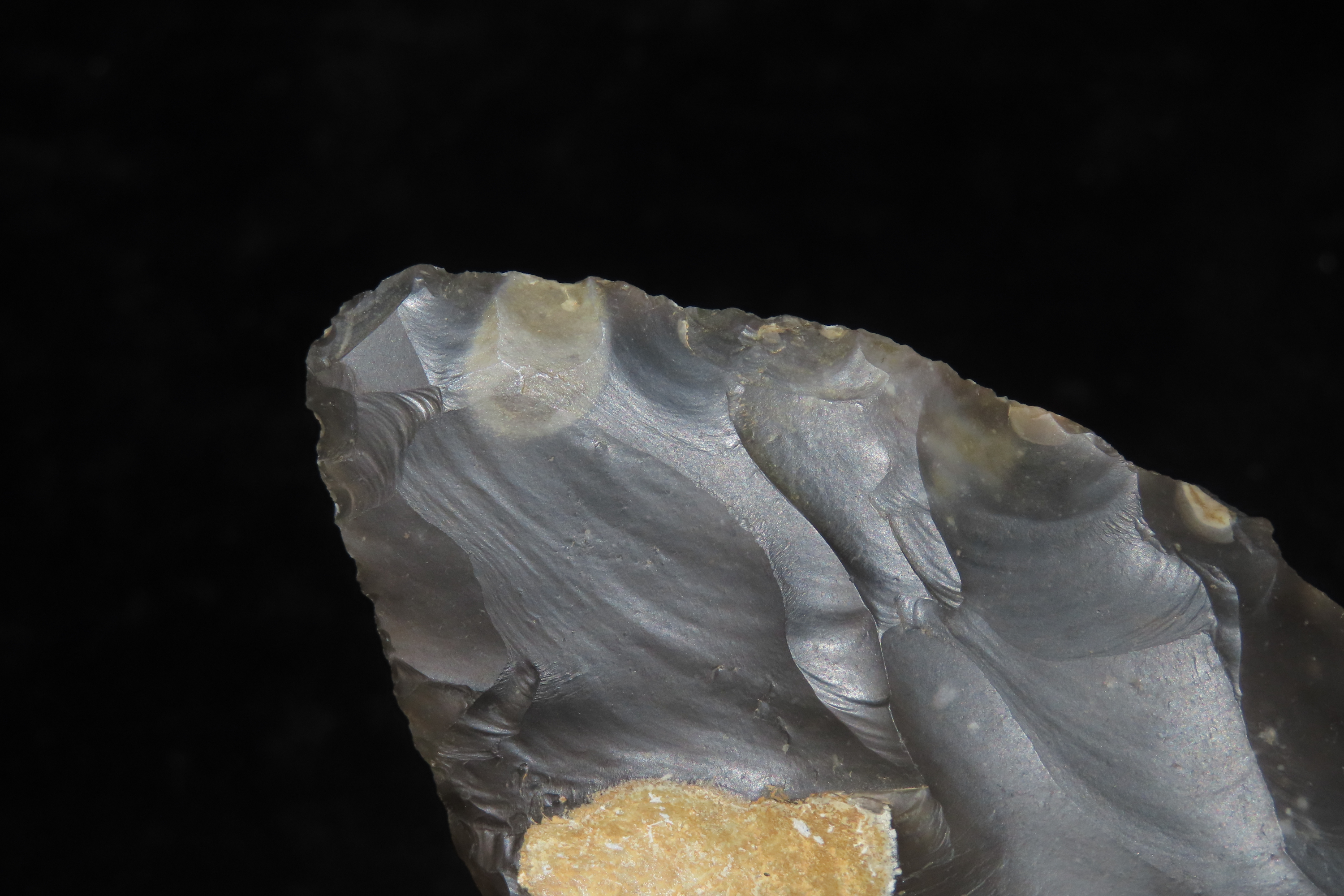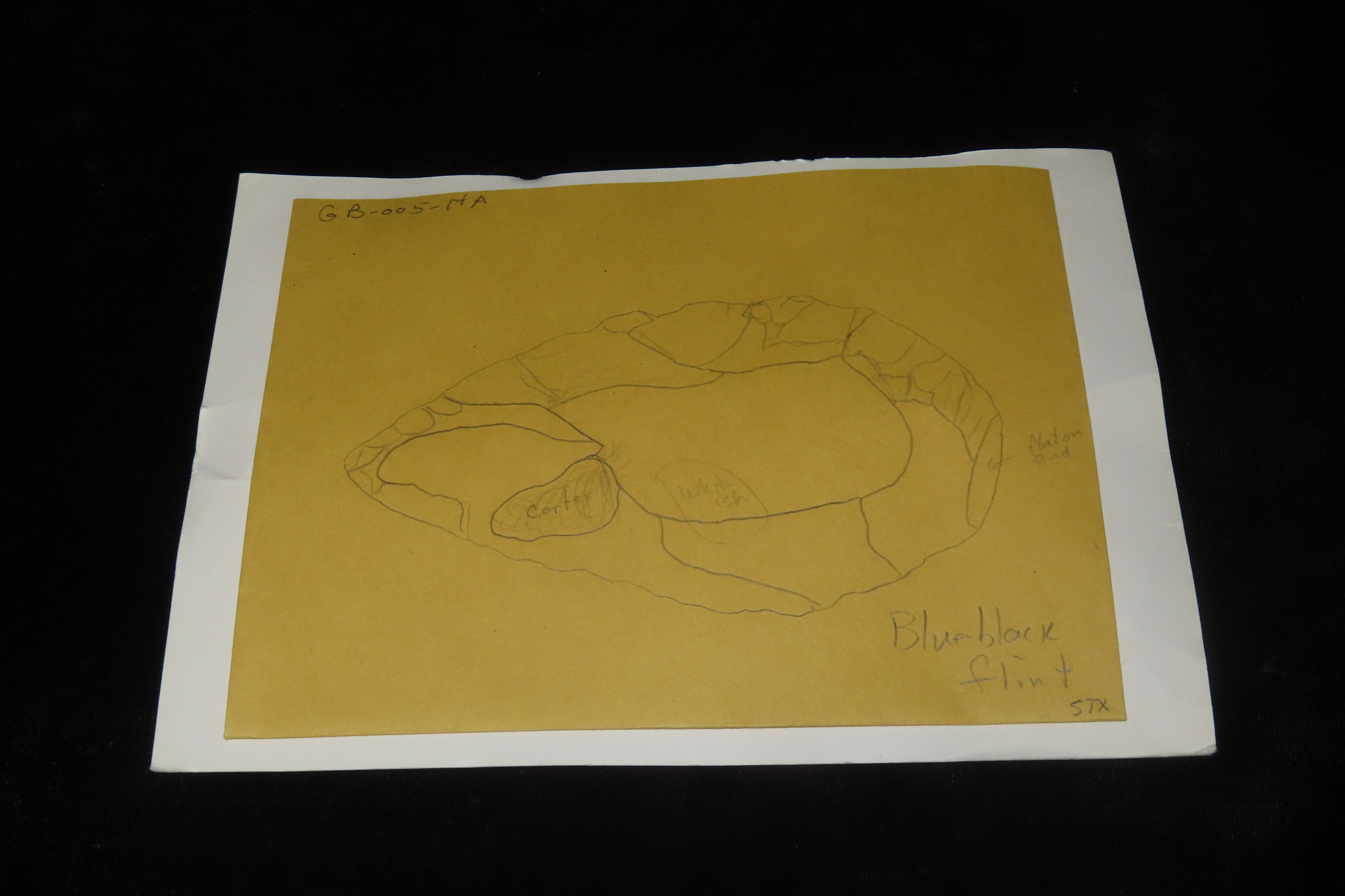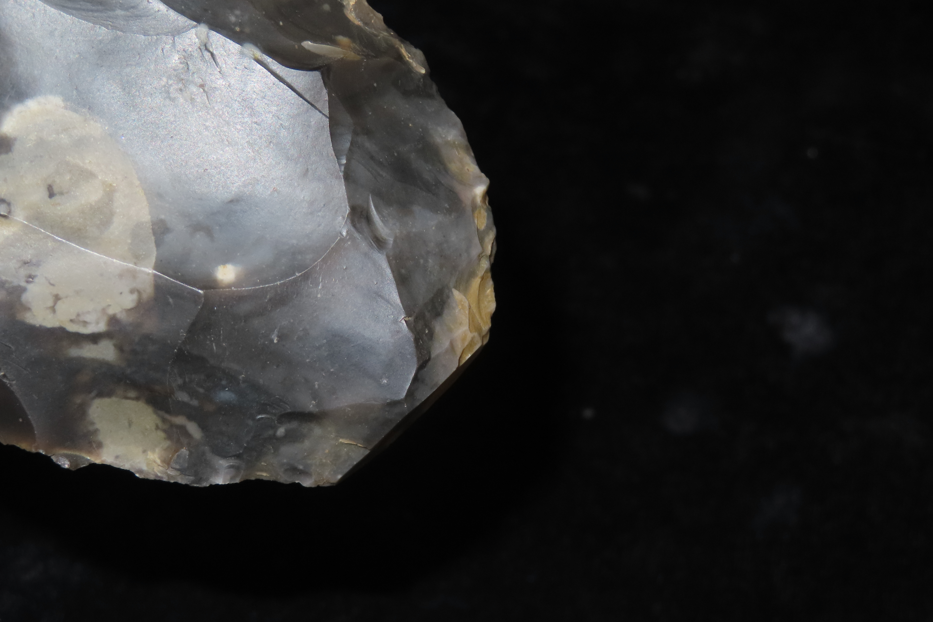 4 5/8″ x 2 1/2″ Acheulean Hand Axe, Paleolithic, Elongated Cordiform Shape of Spotted Blue/Black Flint, Found at Warren Hill, Mildenhall, NW Sussex, Ex Henry Dewey, Fenton, Richard Widdowson