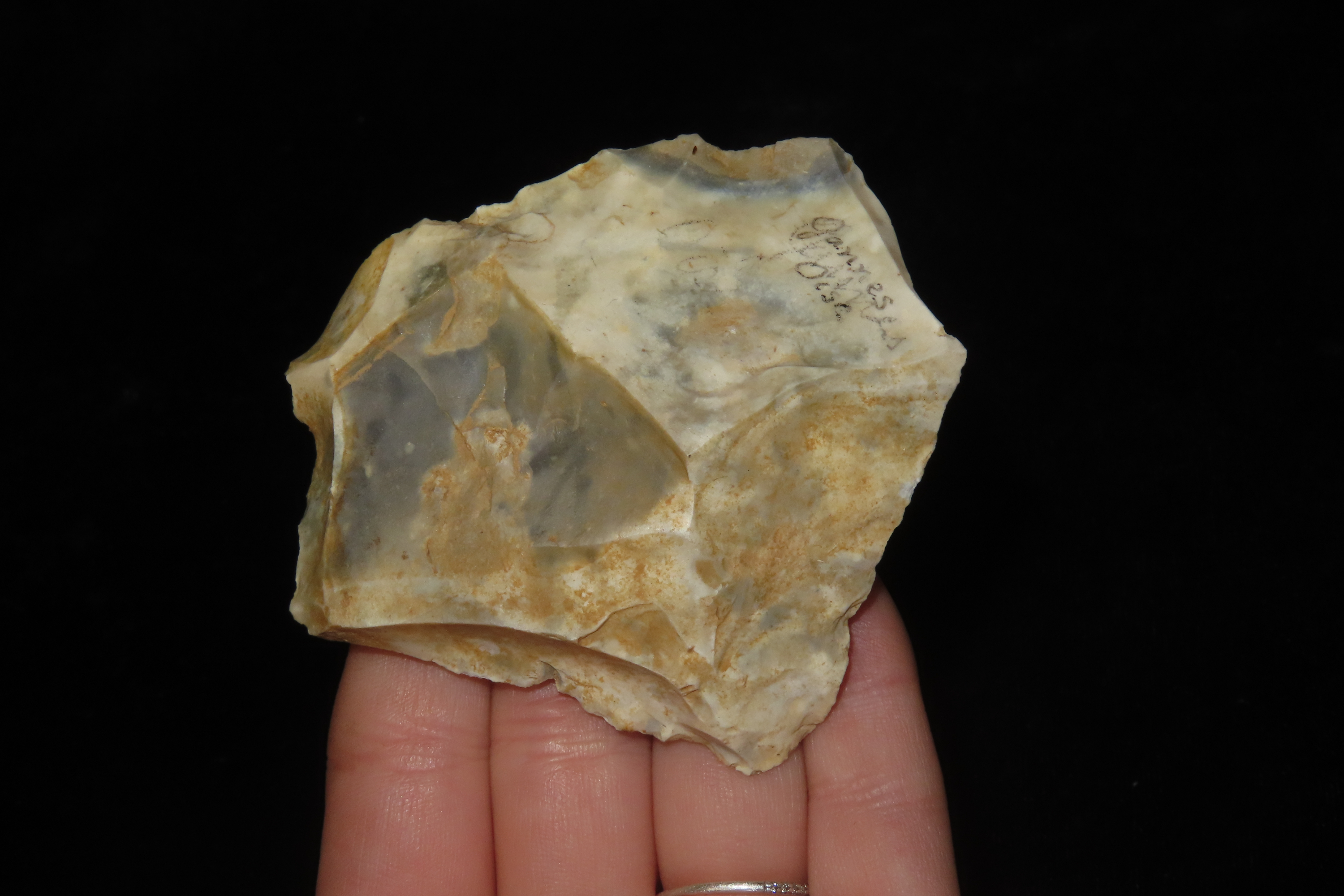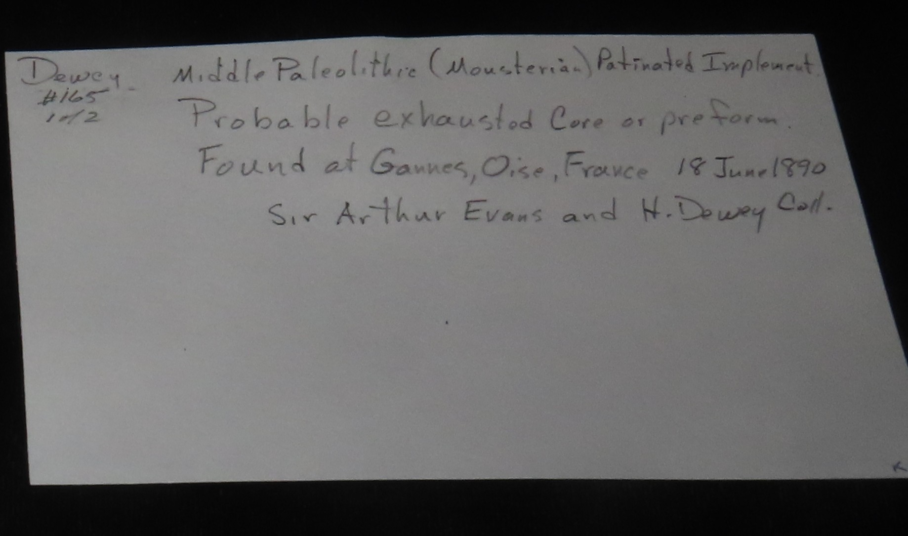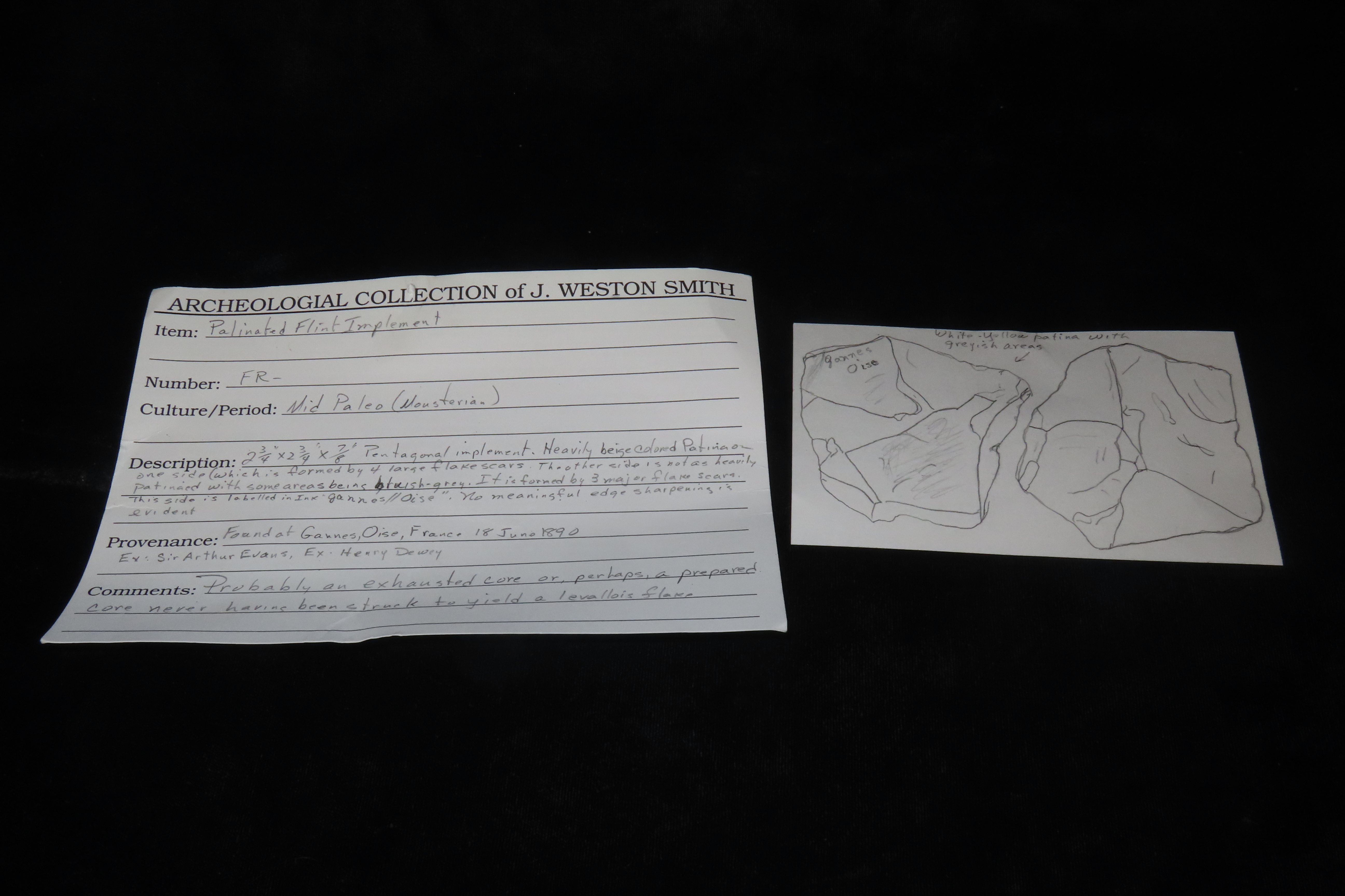 2 3/4″ X 2 3/4″ X 7/8″ Patinated Mousterian Flint Implement, Found in Gannes, Oise, France, June 18, 1890, Ex Sir Arthur Evans, Ex Henry Dewey