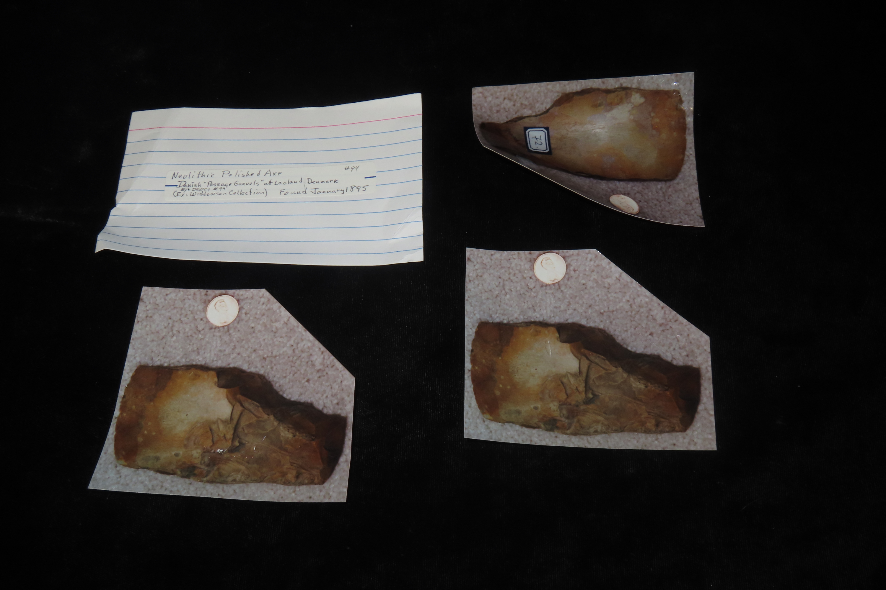4 7/8″ X 2 7/16″ Neolithic Polished Axe, Found at Laoland, Denmark January 1895, Ex Henry Dewey, Ex Widdowson