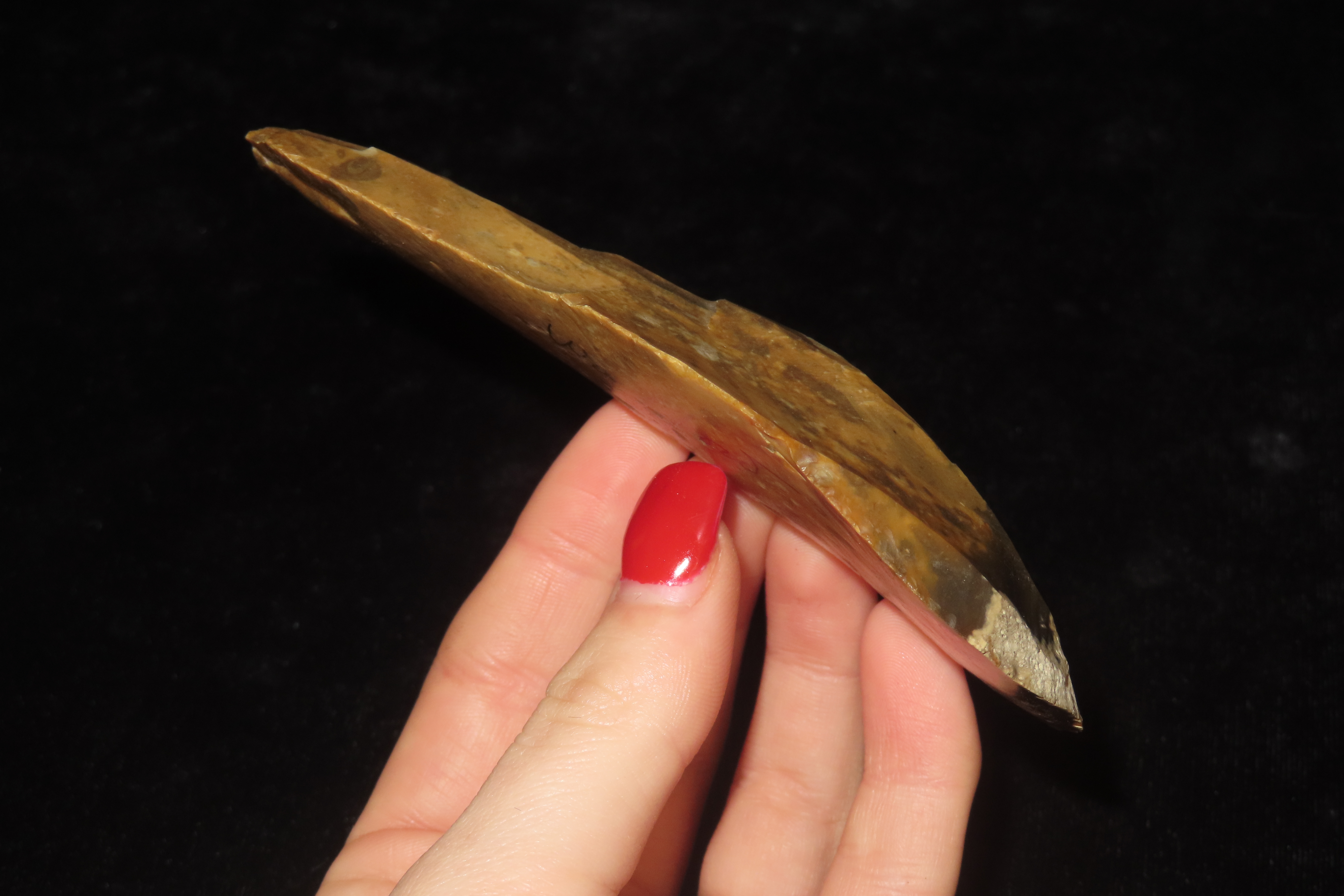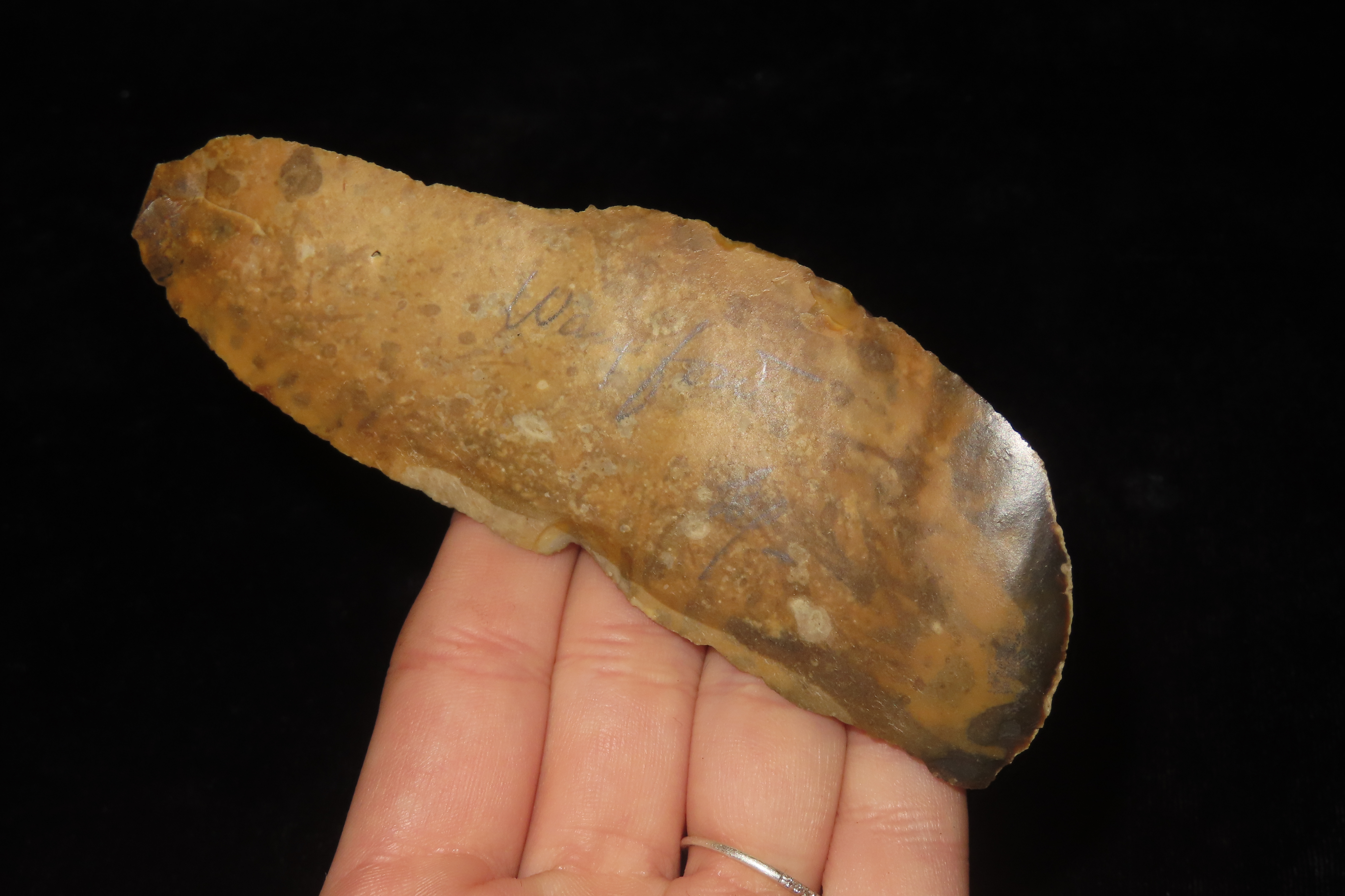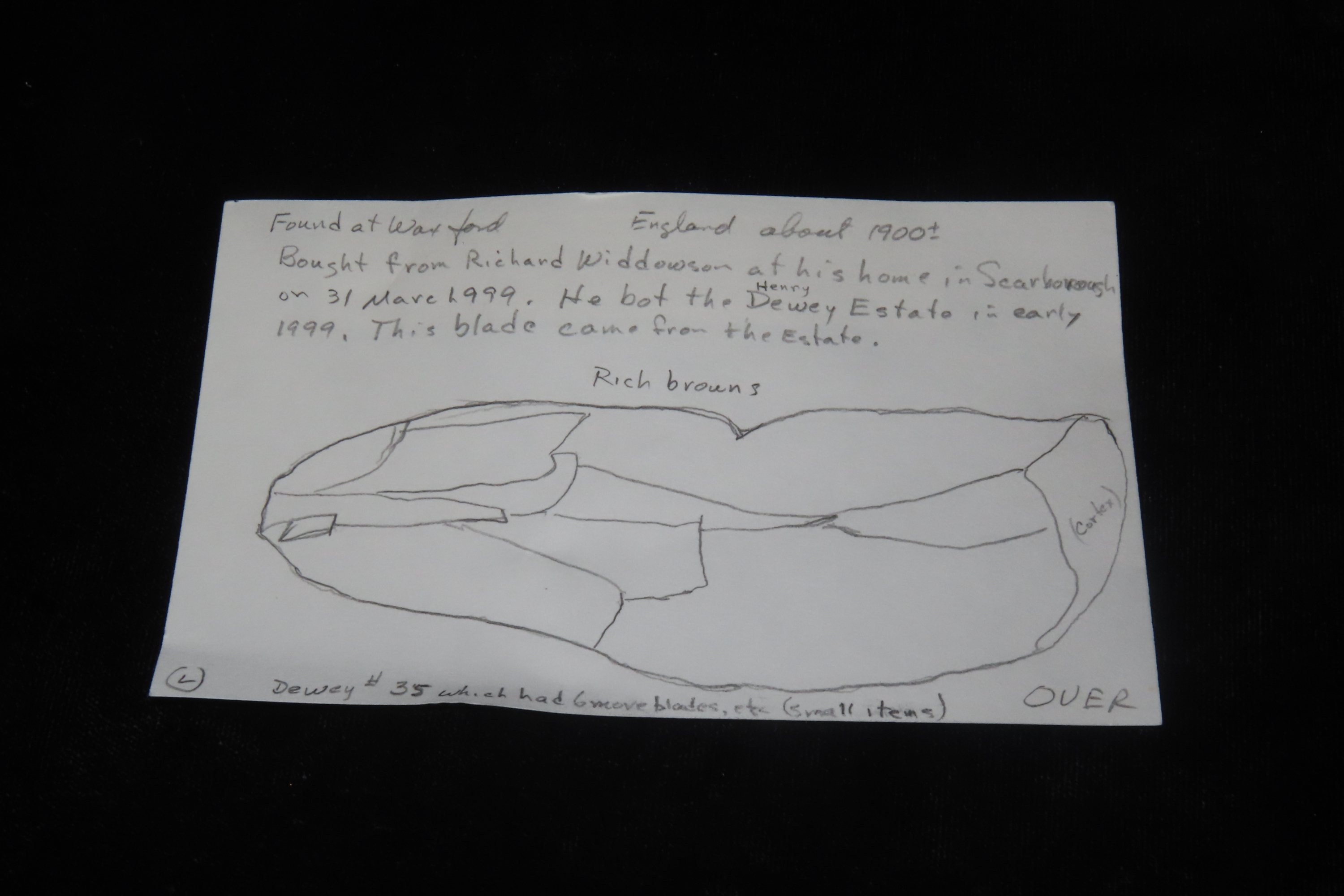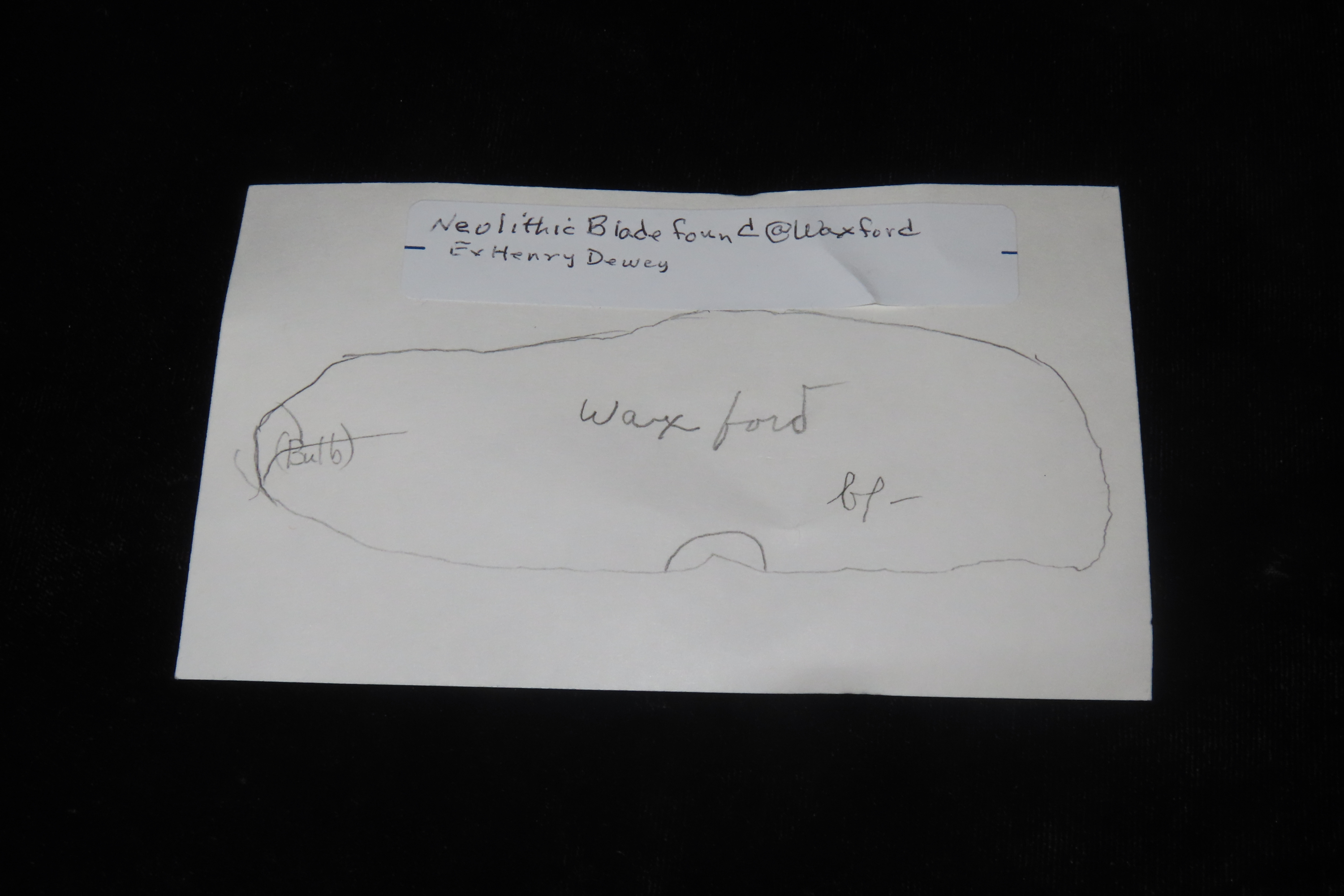 4 1/2″ X 1 5/8″ Neolithic Blade, found at Waxford, England around 1900, Ex Henry Dewey, Ex Widdowson