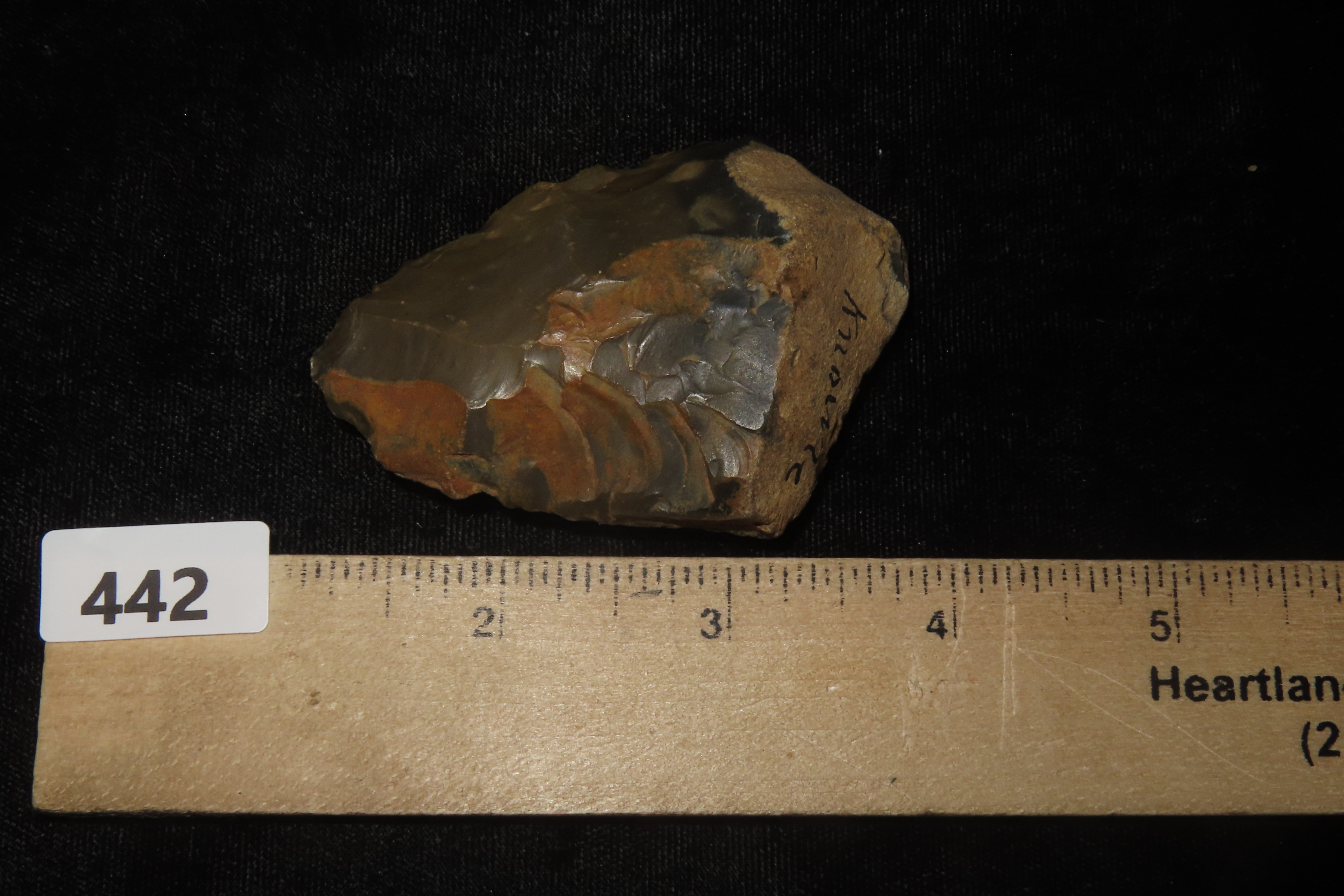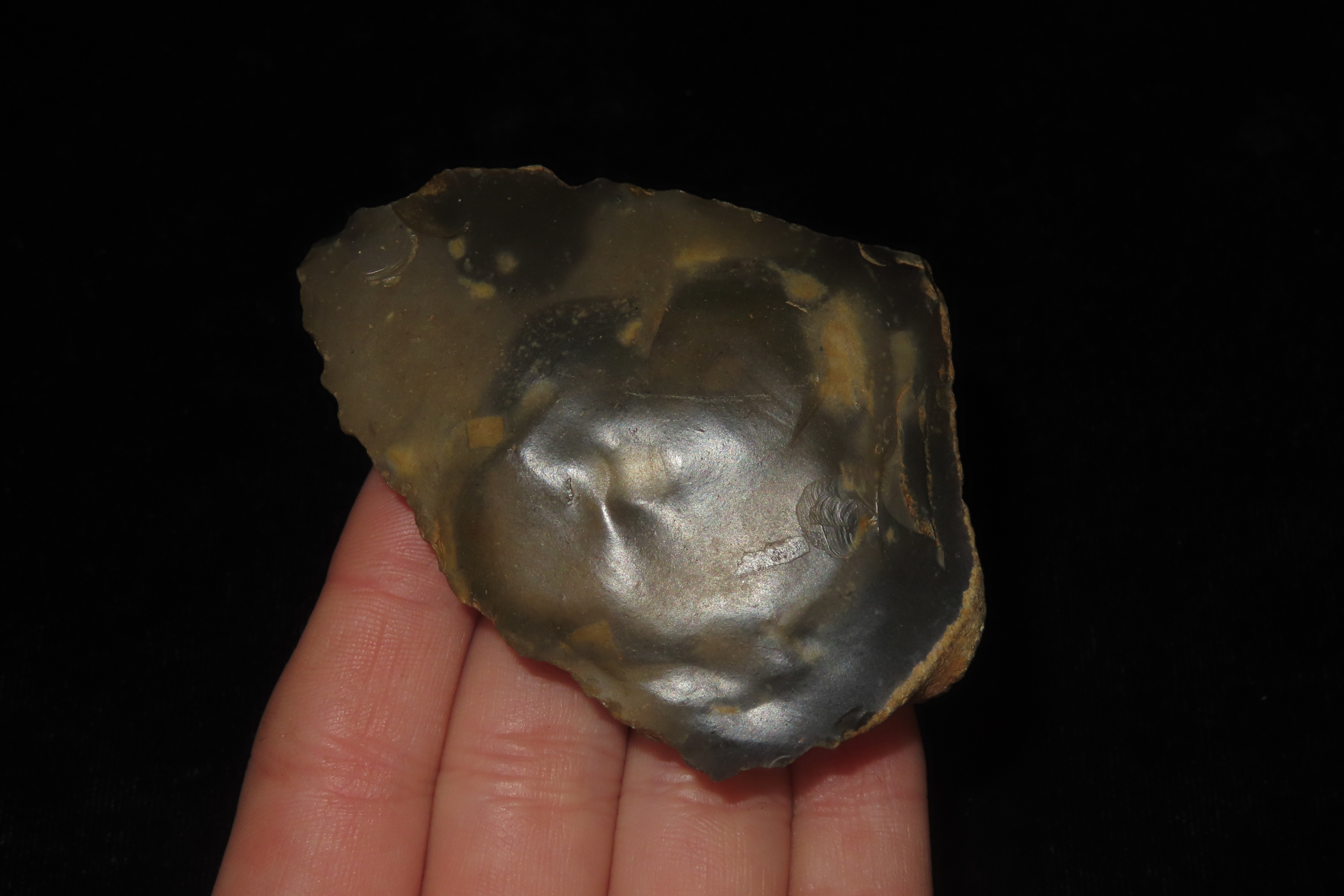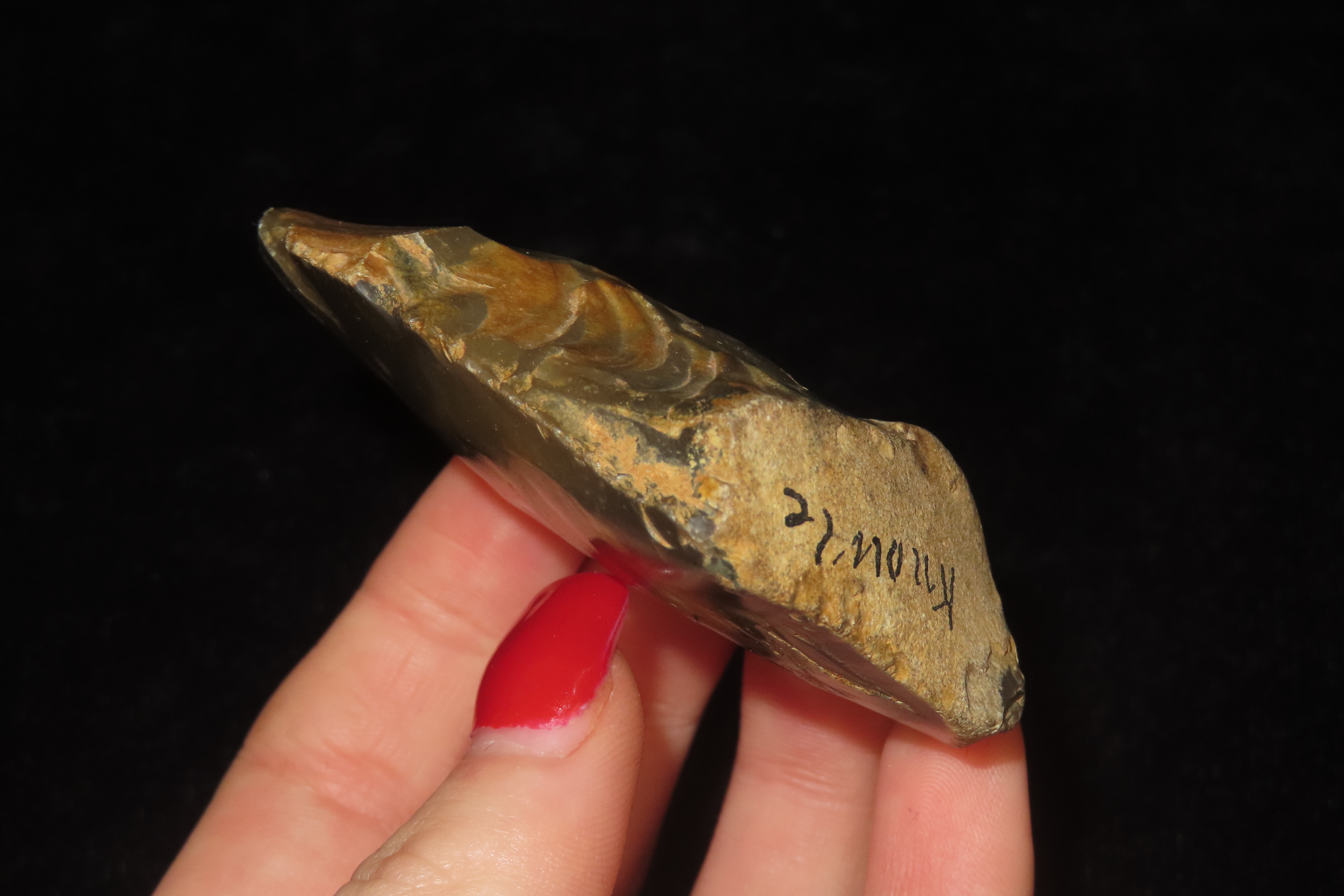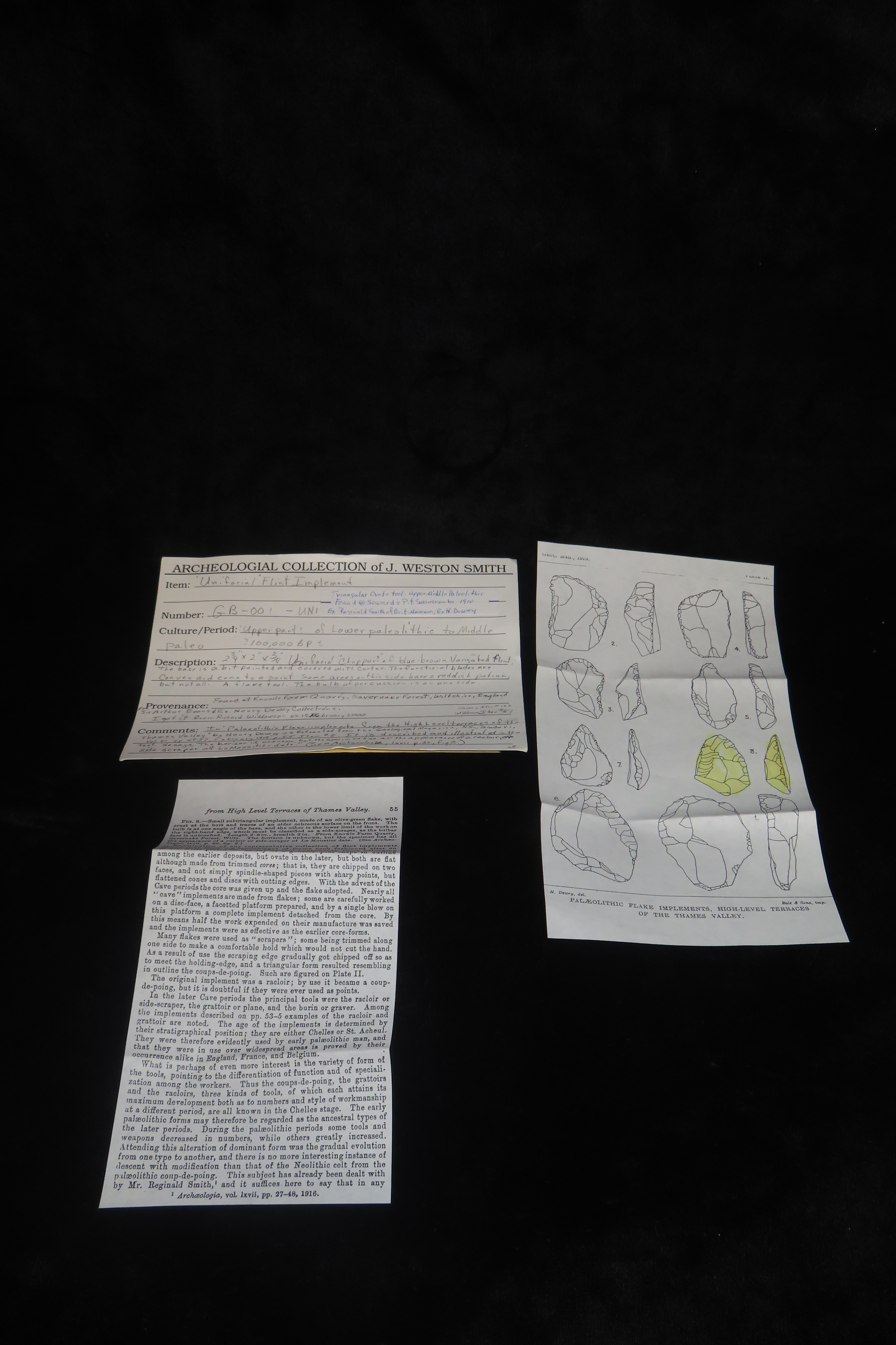 2 3/4″ X 2″ X 3/4″ Upper Middle Paleolithic Triangular Ovate Unifacial Flint Implement, found at Seward’s Pit, Swanscombe in 1910 by Reginald Smith of the British Museum, Ex Henry Dewey.