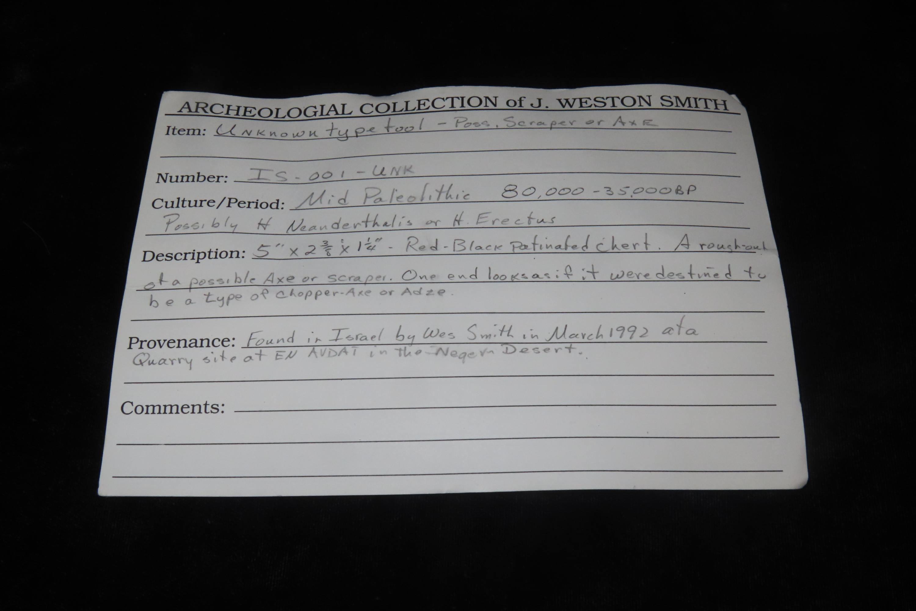 5″ X 2 3/8″ X 1 1/4″ Mid-Paleo Scraper/ Axe, found by Wes Smith March 1992 at Quarry Site, En Avdat in the Judean Desert
