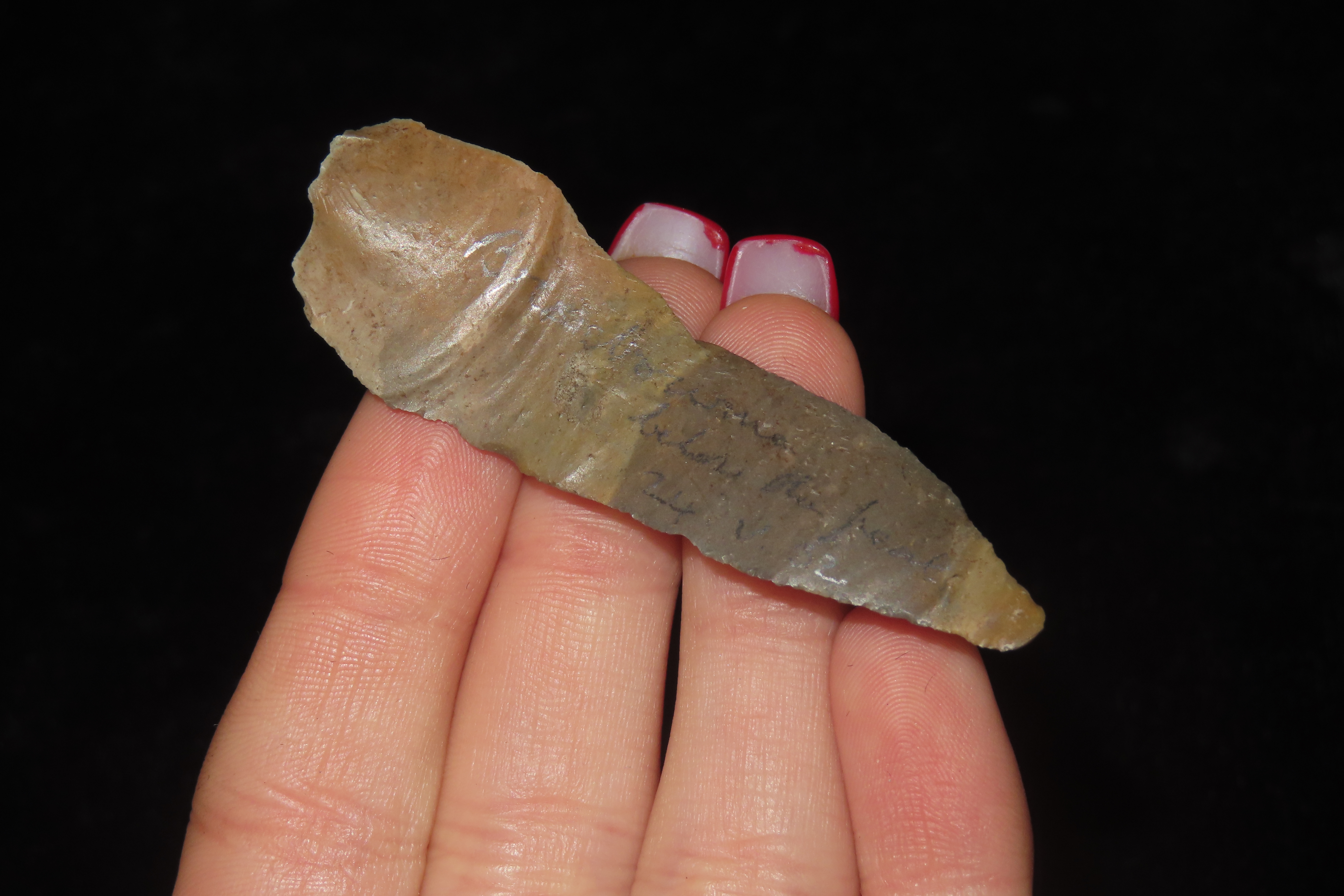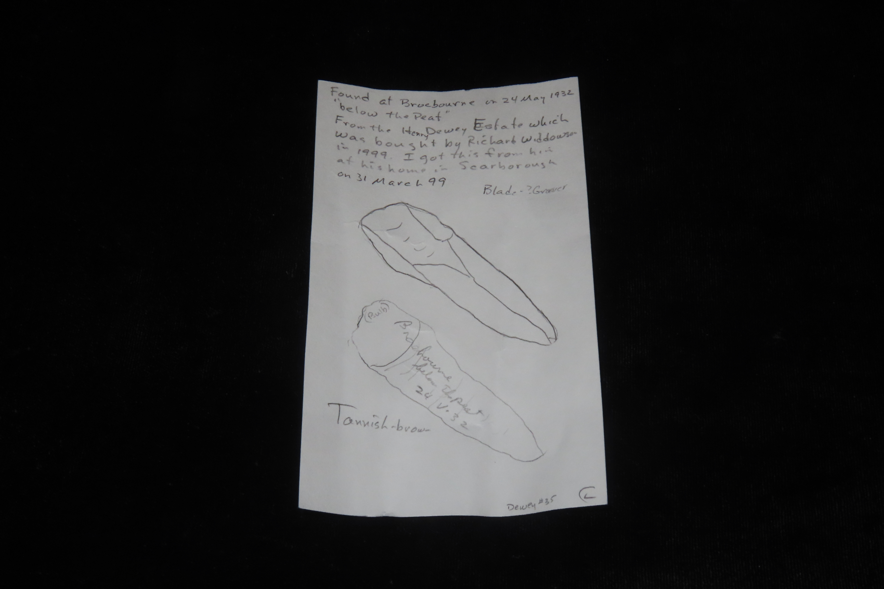 2 1/2″ X 3/4″ Blade/Graver, found at Broxbourne, below the peat, 1932, Ex Henry Dewey Collection