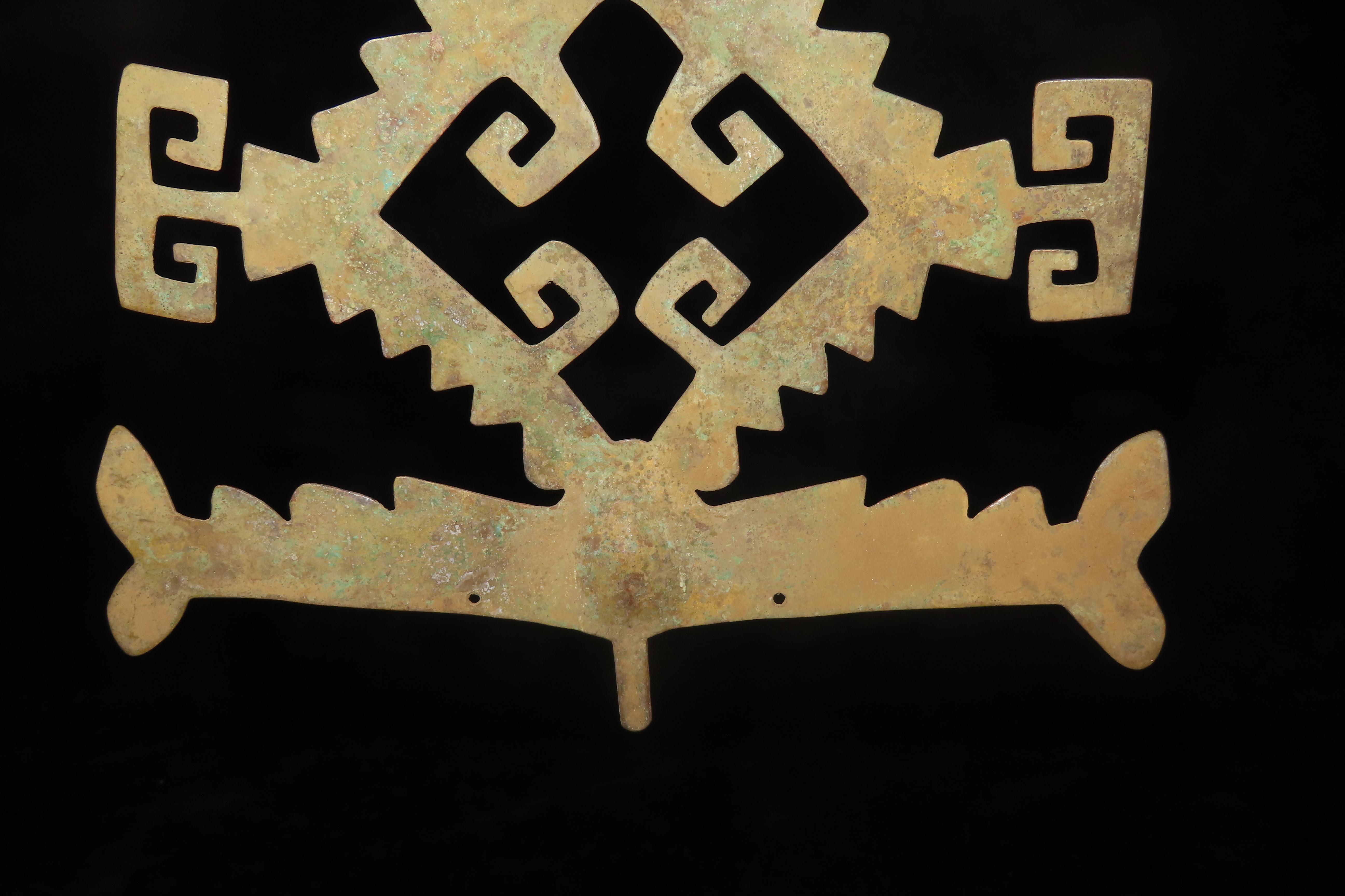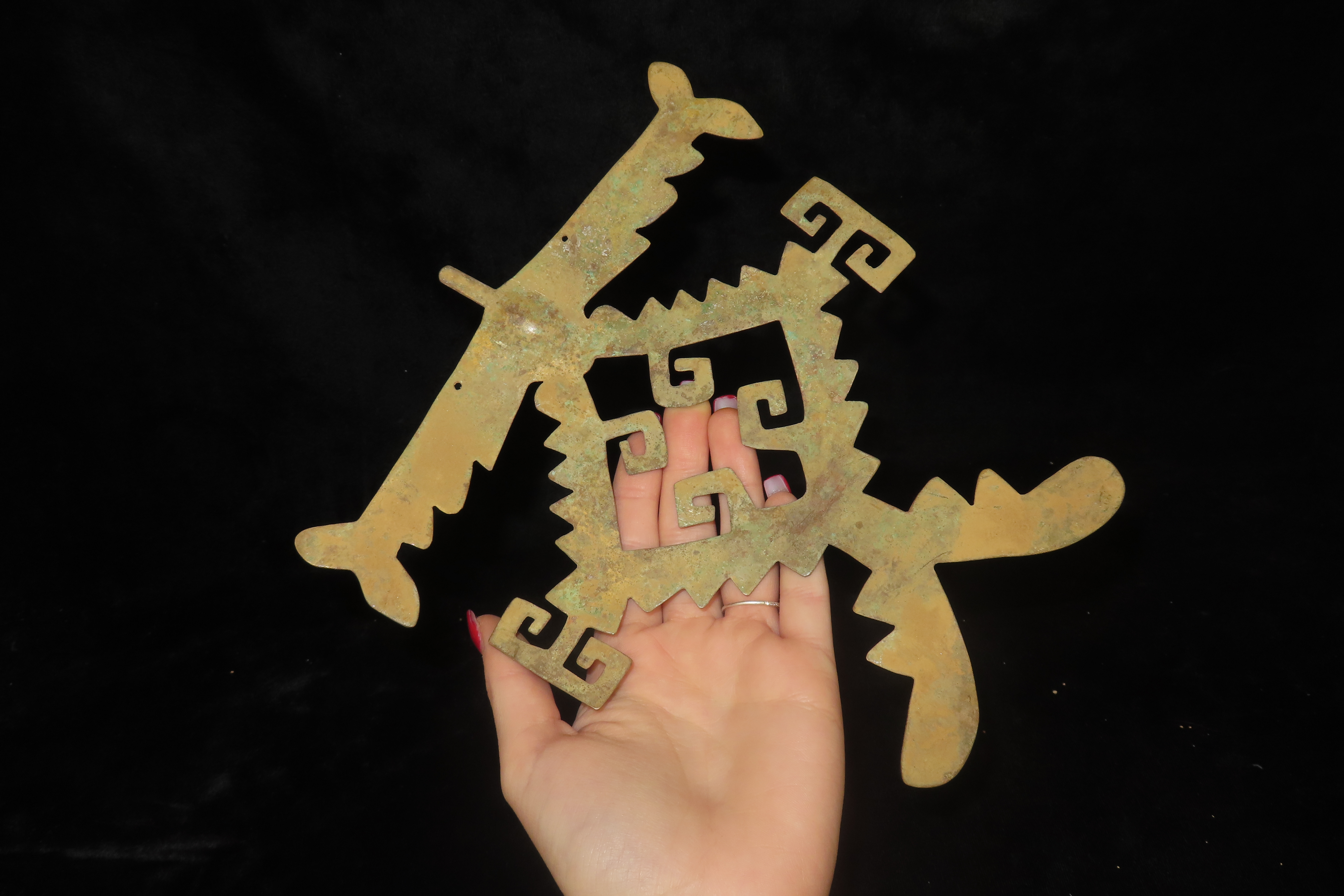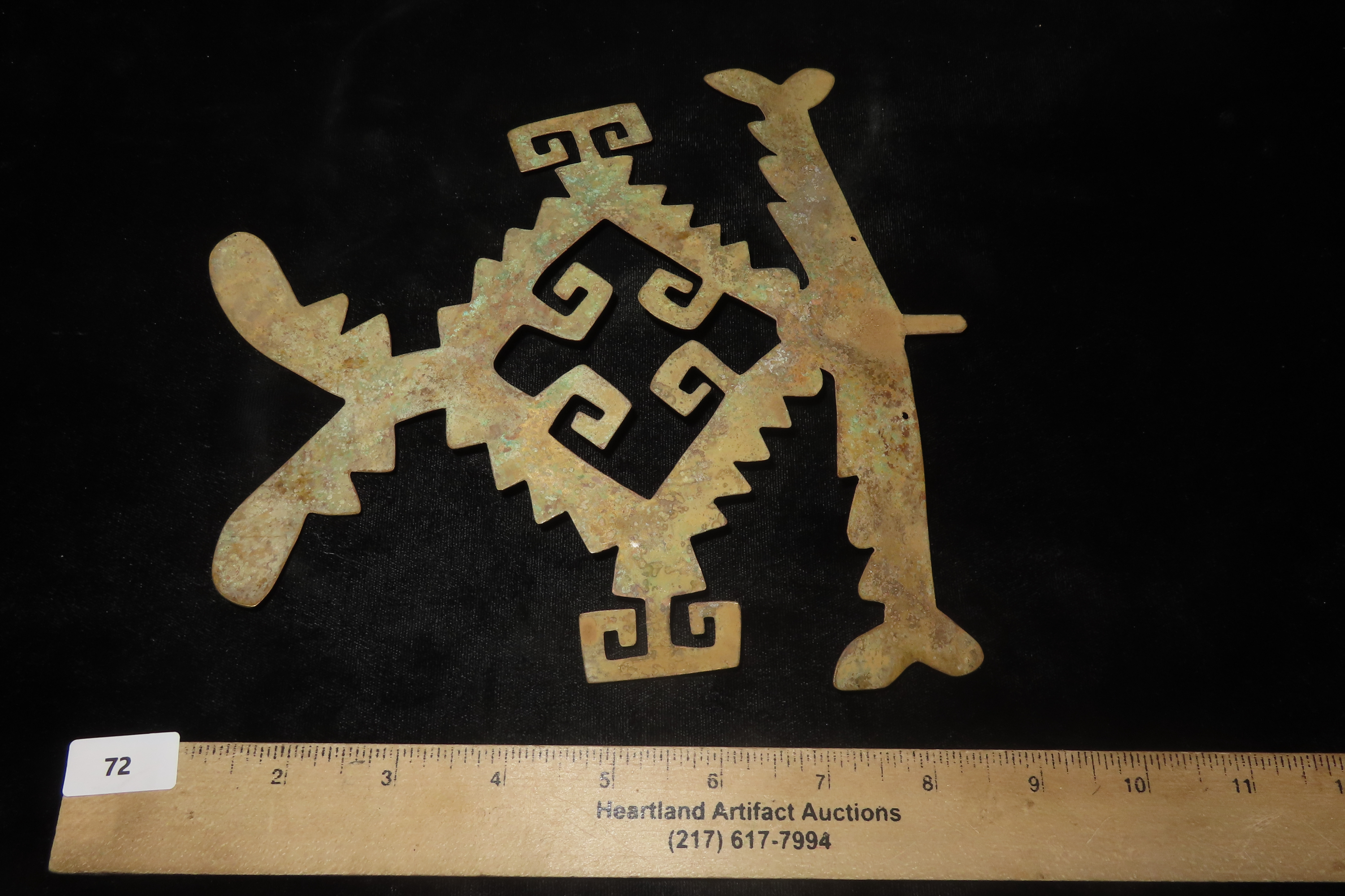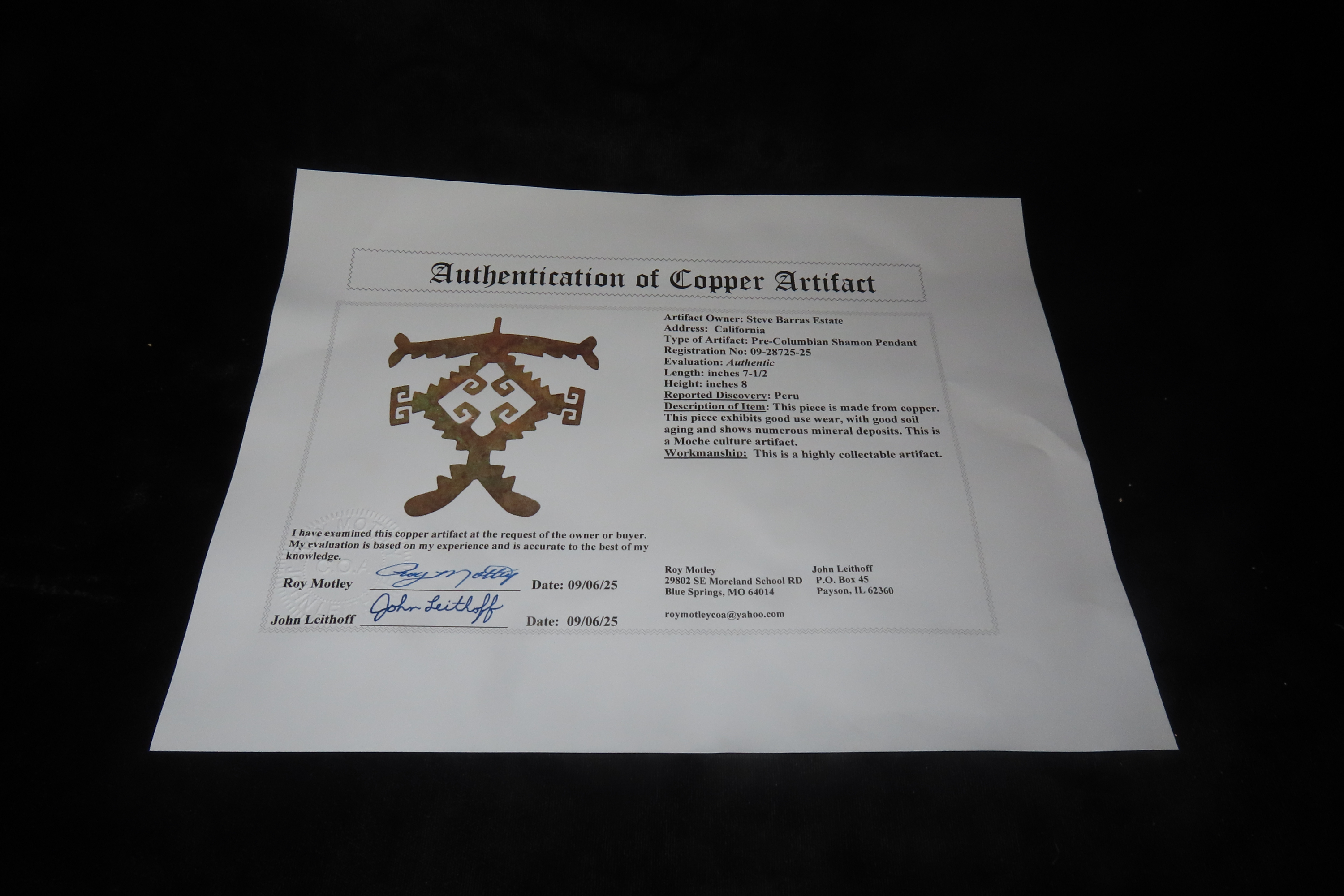 7 1/2″ x 8″ Pre-Columbian Copper Shaman Pendant, Motley COA, found in Peru, Ex Steve Barras Estate