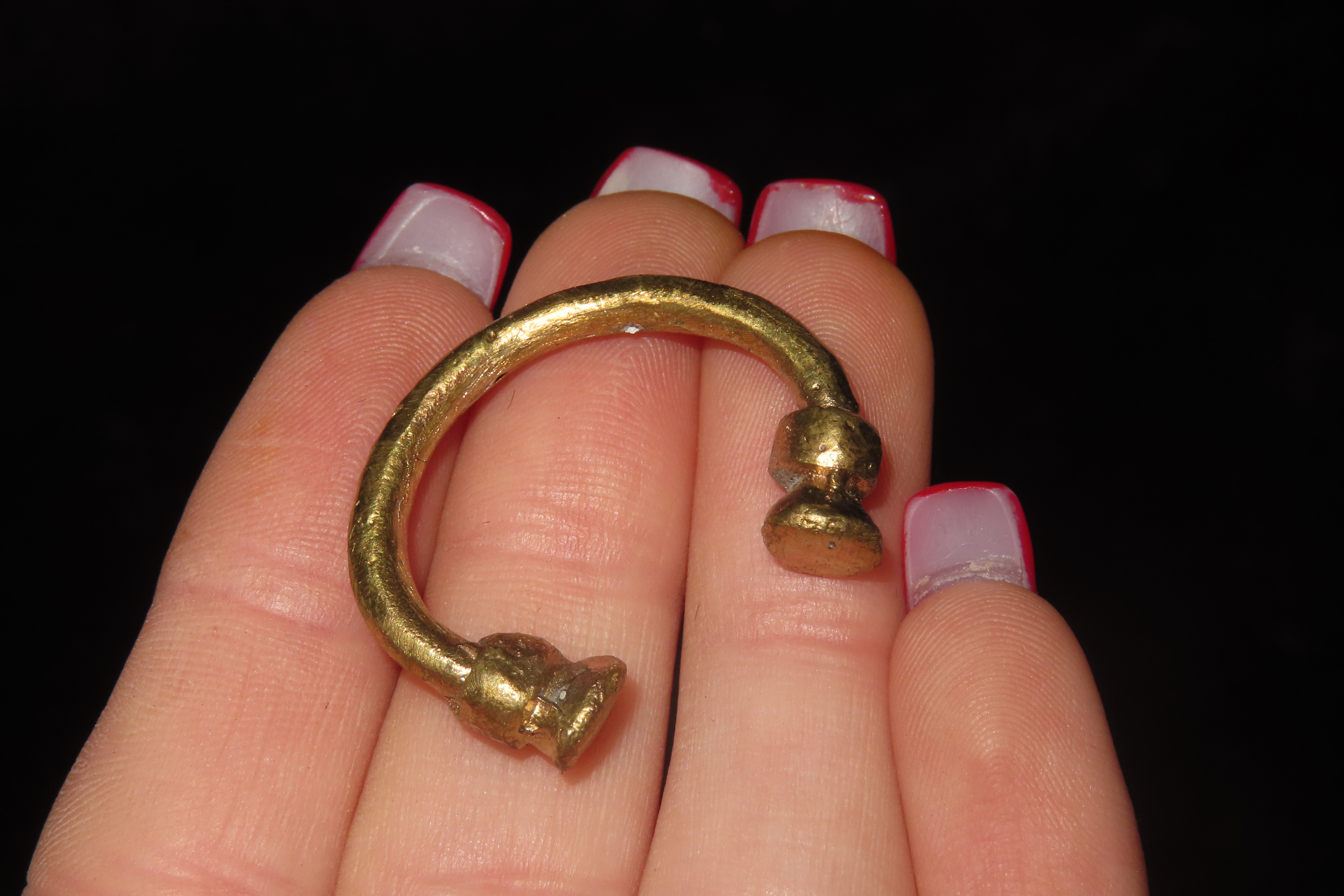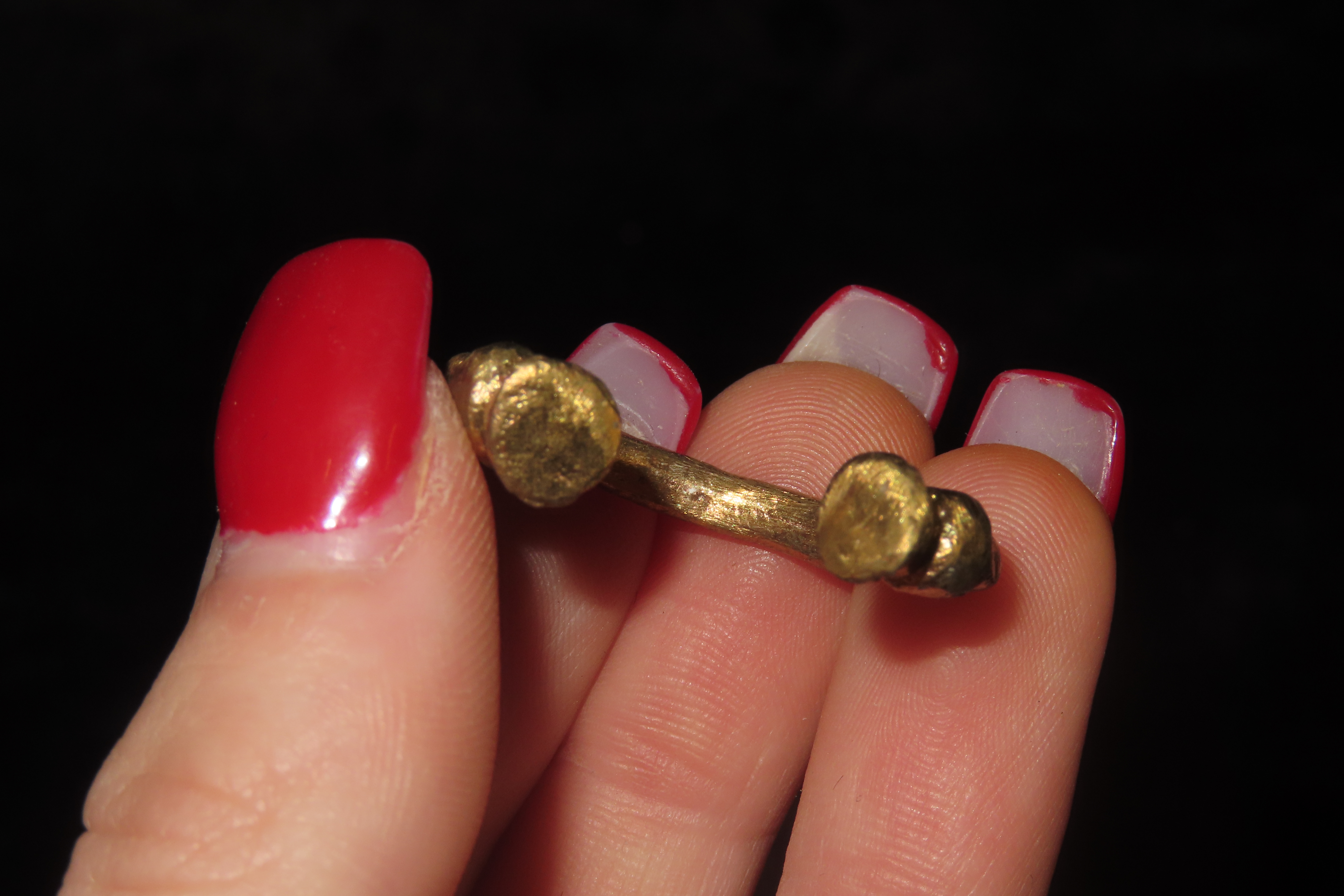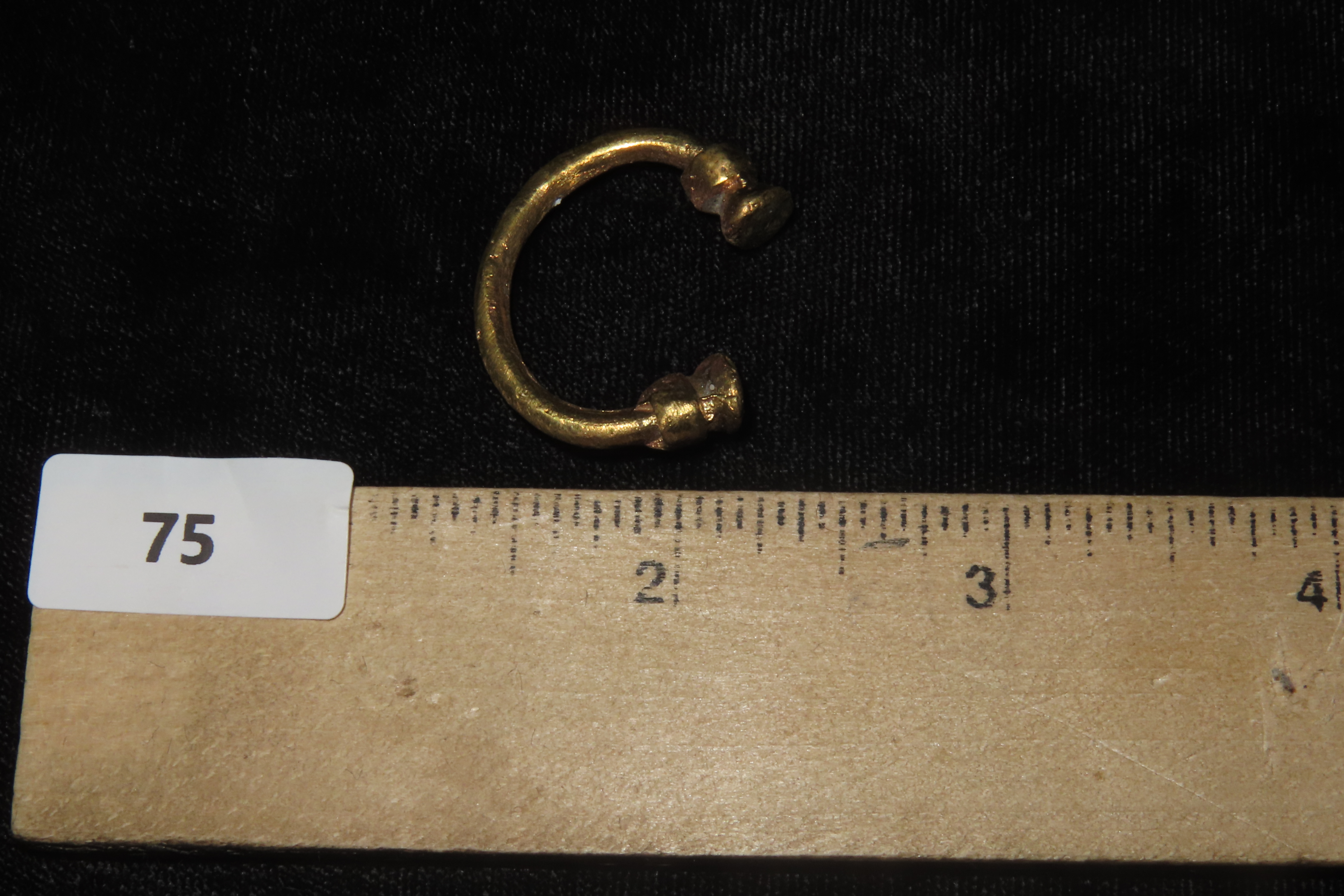 1 1/8″ x 7/8″ Pre-Columbian Tairona Tumbaga Nose/Ear Decoration, Gold content unknown