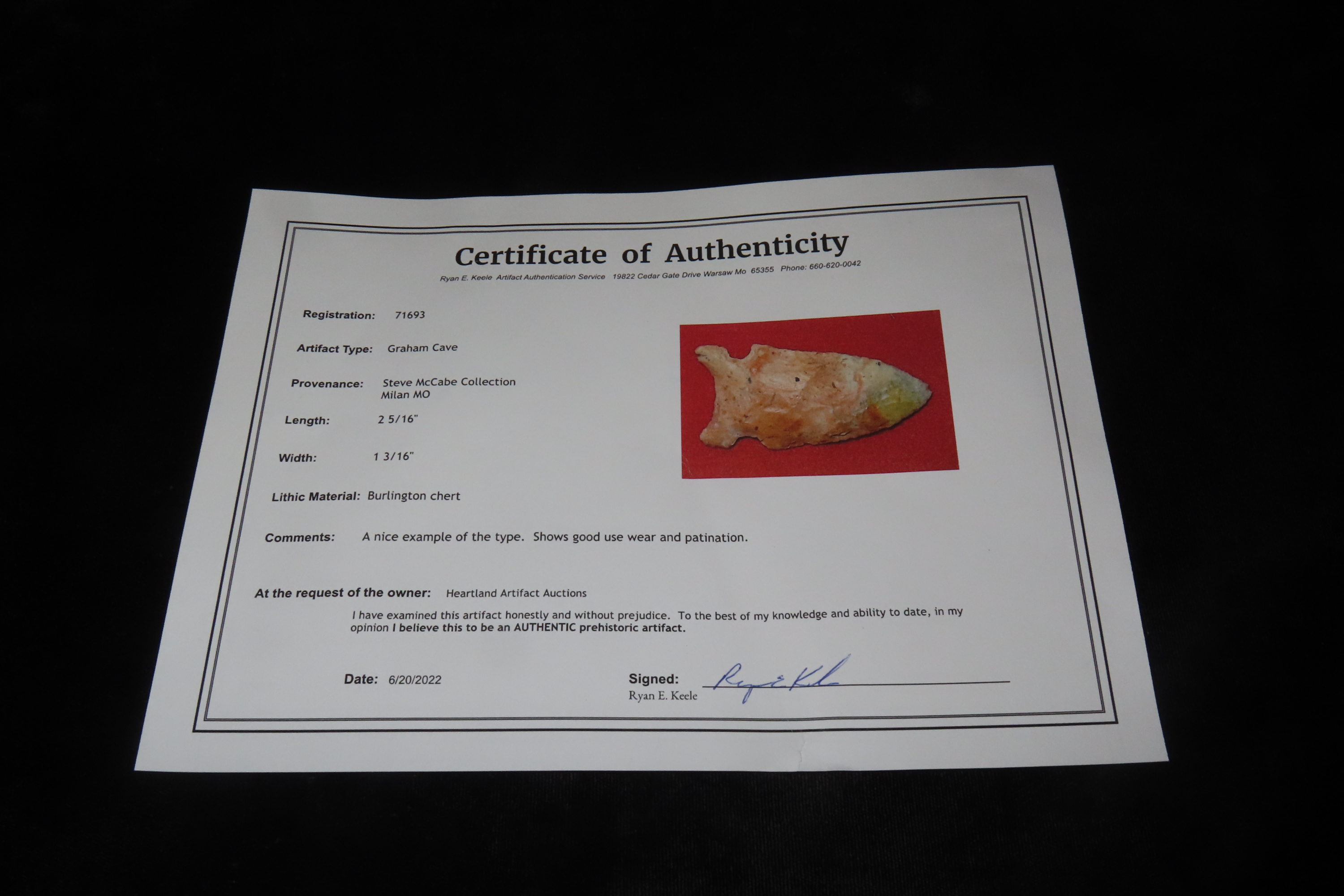 2 5/16″ X 1 3/16″ Graham Cave, Keele COA, Found near Milan, MO., Ex Steve McCabe