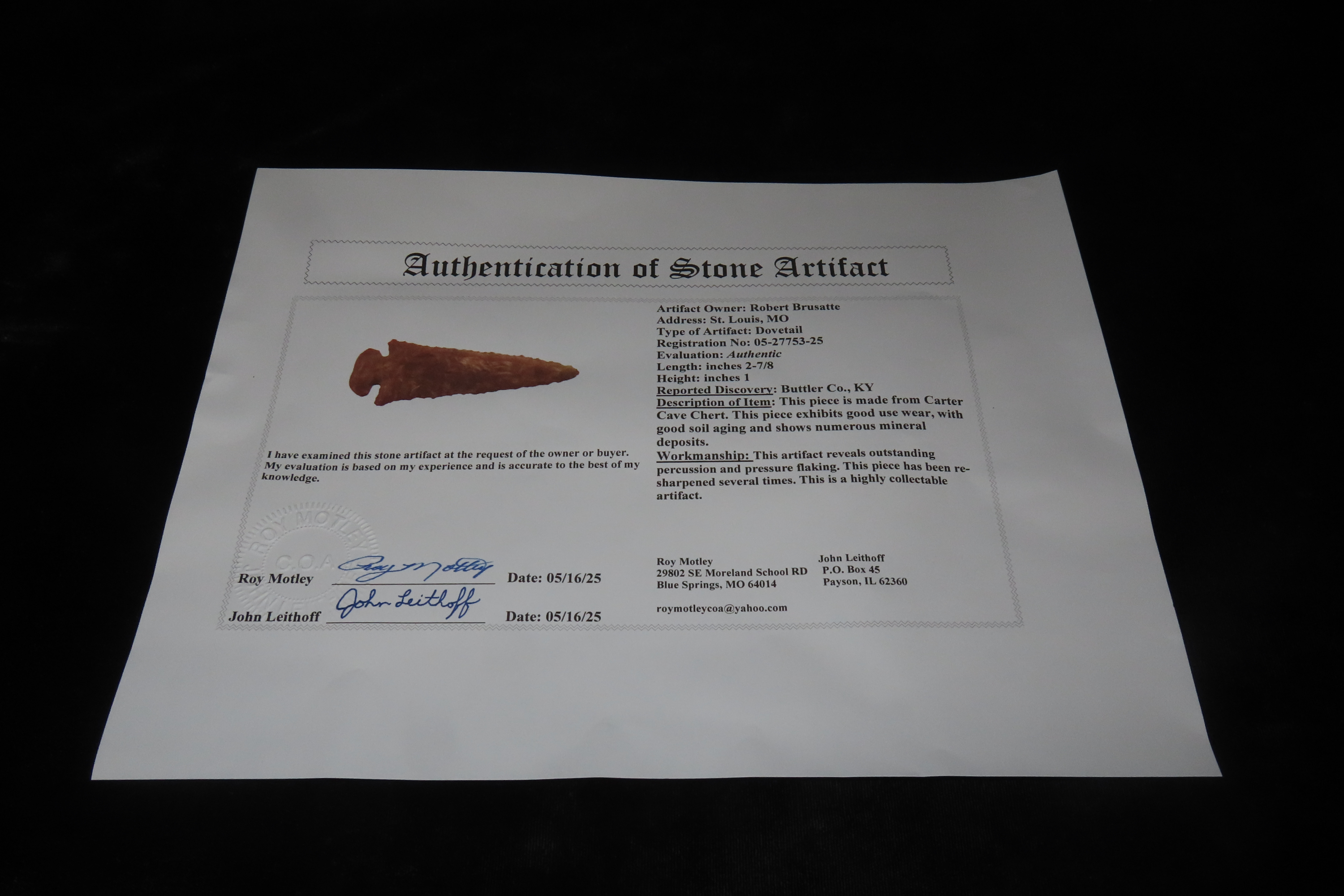 2 7/8″ X 1″ Dovetail, Motley COA, Found in Butler Co. KY.,