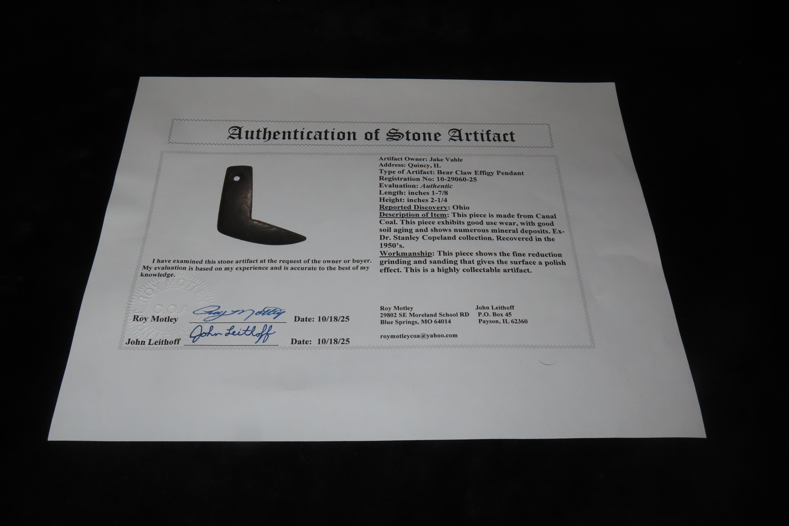 1 7/8″ X 2 1/4″ Bear Claw Effigy Pendant, Motley COA, Recovered in the 1950 Ohio, Ex Dr. Stanley Copeland