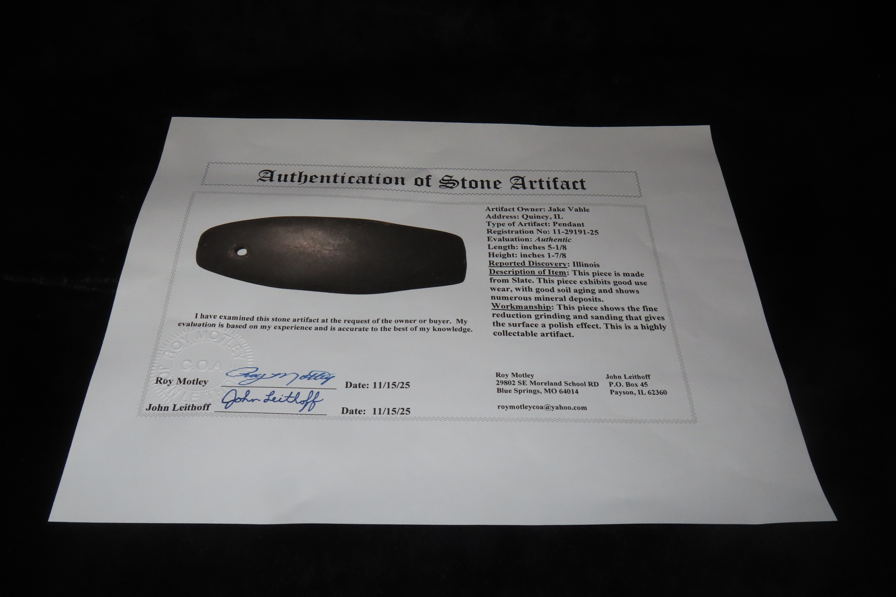 5 1/8″ X 1 7/8″ Slate Pendant, Motley COA, Found in Illinois