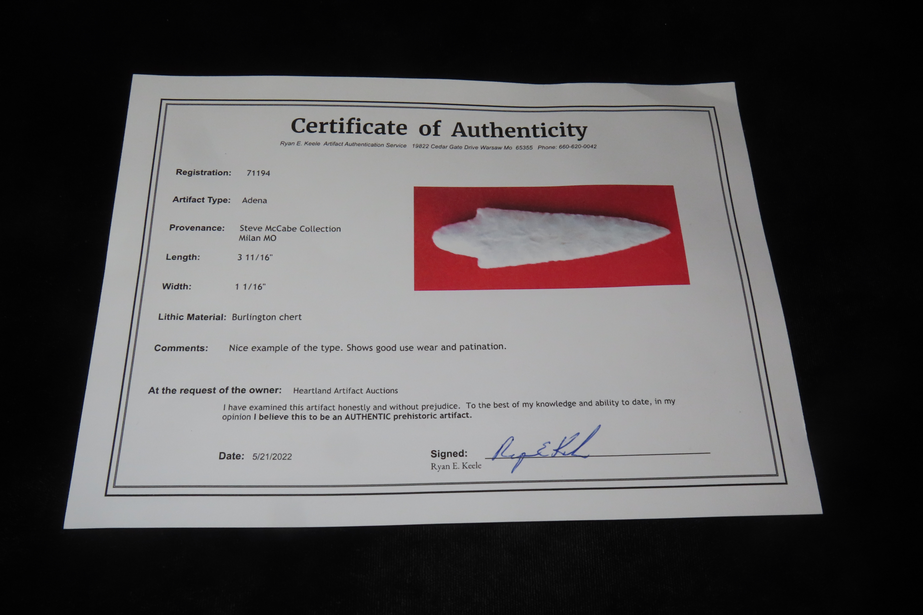 3 11/16″ X 1 1/16″ Adena, Keele COA, Found Near Milan, MO., Ex Steve McCabe