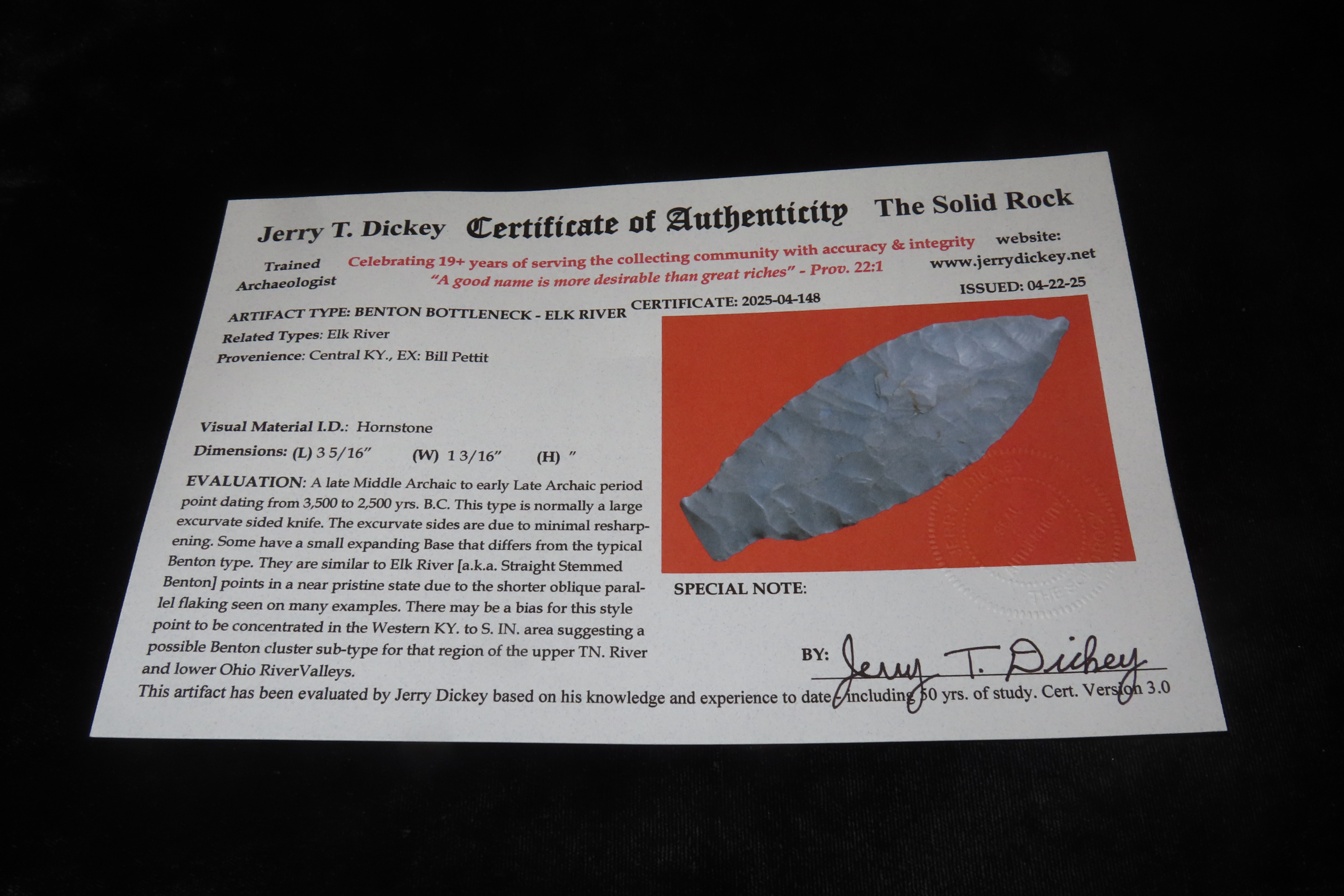 3 5/16″ X 13/16″ Benton River- Elk River, Dickey COA, Found in Central Kentucky, Ex Bill Pettit