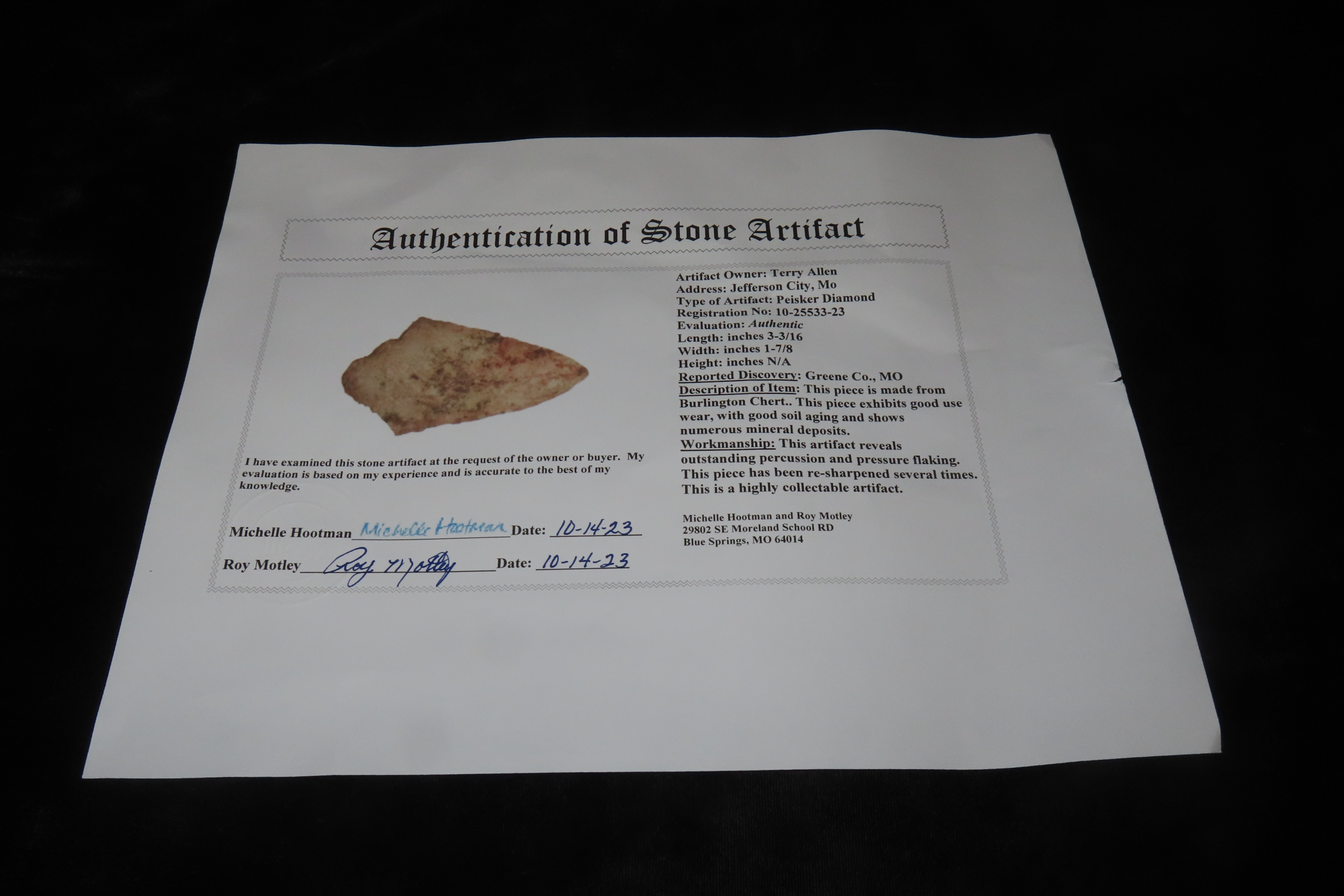 3 3/16″ X 1 7/8″ Peisker Diamond, Motley COA, Found in Greene Co. MO.,