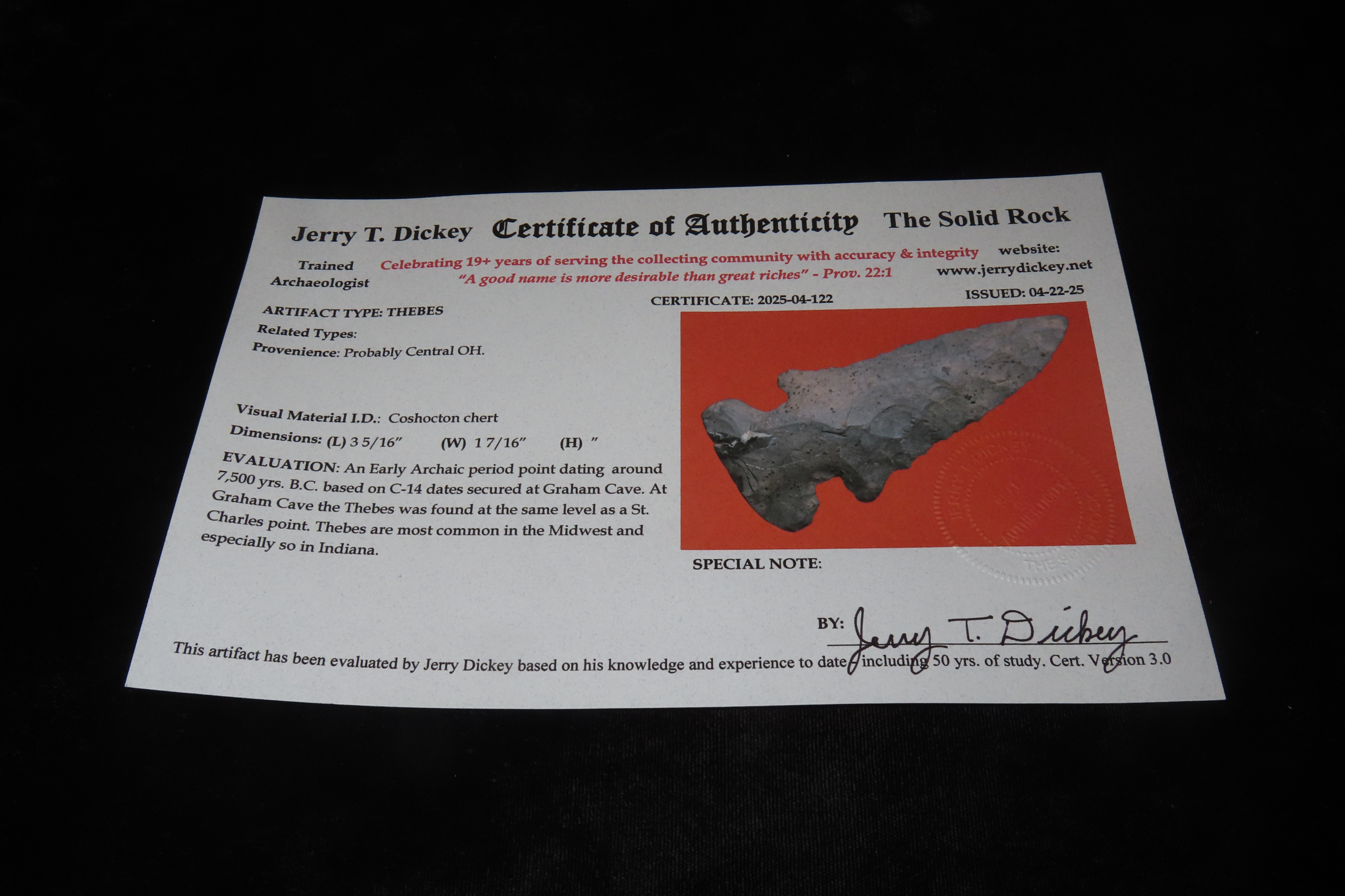 3 5/16″ X 1 7/16″ Coshocton Thebes, Dickey COA, Found in Central Ohio