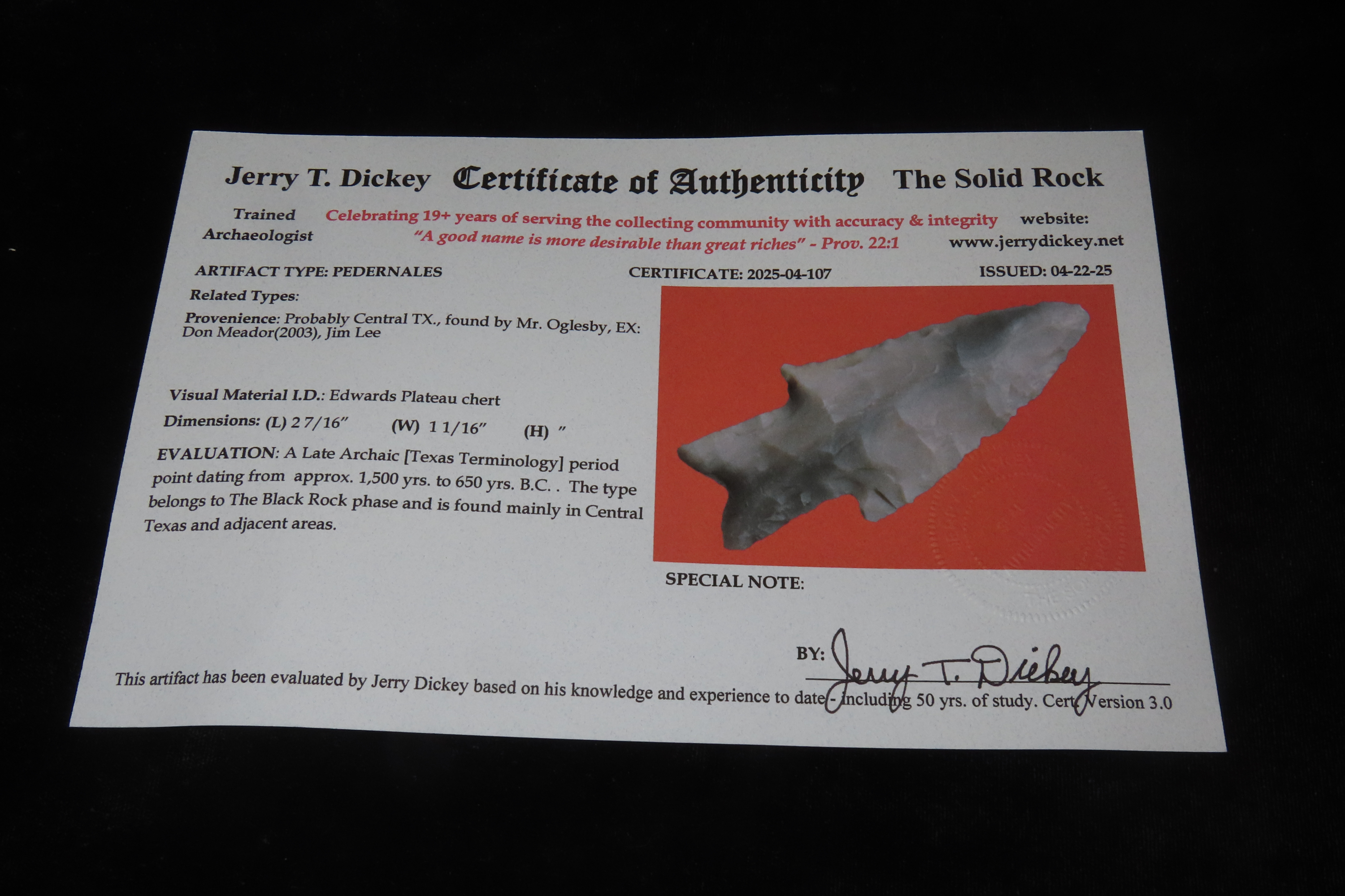 2 7/16″ X 1 1/16″ Pedernales, Dickey COA, Found in Central TX., by Mr. Oglesby, Ex Don Meador/ Jim Lee