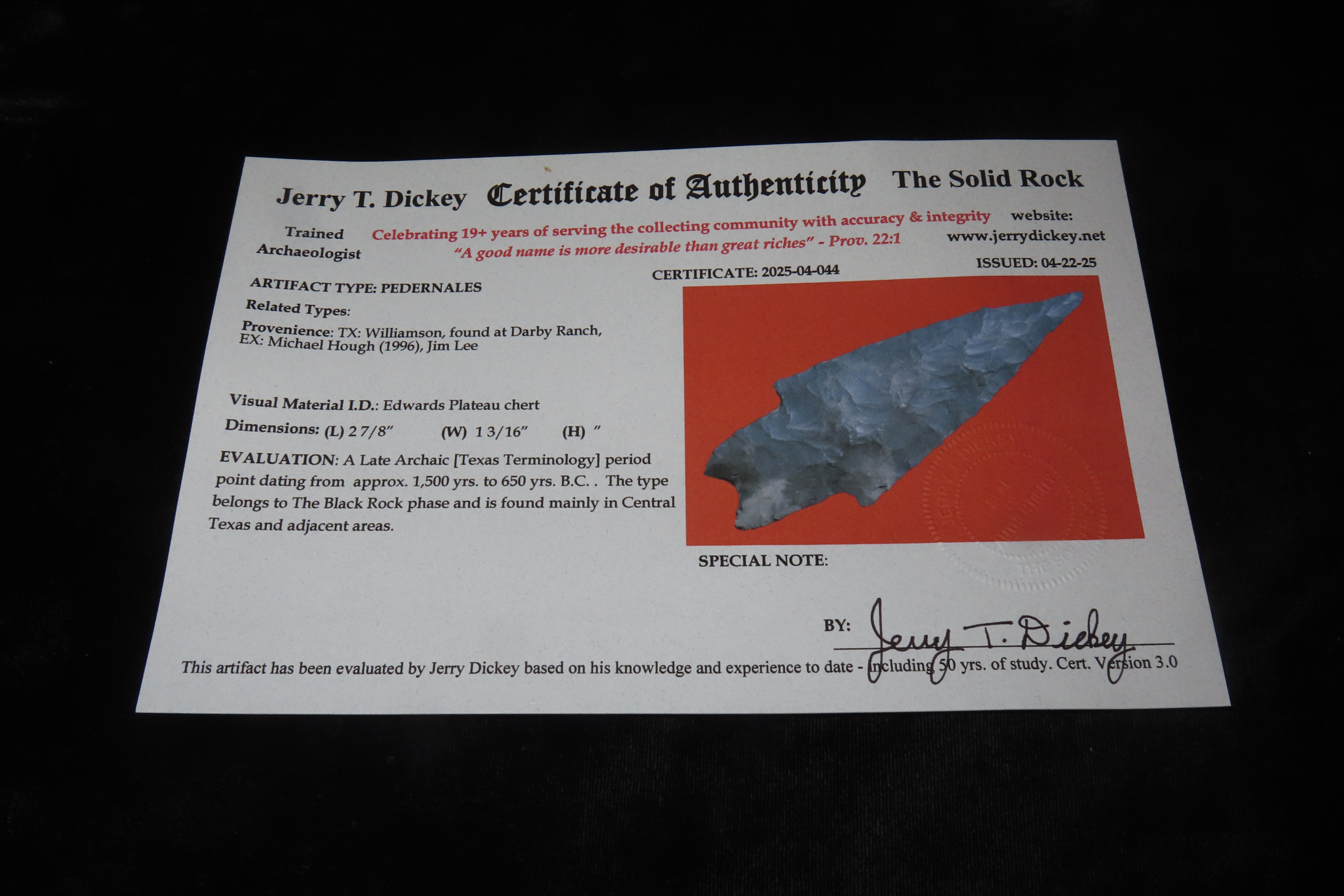 2 7/8″ X 1 3/16″ Pedernales, Dickey COA, Found in Williamson Co, TX. At Darby Ranch, Ex Michael Hough/ Jim Lee