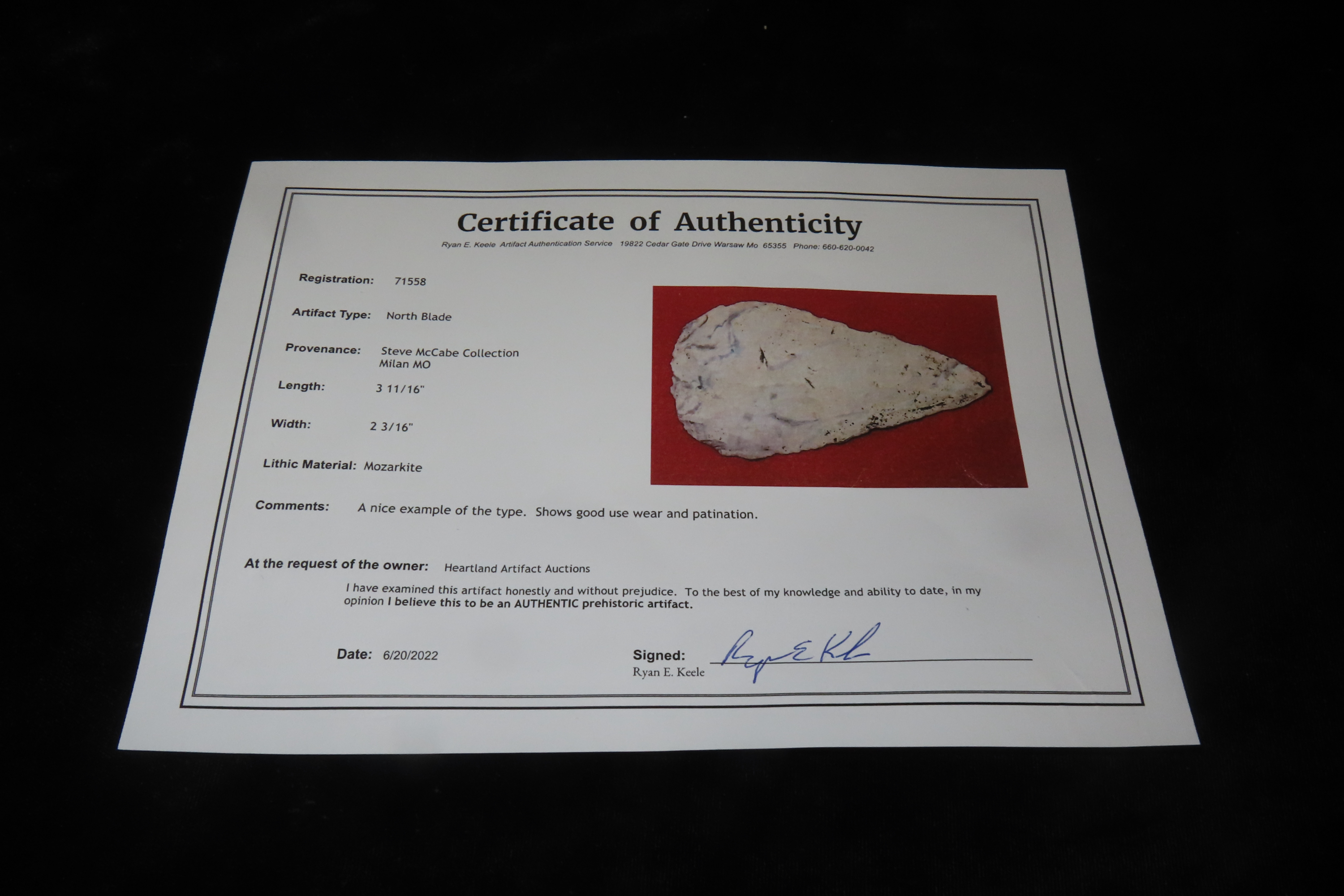 3 11/16″ X 2 3/16″ North Blade, Keele COA, Found Near Milan, MO., Ex Steve McCabe