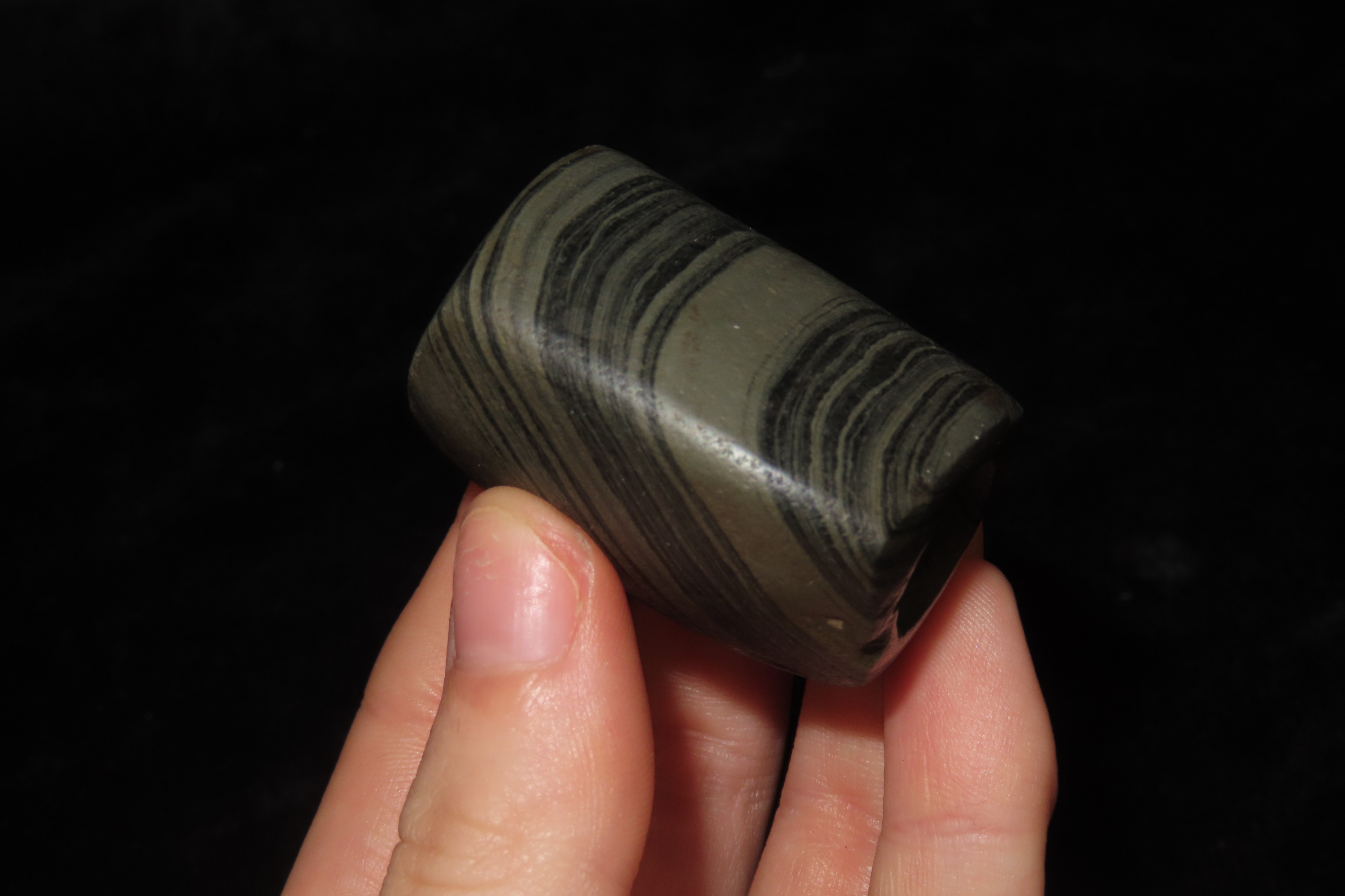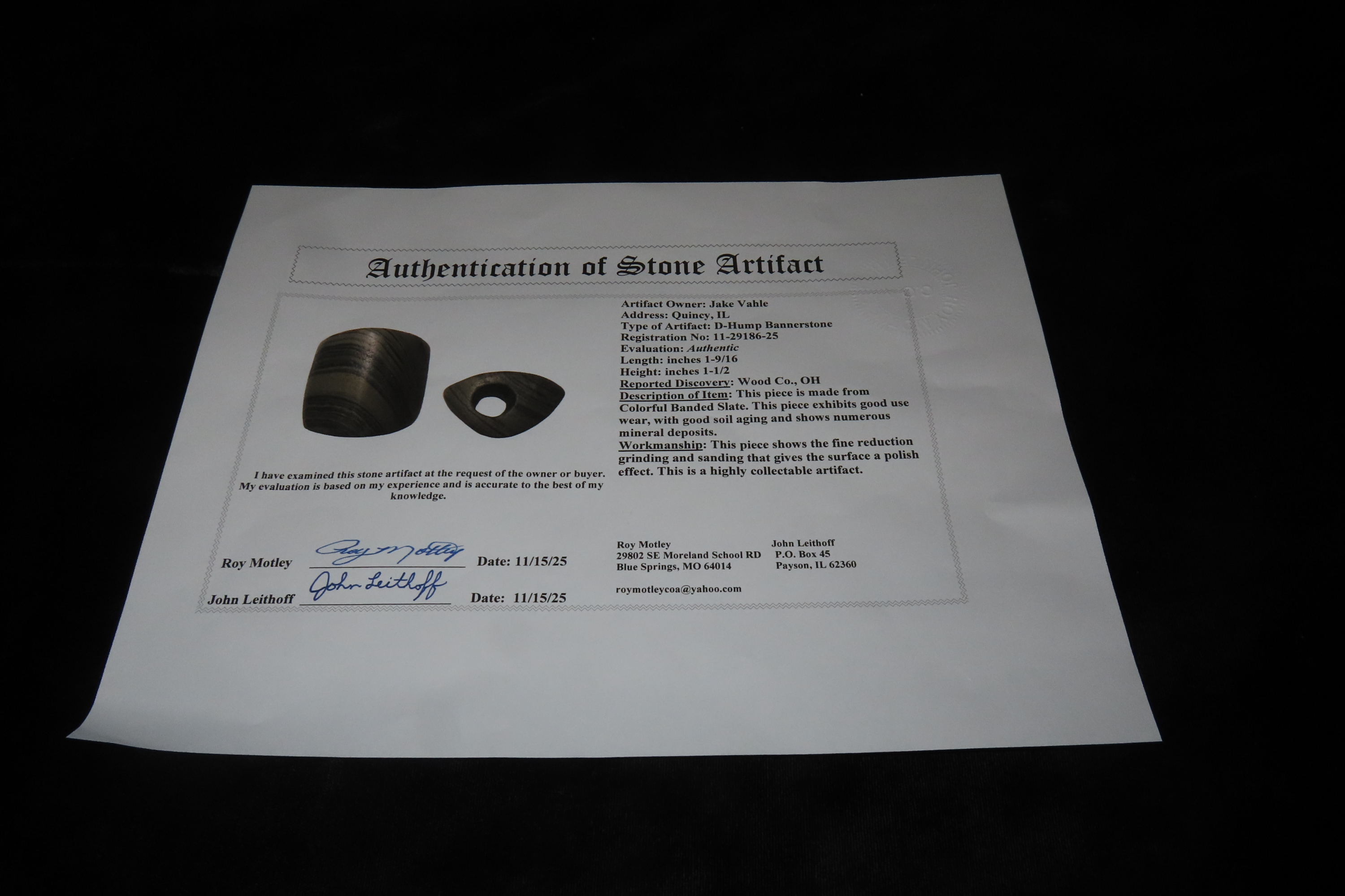 1 9/16″ X 1 1/2″ D-Hump Bannerstone, Motley COA, Found in Wood Co. OH.,