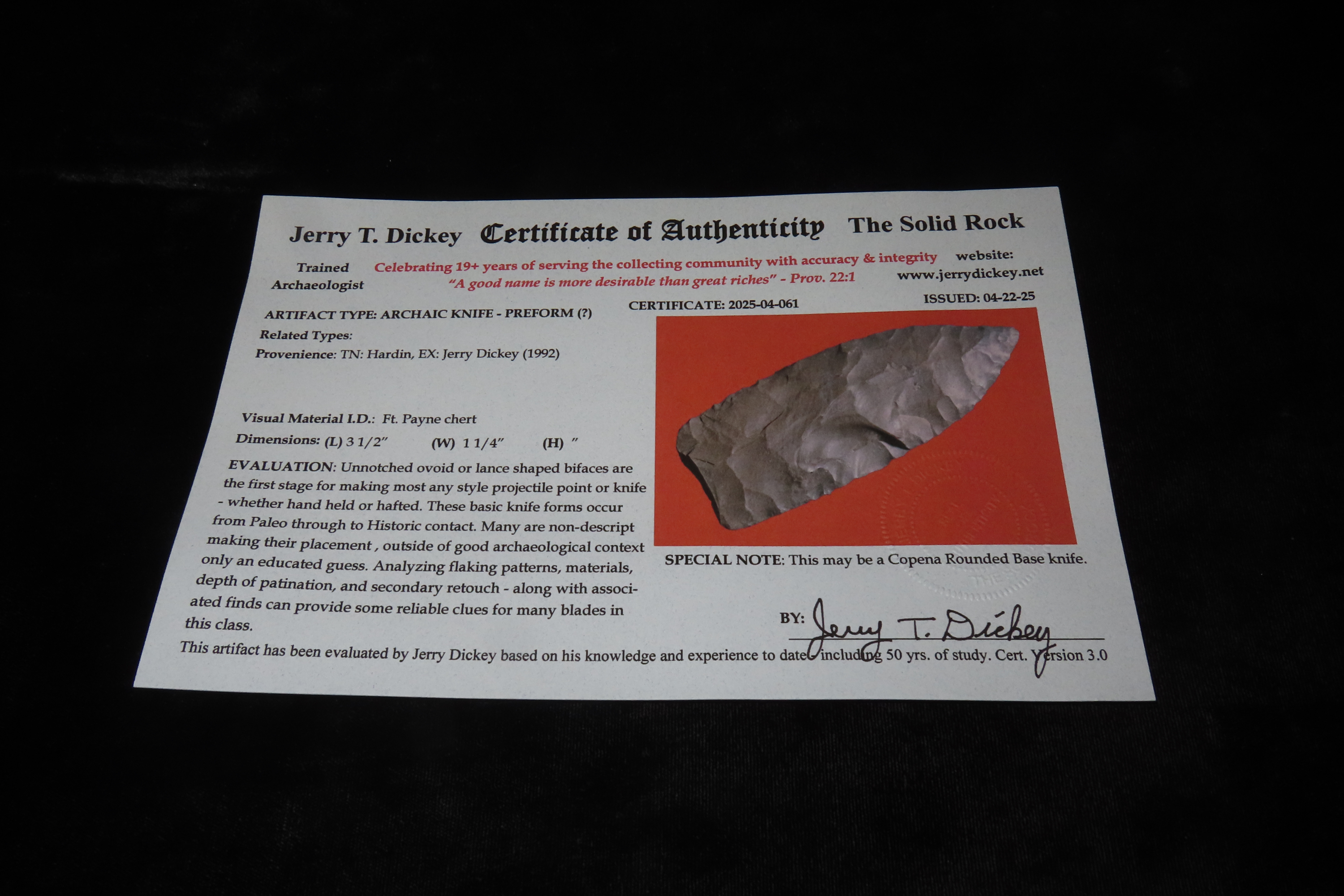 3 1/2″ X 1 1/4″ Archaic Knife, Dickey COA, Found in Hardin Co. TN., Ex Jerry Dickey
