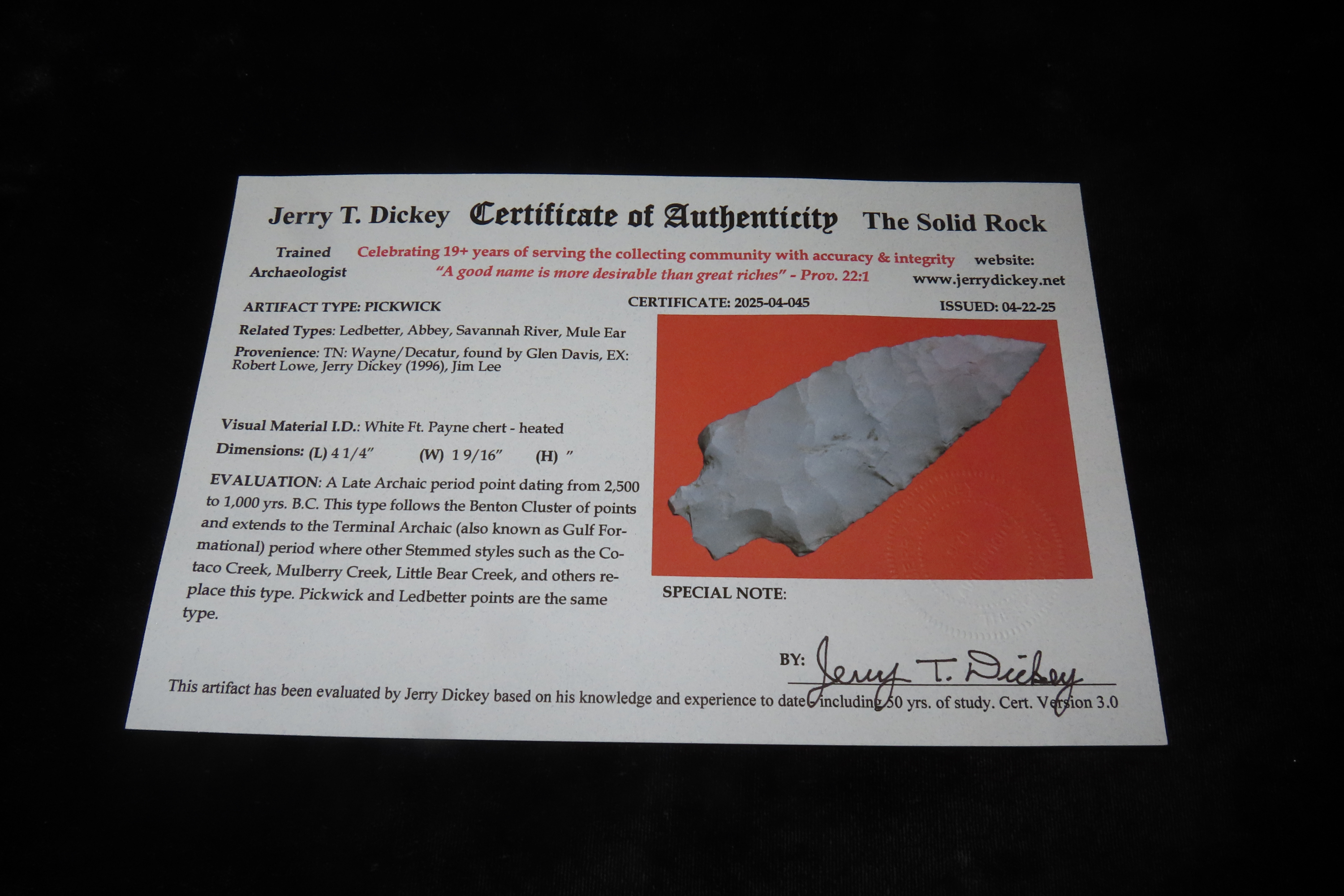 4 1/4″ X 1 9/16″ Pickwick, Dickey COA, Found In Wayne/ Decatur Co. Tn. By Glen Davis, Ex Robert Lowe/ Jerry Dickey/ Jim Lee