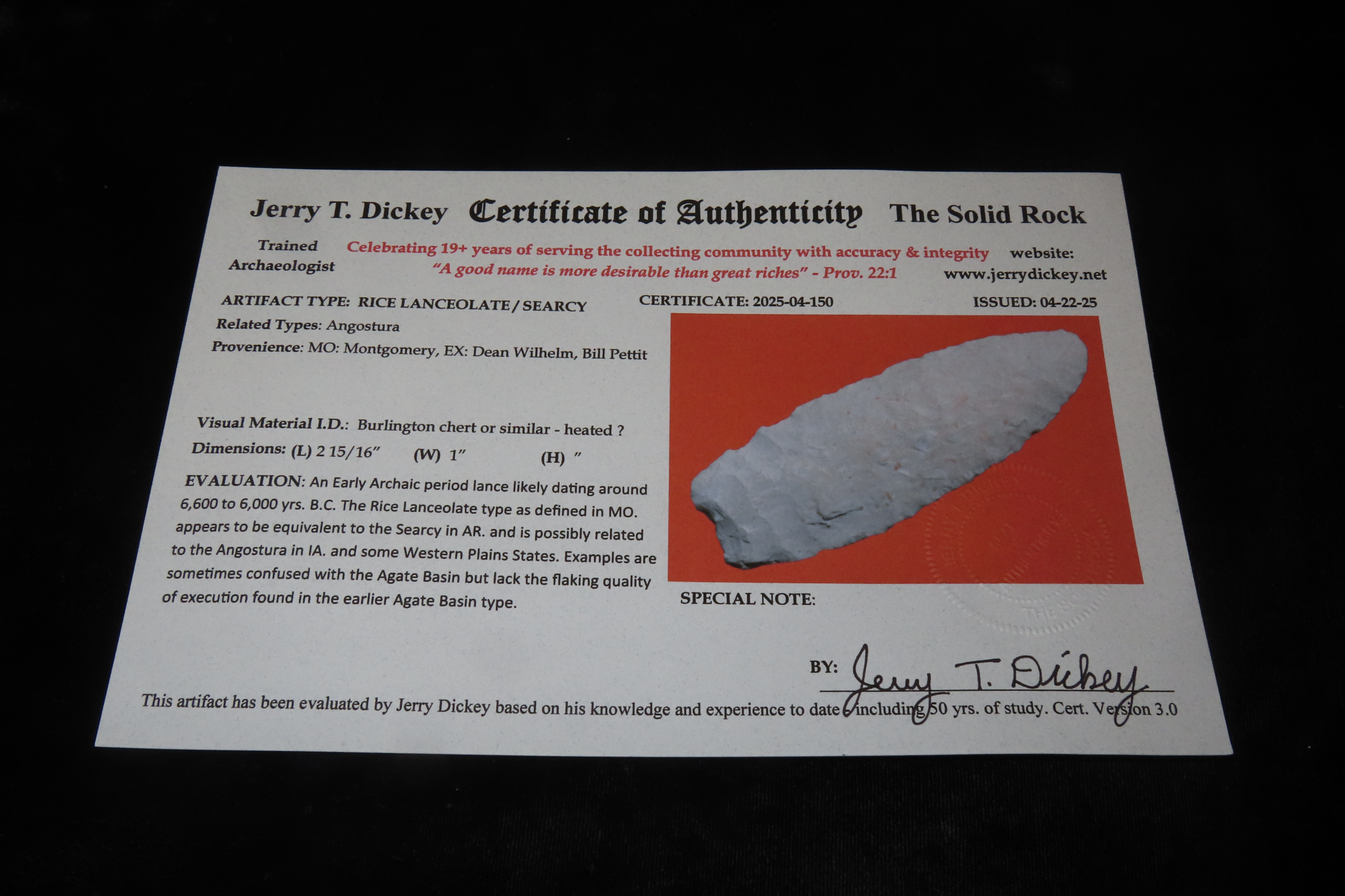 2 15/16" X 1" Rice Lancelot/ Searcy, Dickey COA, Found in Montgomery Co. MO., Ex Dean Wilhelm/ Bill Pettit